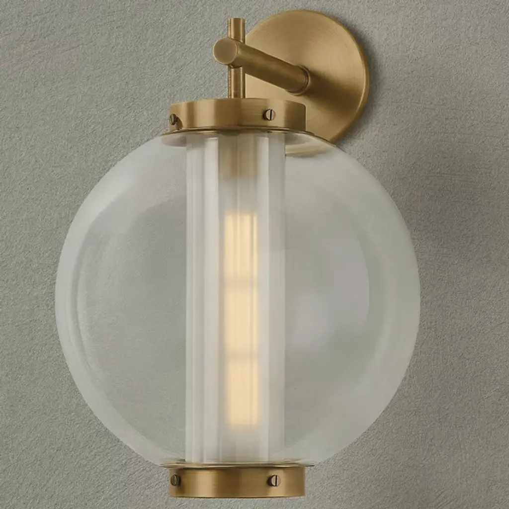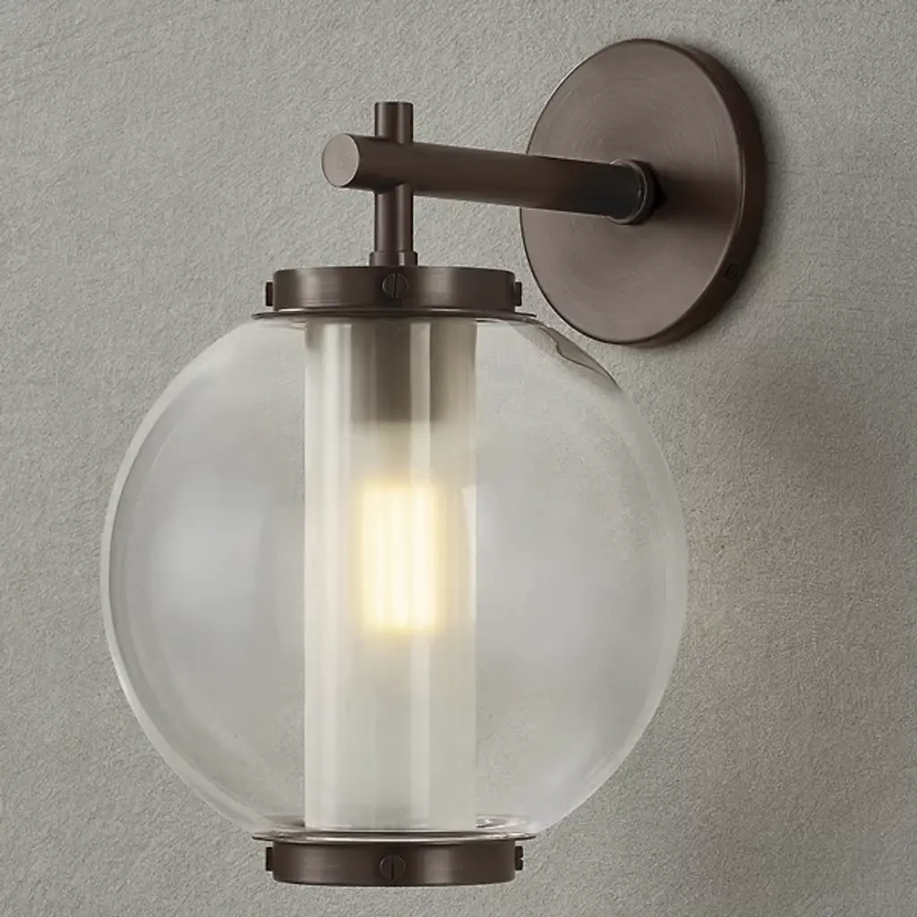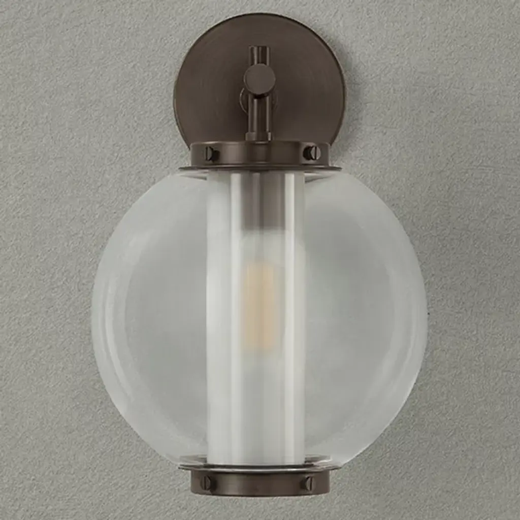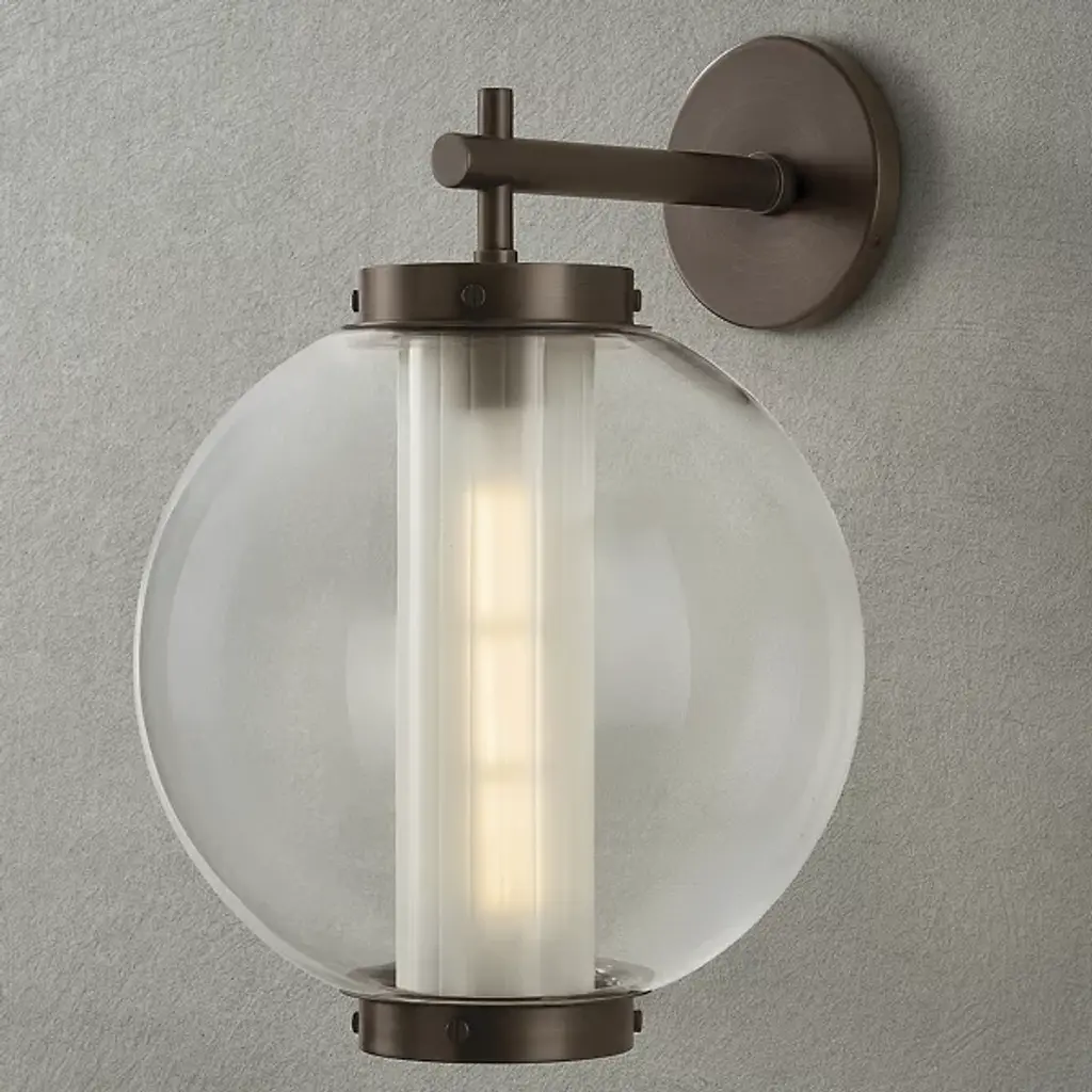 The Marco Outdoor Wall Sconce from Troy Lighting blends modern design with industrial influences for a bold exterior lighting statement. A large clear glass globe is suspended from angular metalwork, creating a lantern-style silhouette with a contemporary edge. Inside, a ribbed glass tube diffuses the light, adding depth and geometric intrigue to the light delivered, offering a refined touch to patios, entryways, and other outdoor spaces while offering all-weather durability.