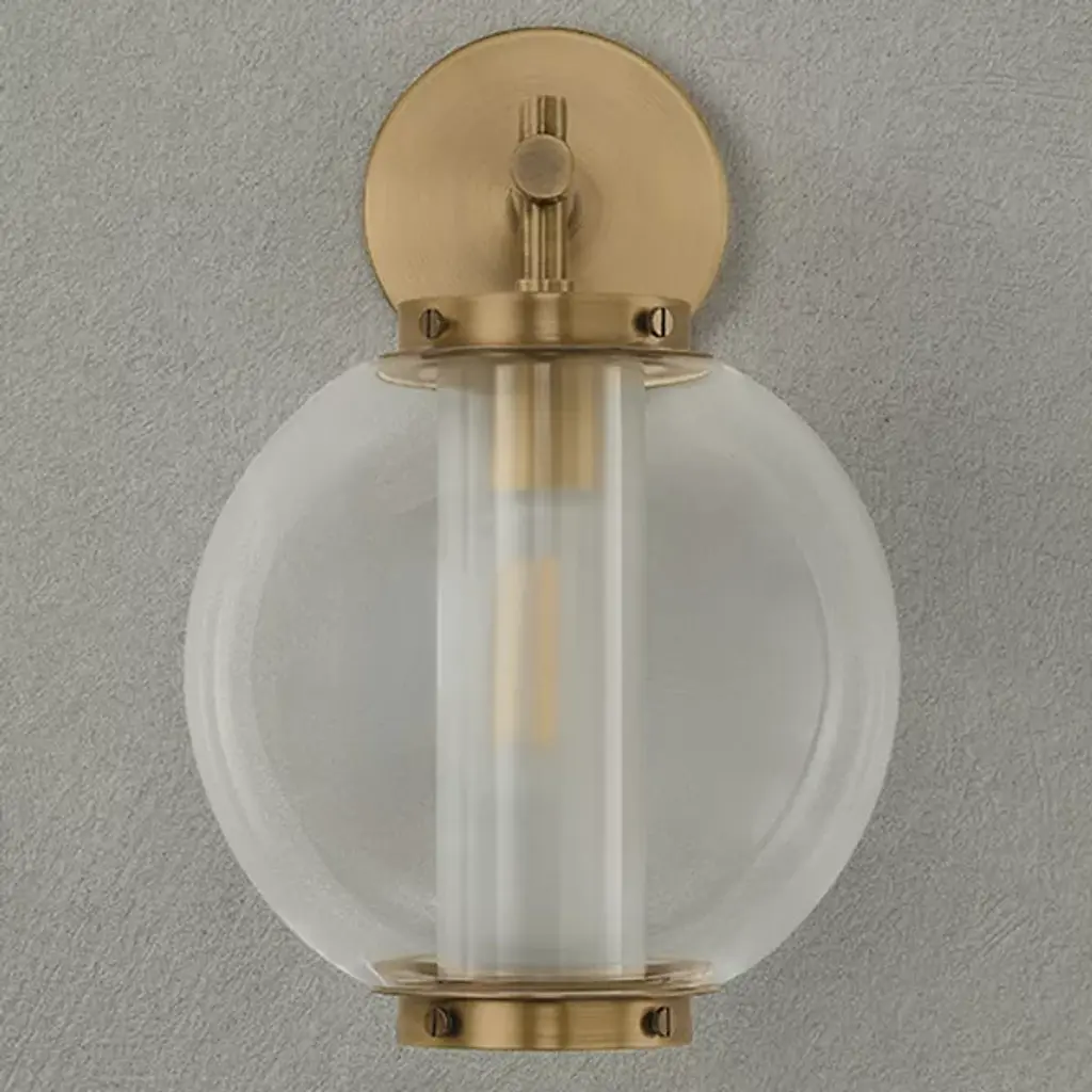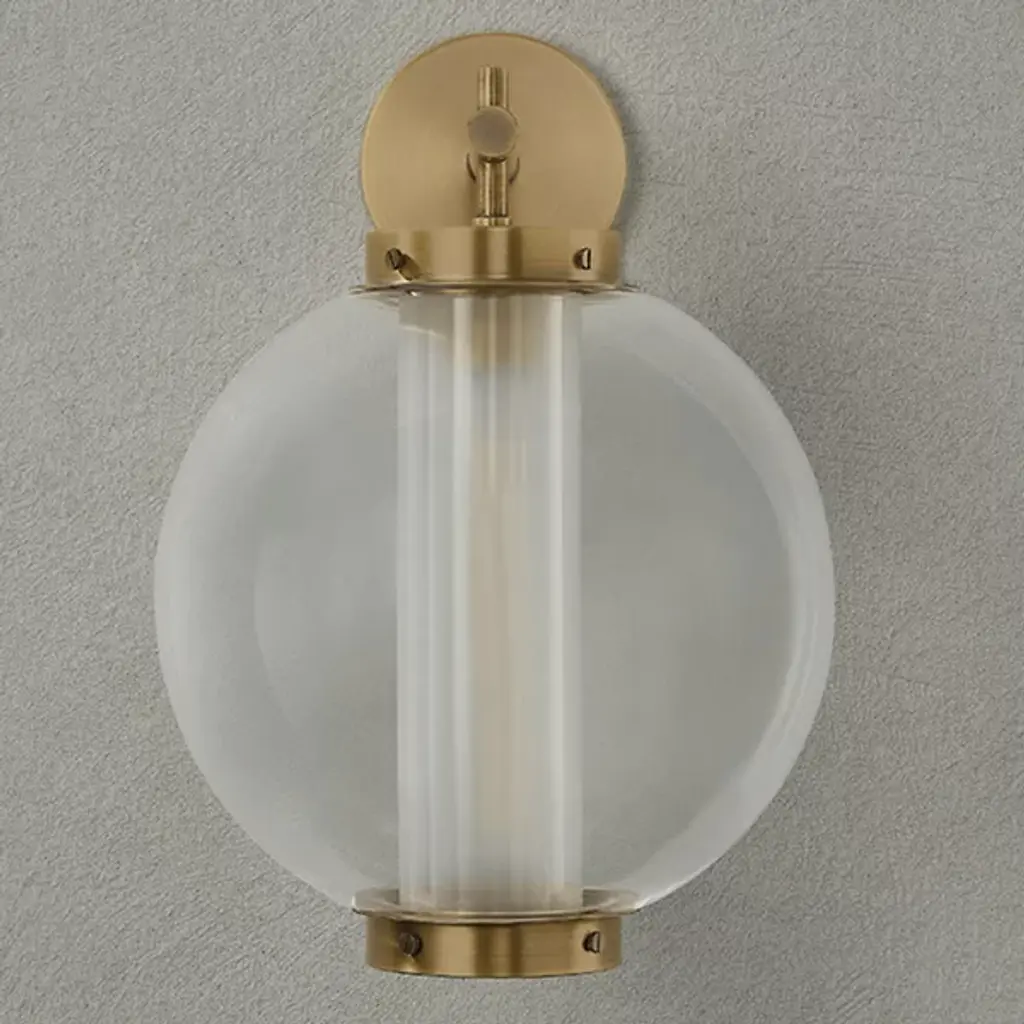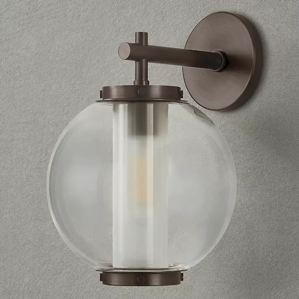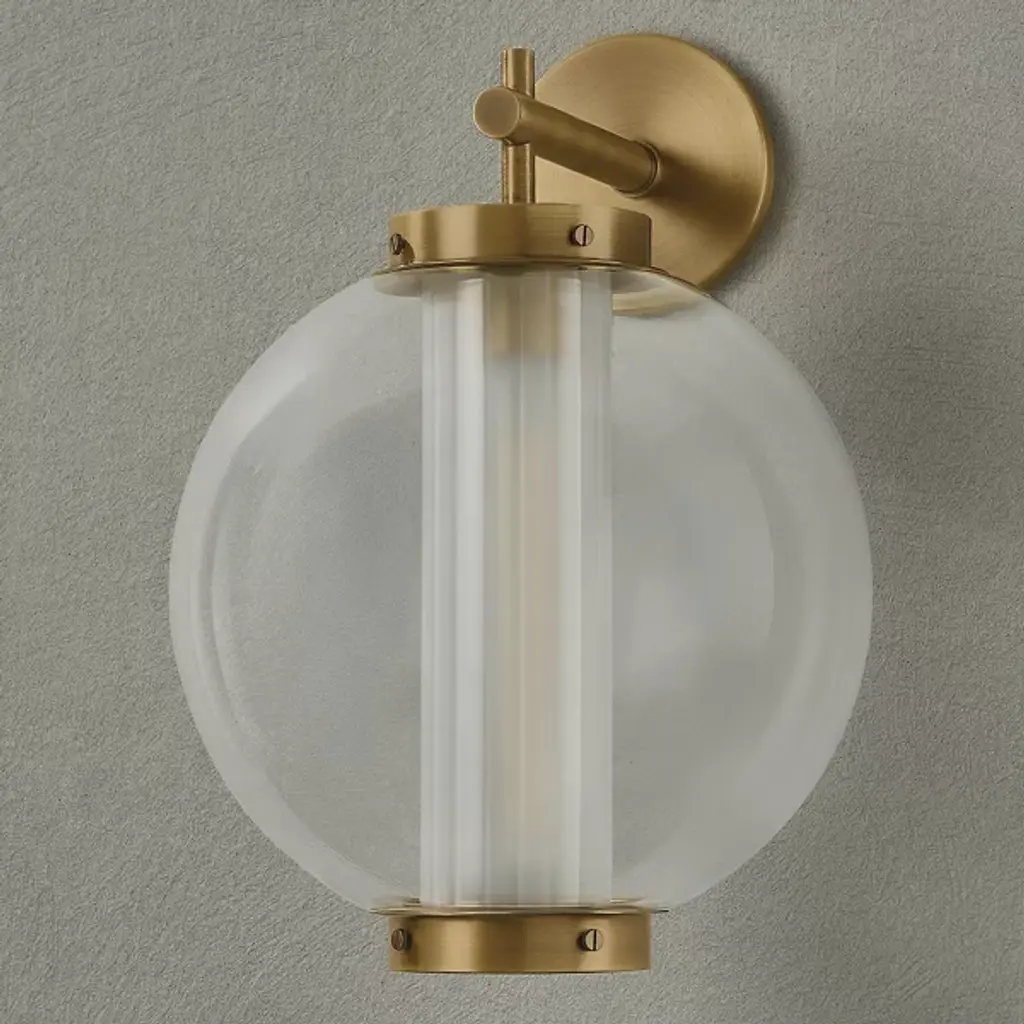 The Marco Outdoor Wall Sconce from Troy Lighting blends modern design with industrial influences for a bold exterior lighting statement. A large clear glass globe is suspended from angular metalwork, creating a lantern-style silhouette with a contemporary edge. Inside, a ribbed glass tube diffuses the light, adding depth and geometric intrigue to the light delivered, offering a refined touch to patios, entryways, and other outdoor spaces while offering all-weather durability.