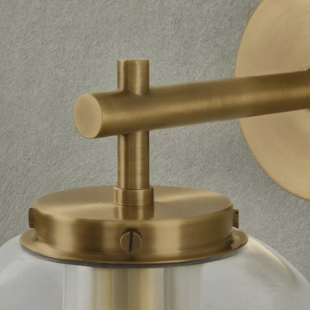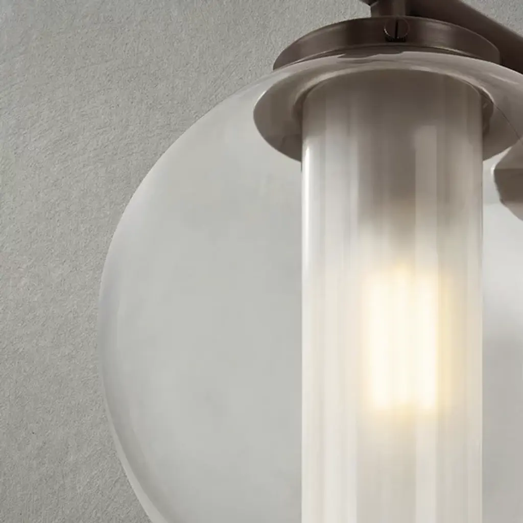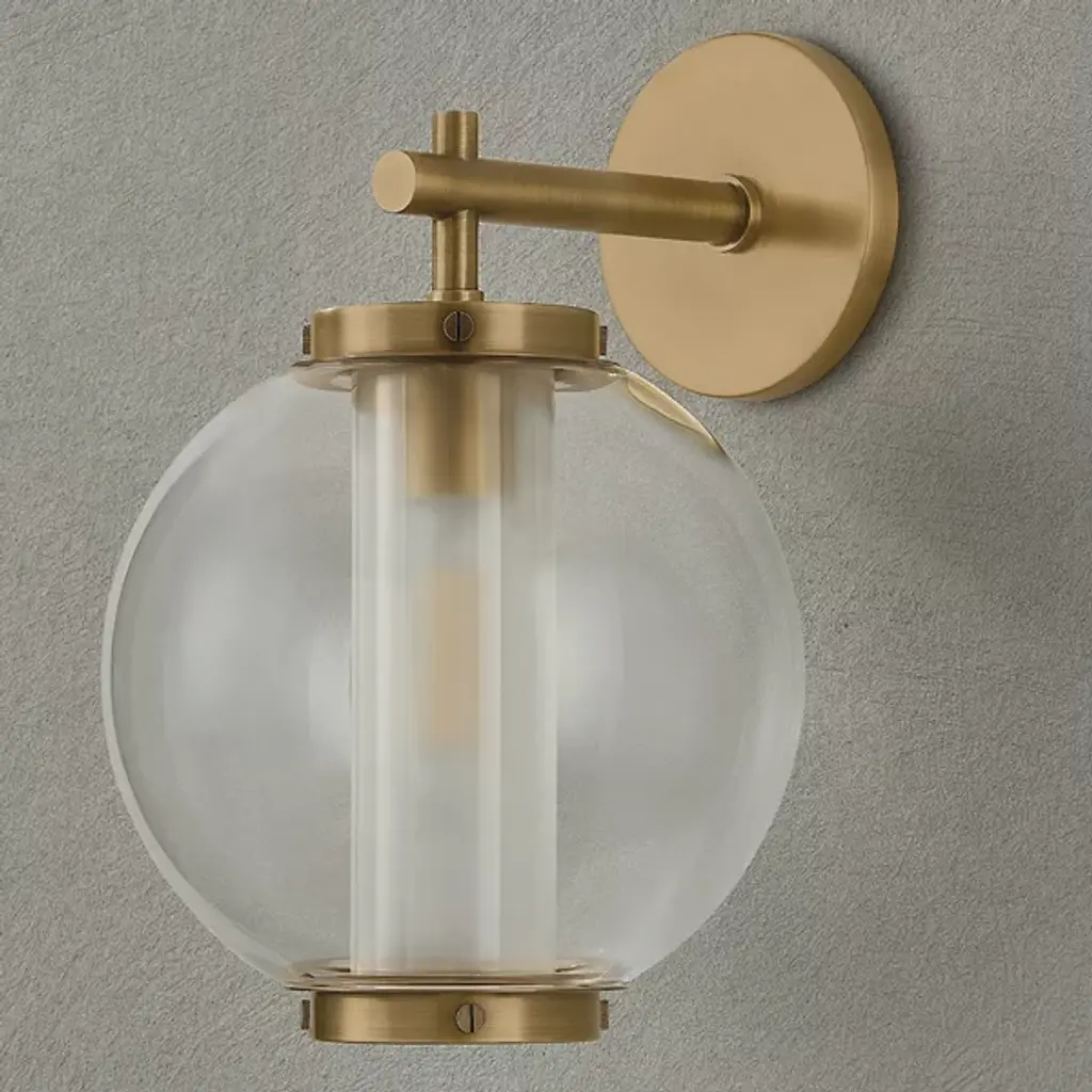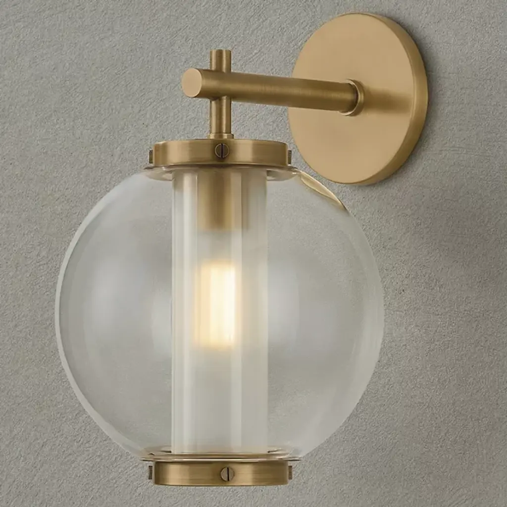 The Marco Outdoor Wall Sconce from Troy Lighting blends modern design with industrial influences for a bold exterior lighting statement. A large clear glass globe is suspended from angular metalwork, creating a lantern-style silhouette with a contemporary edge. Inside, a ribbed glass tube diffuses the light, adding depth and geometric intrigue to the light delivered, offering a refined touch to patios, entryways, and other outdoor spaces while offering all-weather durability.