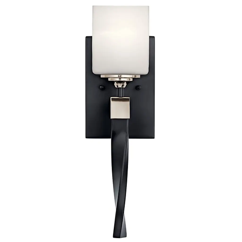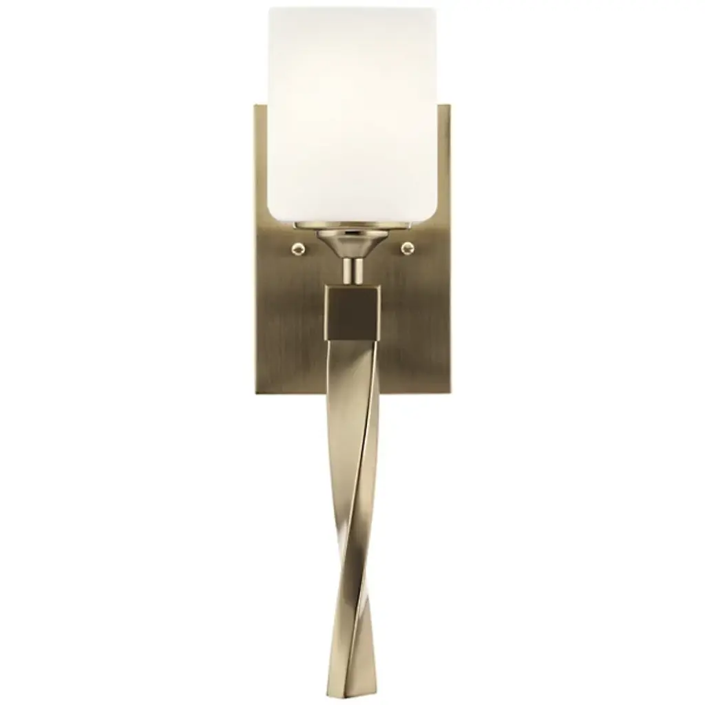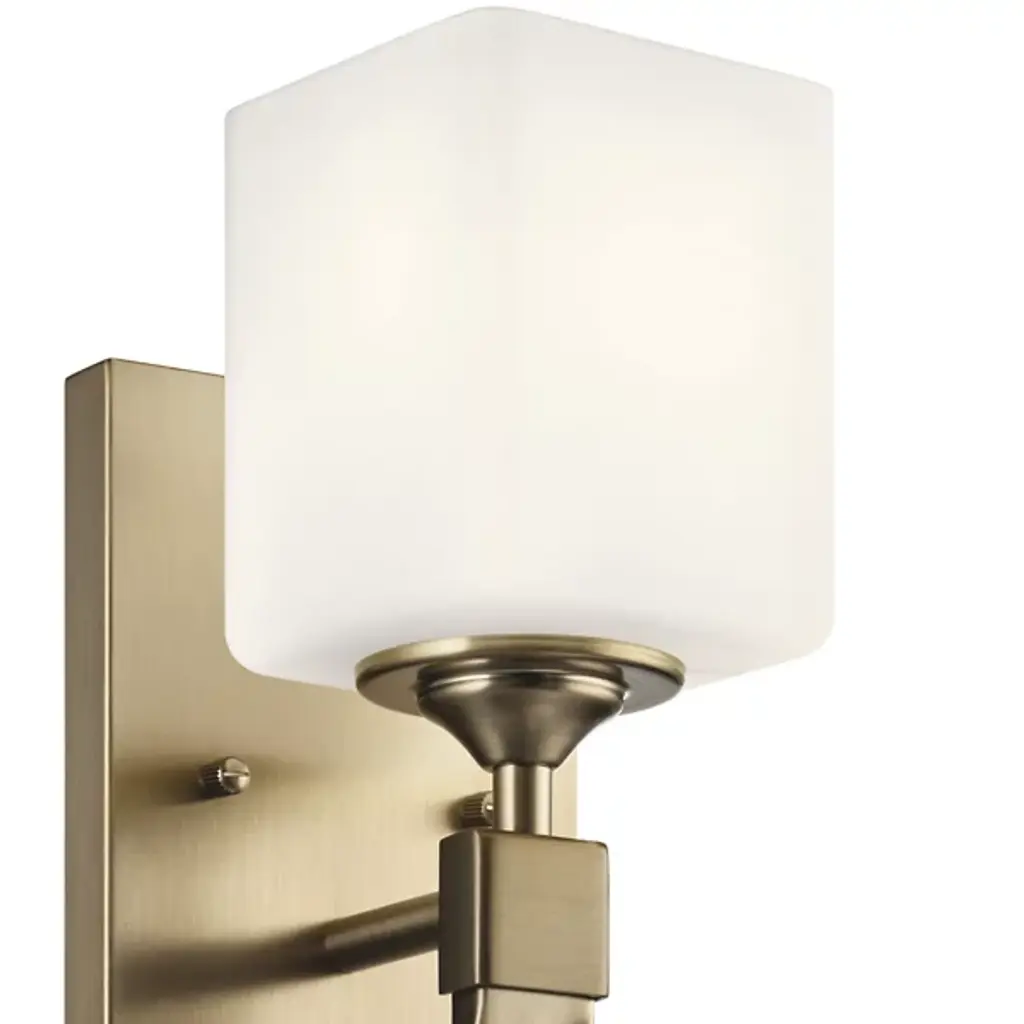 An elegant and adaptable piece with transitional style, the Marette Wall Sconce from Kichler creates a heightened ambiance with gently filtered light. A rectangular metal backplate secures the piece and sends a short stem to its elongated metal lamp base. A satin etched opal glass shade forms a cubed silhouette with rounded edges lending a softness to its aesthetic. Its stem twists gently as it descends, gleaming as its incandescent light reflects over its surface. The Champagne Bronze finish offers a warm, muted brushed gold style and pairs beautifully with coordinating Delta® plumbing fixtures by Delta Faucet.