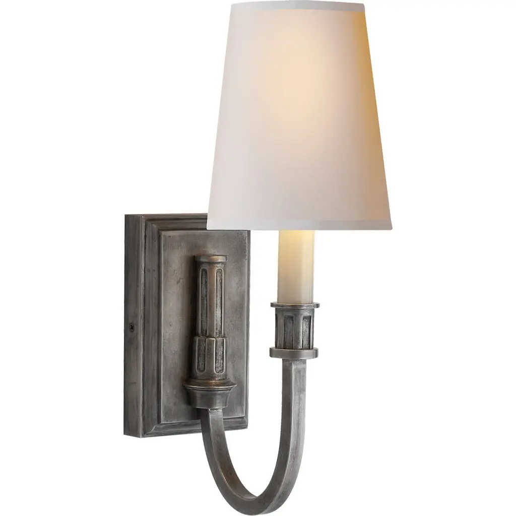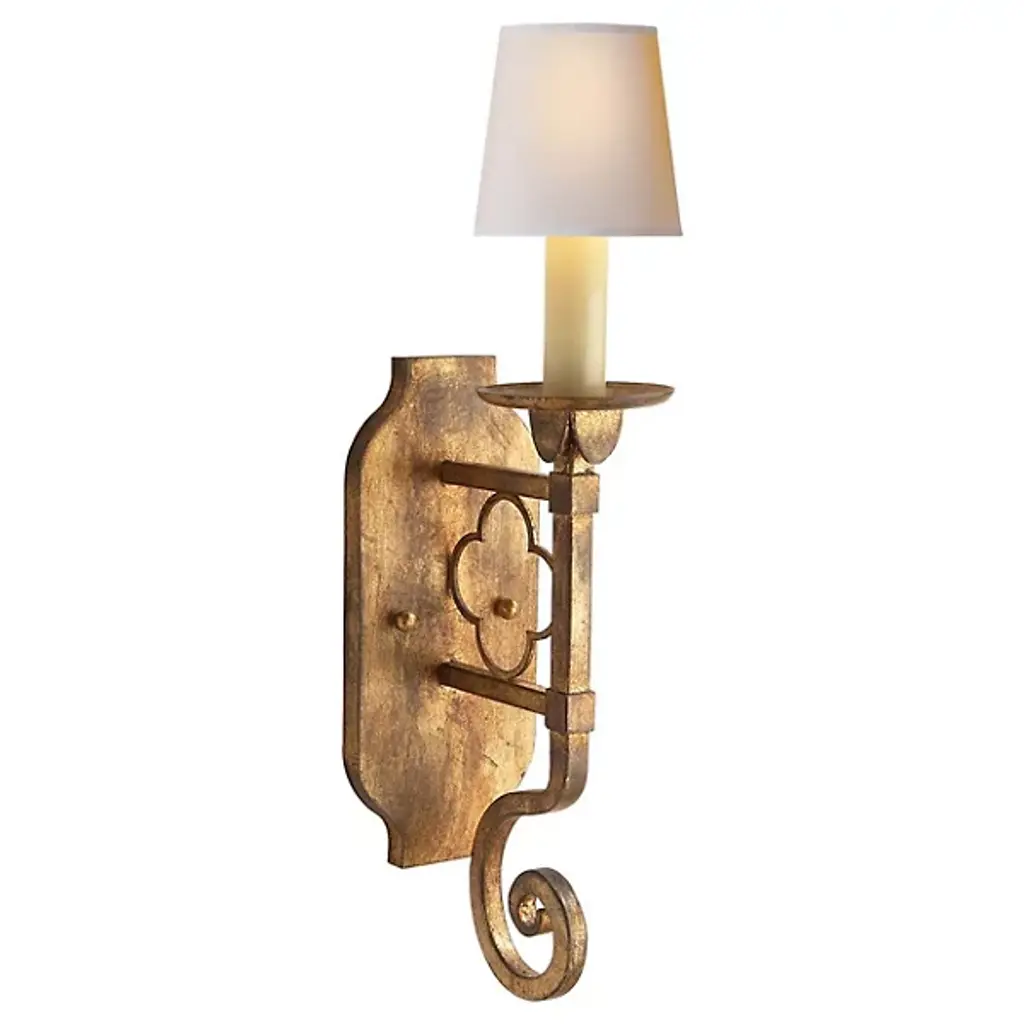 Old-world charm gets a new look with the Margarite Wall Sconce by Visual Comfort Signature, formerly known as Visual Comfort, Expertly crafted of antiqued metal, it has a scrollwork arm and a cutout detail inspired by Moroccan tile patterns to effortlessly mix with transitional interiors and furnishings. This light fixture is stand-alone décor but makes twice the impact when two are put up to flank a mirror, framed art or a headboard.