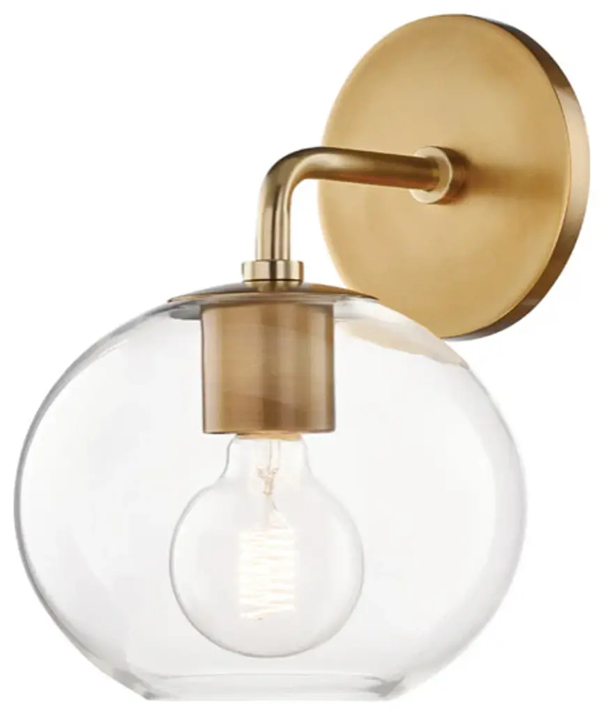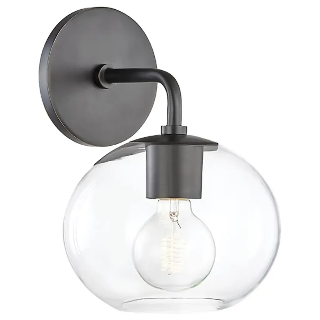 A strong approach for accenting key architectural qualities in the home. The Margot Wall Sconce by Mitzi is inspired by an elevated industrial look that is designed for the transitional room. It’s framed using custom Handworked Metal with a simple bent arm design and round backplate. That understated frame displays a single bulb design with a clear Glass outer shade housing that is simple and understated in effect. It’s a piece with a gentle storytelling quality, one that is ideal for a variety of hard-to-light spaces like bath areas, vanity tables, bedsides, covered outdoor areas and more.