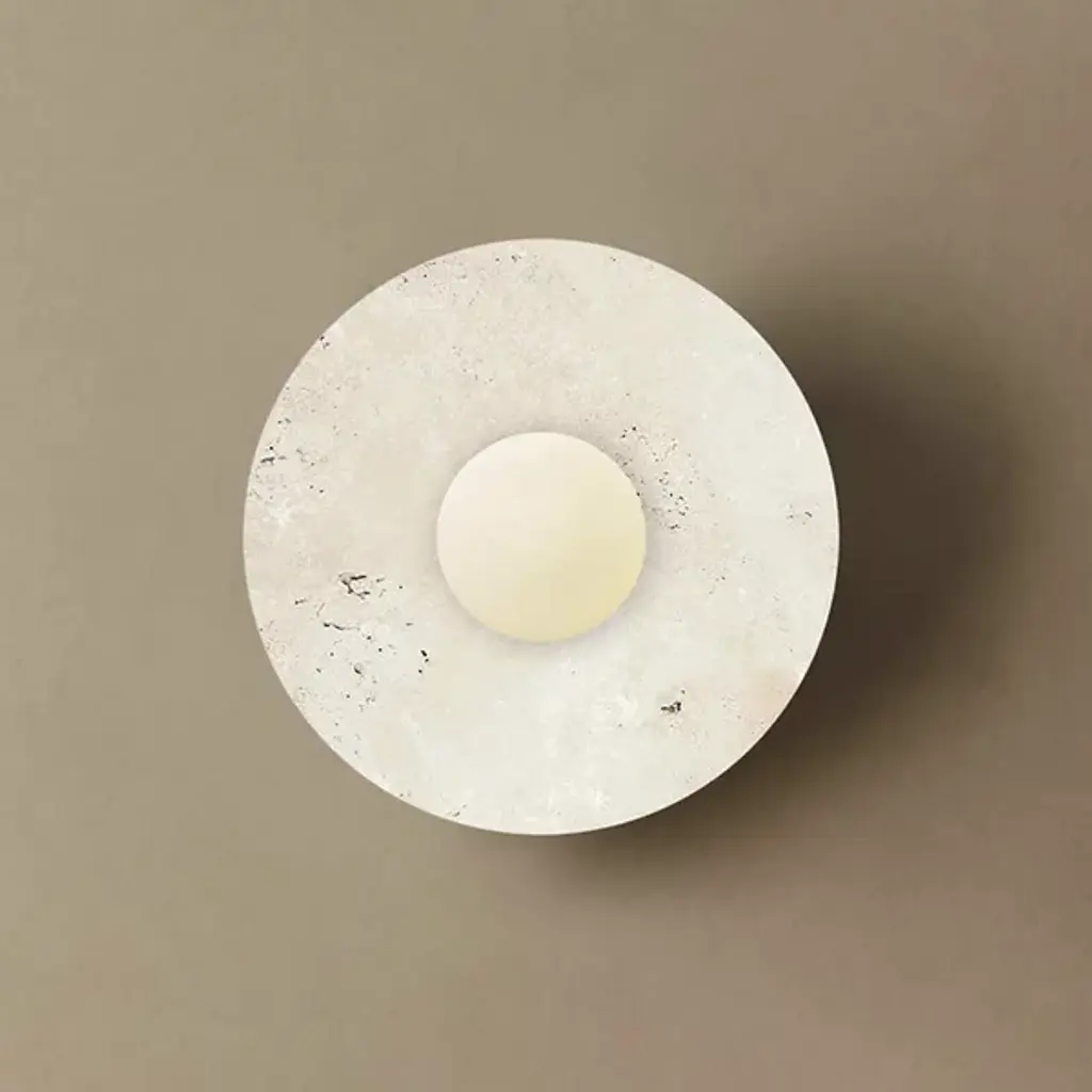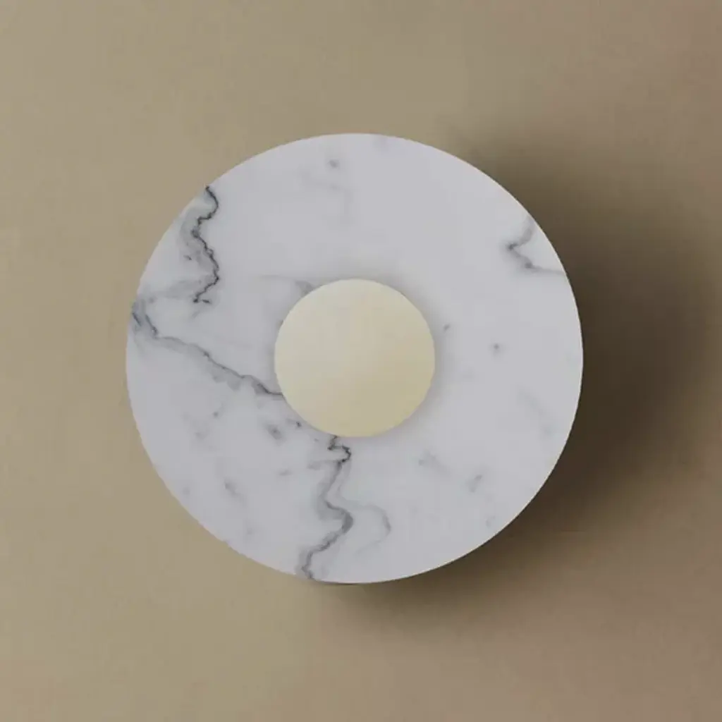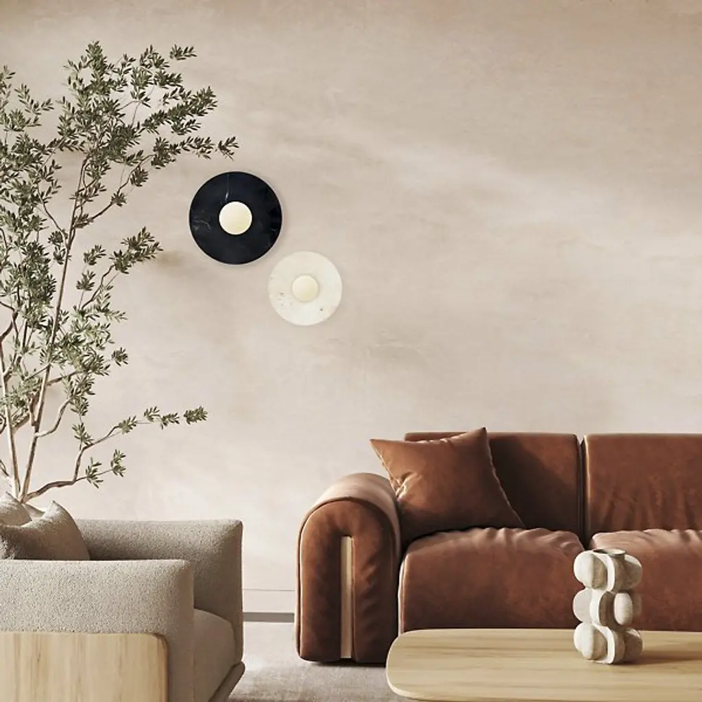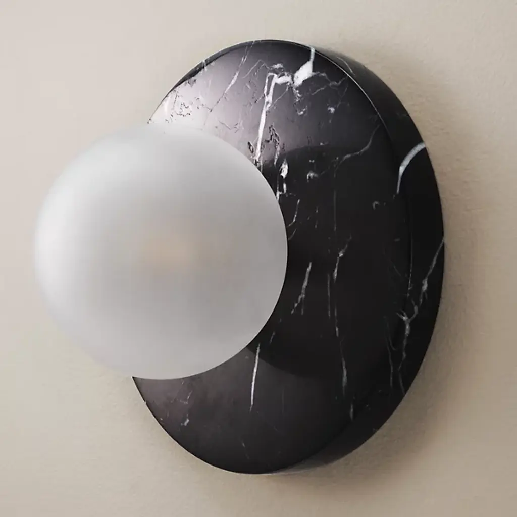 The Maria Wall Sconce from Dounia Home brings artisanal charm and welcome warmth to indoor walls. Handcrafted in Morocco, this sconce pairs a smooth circular marble wall plate with a glass globe that houses damp-rated lamping. The natural veining of the marble creates a unique natural character, while the glass shade diffuses light outward softly, casting an eloquent, even glow across walls. Rich materials made using thoughtful craftsmanship show off the fixture's inspired refinement.