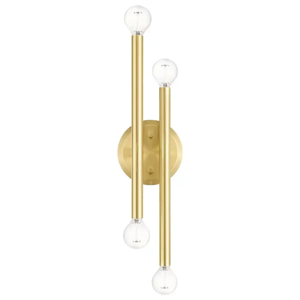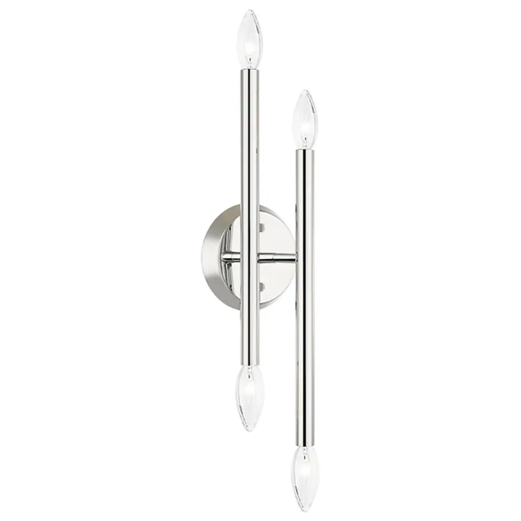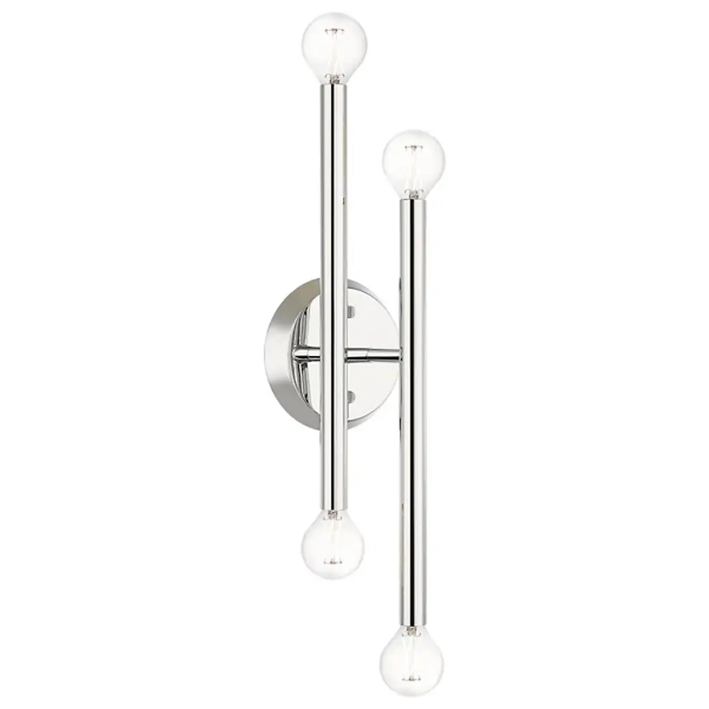 An encompassing wash of bright light highlights the simple, modern design of the Mariann Wall Sconce from Alder & Ore. A simple fixture that plays well with both modern and contemporary décor, it starts with a beveled disc-shaped wall mount that extends two short, horizontal rods to secure step-staggered vertical light housings across it. Damp-listed and ADA compliant lamping emerges from each end of the housing, casting a generous glow across the fixture’s surroundings while glittering off the sleek metal structure.