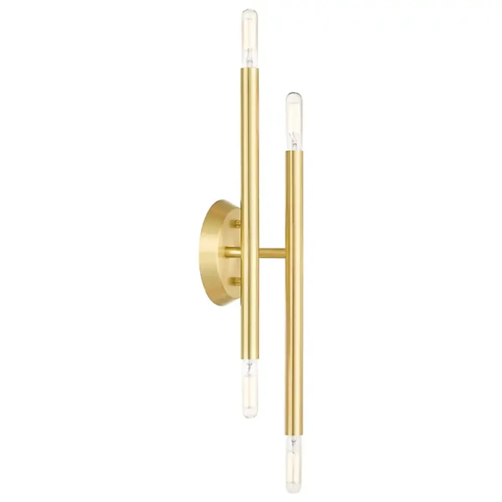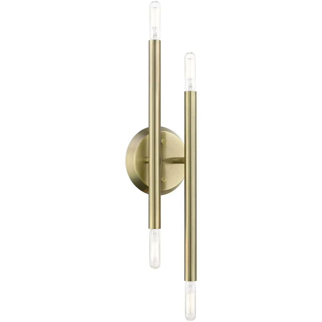 An encompassing wash of bright light highlights the simple, modern design of the Mariann Wall Sconce from Alder & Ore. A simple fixture that plays well with both modern and contemporary décor, it starts with a beveled disc-shaped wall mount that extends two short, horizontal rods to secure step-staggered vertical light housings across it. Damp-listed and ADA compliant lamping emerges from each end of the housing, casting a generous glow across the fixture’s surroundings while glittering off the sleek metal structure.