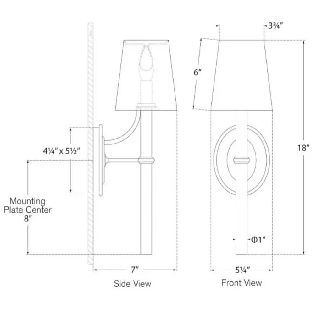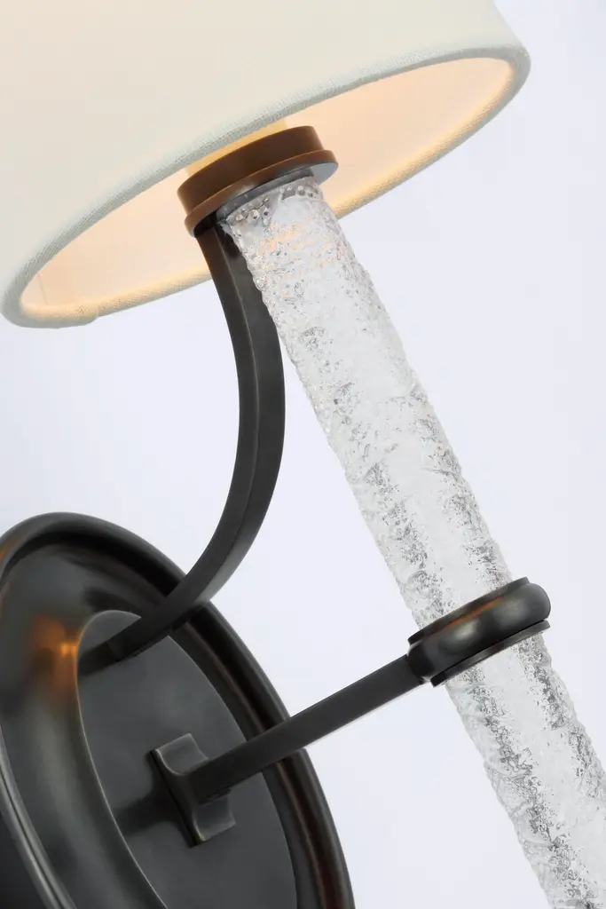 Abigail Large Sconce in Bronze and Clear Wavy Glass with Linen Shade Designer: Marie Flanigan Height: 18" Extension: 7" Backplate: 4.25" x 5.5" Oval Mounting: Hardwire Shade Detail: 3.75" x 5.25" x 6" Linen Socket: E12 Candelabra Wattage: 6.5 LED B11 Safety Rating Location: DAMP