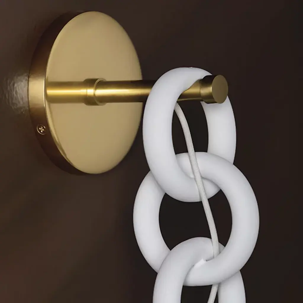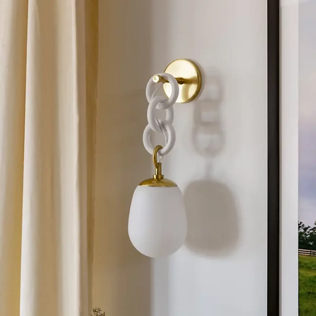 Inspired by dangling earrings, the Marina Wall Sconce from Mitzi- Hudson Valley Lighting produces a radiant focal point and elegant chain suspension that bedazzles the home. Designed by Eny Lee Parker, this chic statement delights in both the modern and contemporary space. It features contrasting finishes that evoke mid-century designs. Mounting with a compact backplate, a chain of thick circular links drops down to create a dramatic silhouette. Hanging with a gorgeous lamp holder, a glass shade seduces with its organic curves. Warm light glazes the curves and flows out as a drop of ambiance.