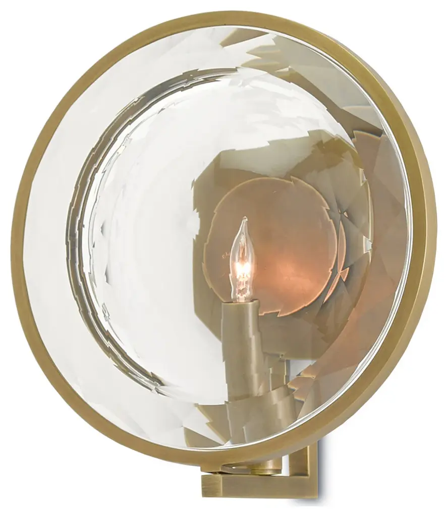 With concentric circles of faceted glass and framed by Brass Steel, the MarjieScope Wall Sconce is perfect as an accent or focal point of a room. Light shines through the glass pane and creates a warm glow off its Antique Brass finish. It is certified for a damp location. The Marjorie Skouras Collection.UL Approved: YesHardwire or Convertible: HardwireNumber of Bulbs Used: 1Total Watts: 60Bulbs Included: No