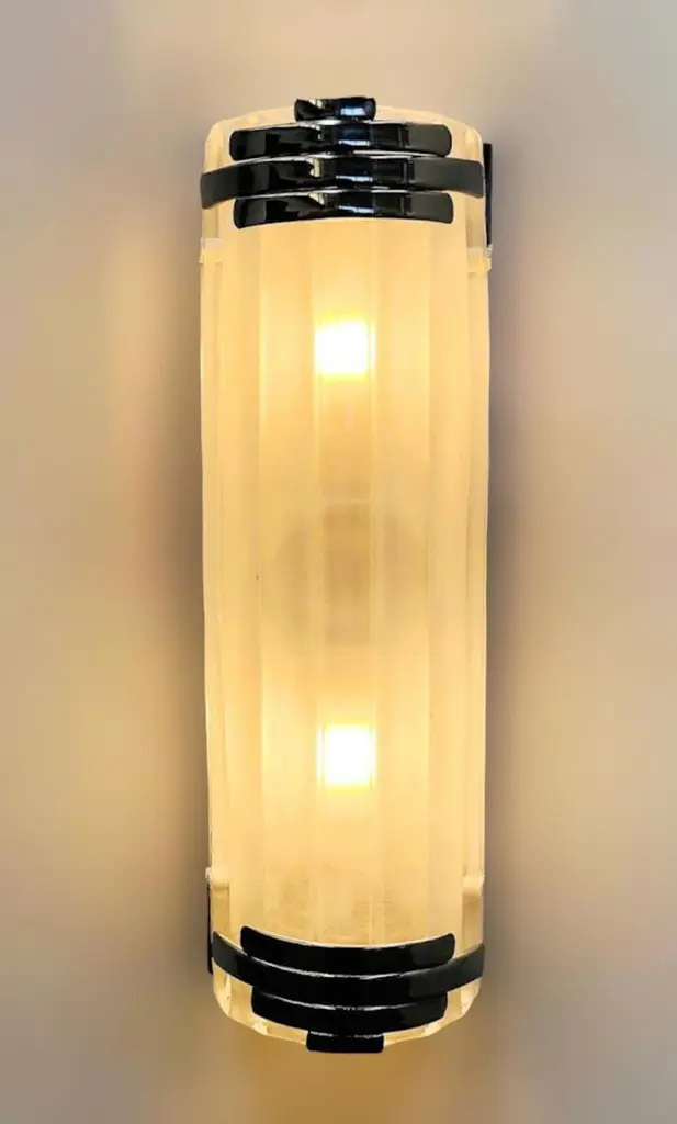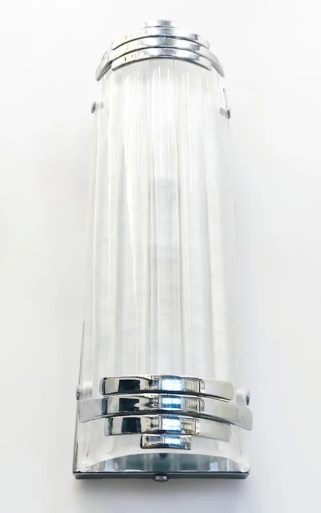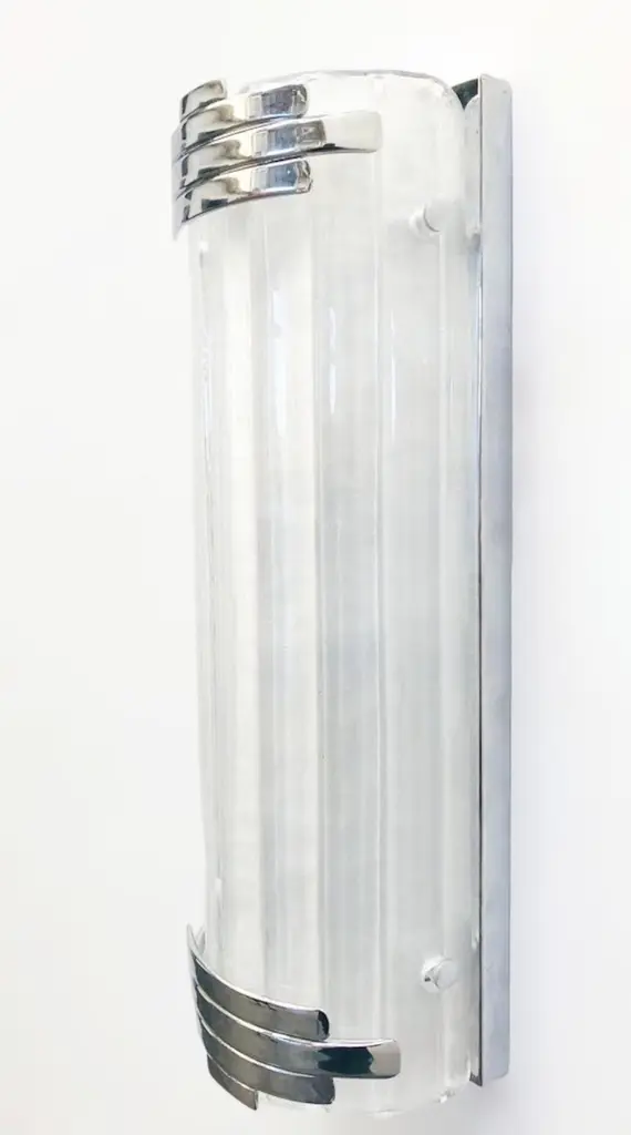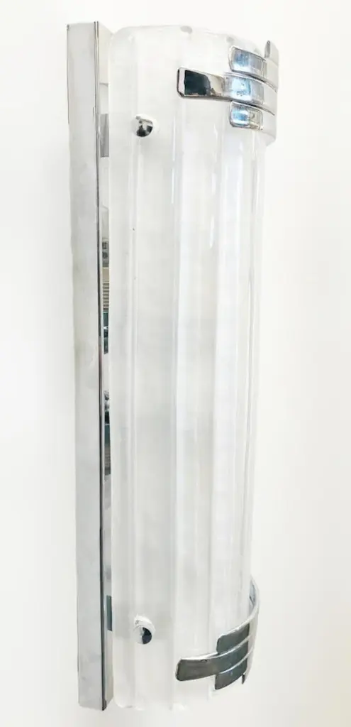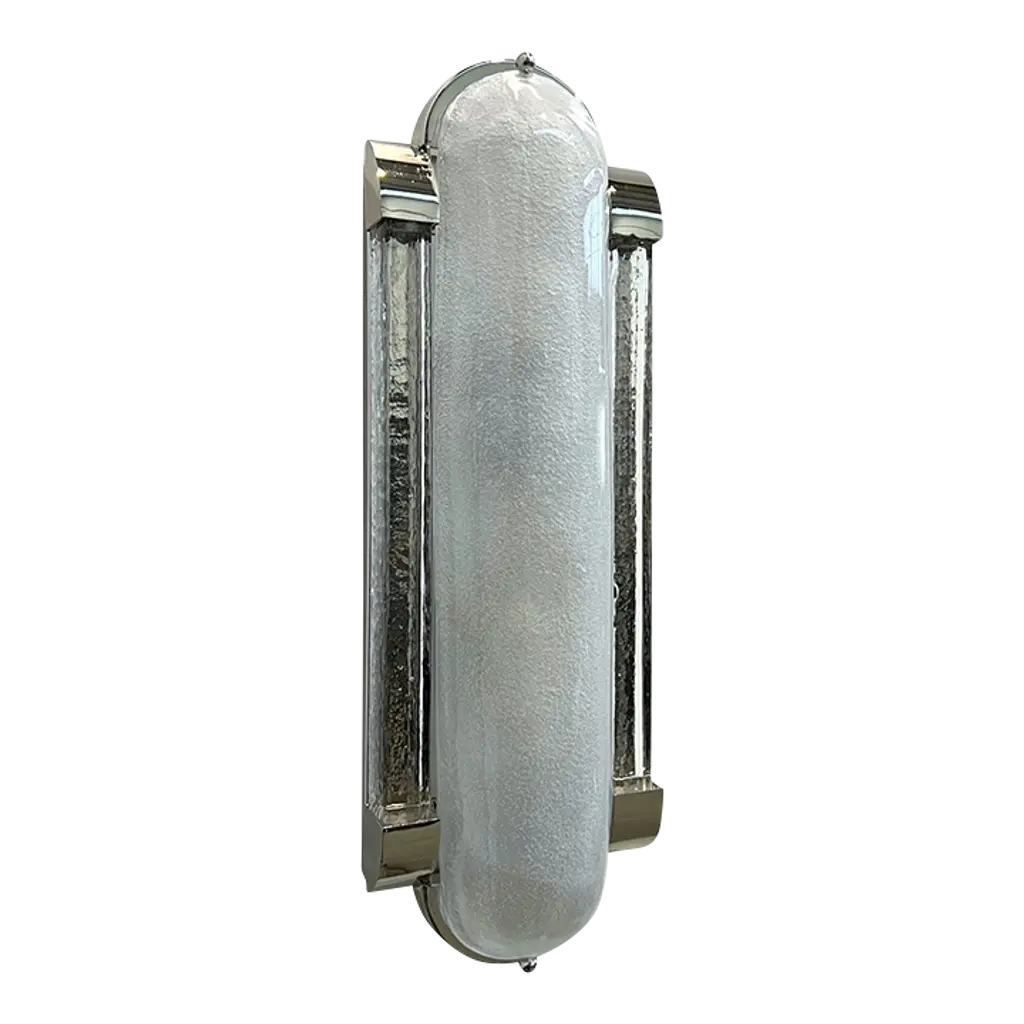 Italian wall light or flushmount with clear frosted Murano glass, mounted on polished chrome frame / Designed by Fabio Bergomi for Fabio Ltd / Made in Italy2 lights / G9 type / max 40W each / IP 44 ratedMeasures: Height 18 inches / width 5 inches / depth 4 inchesOrder Only / This item ships from Italy.