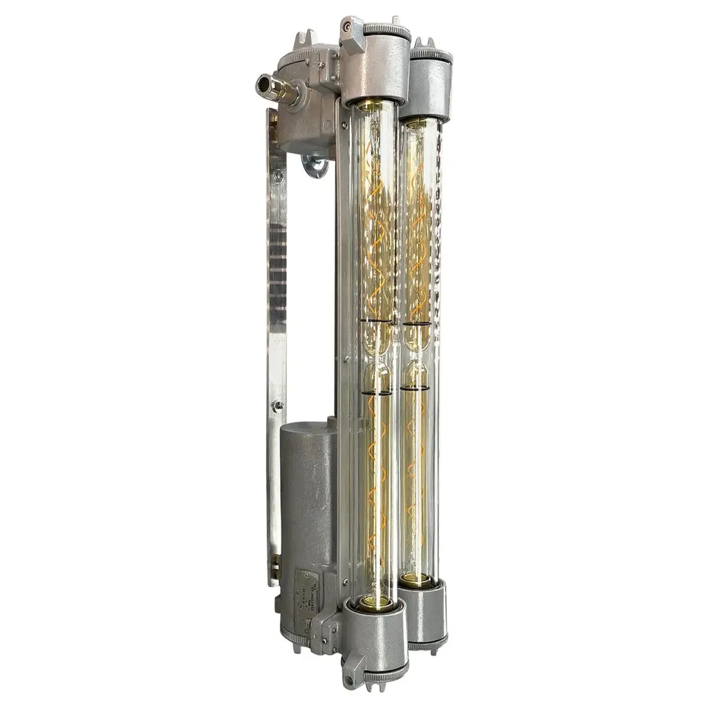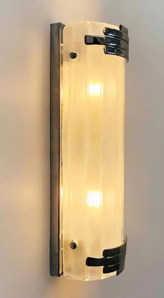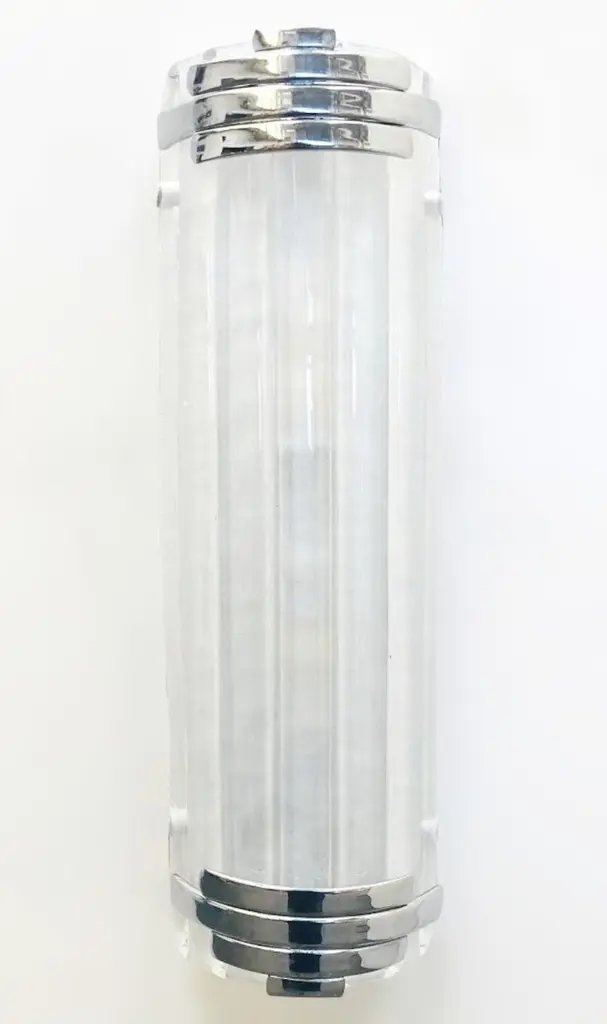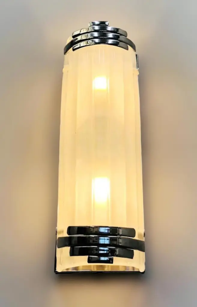 Italian wall light or flushmount with clear frosted Murano glass, mounted on polished chrome frame / Designed by Fabio Bergomi for Fabio Ltd / Made in Italy2 lights / G9 type / max 40W each / IP 44 ratedMeasures: Height 18 inches / width 5 inches / depth 4 inchesOrder Only / This item ships from Italy.