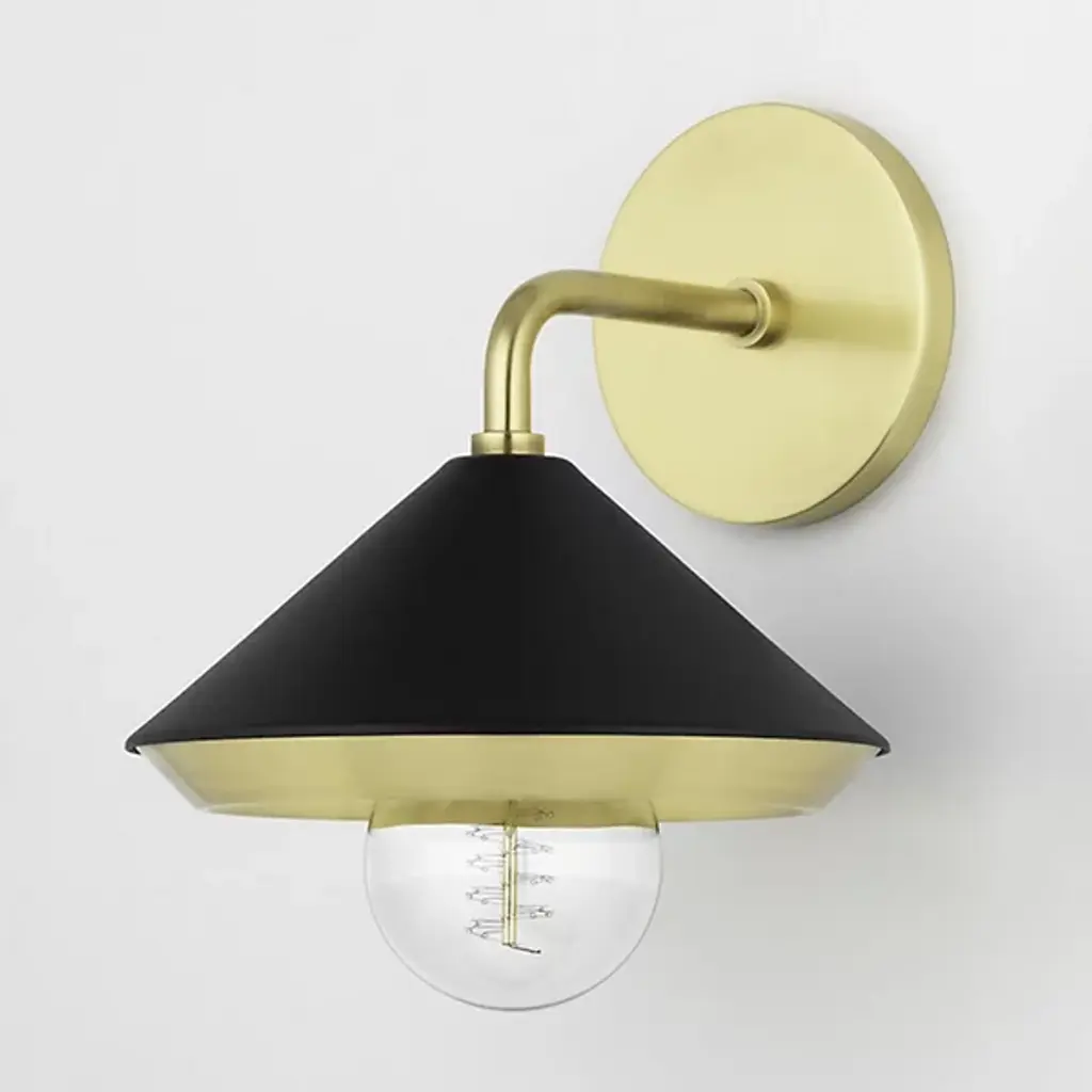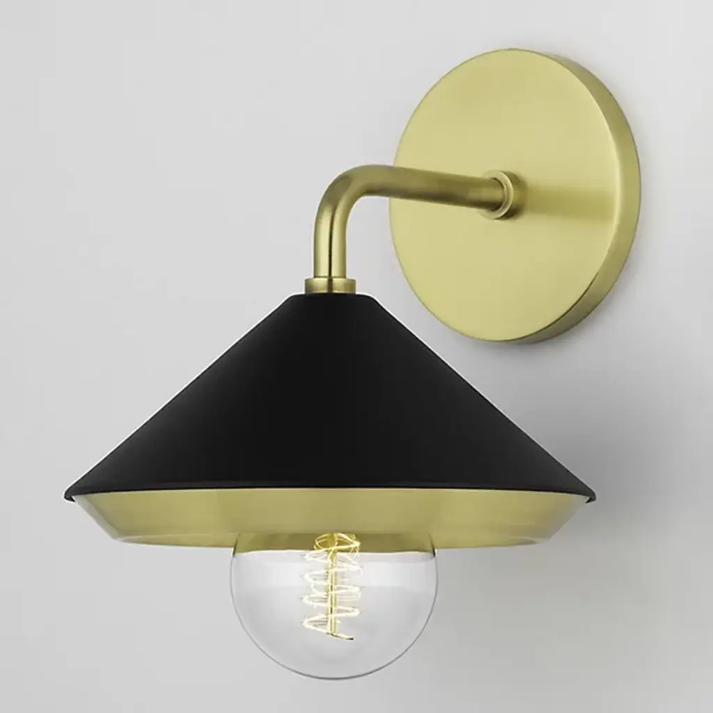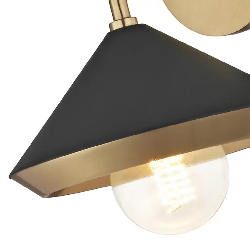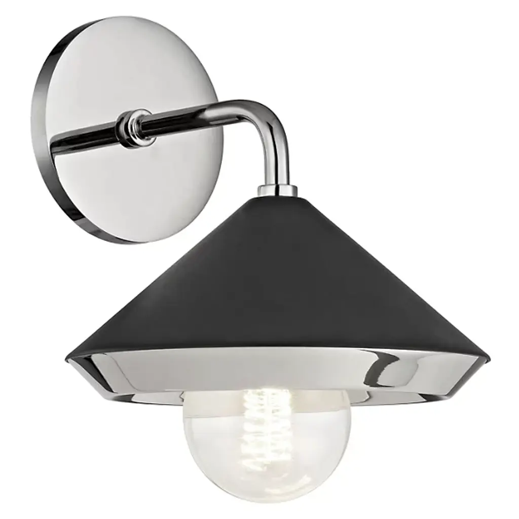 The Marnie Wall Sconce by Mitzi makes a statement in spaces big and small. A sophisticated 2-tone design, it features a Metal hood shade with Black or White accents. Under the hood, a globe lamp provides a downward illumination in a kitchen eating nook or flanking a fireplace.