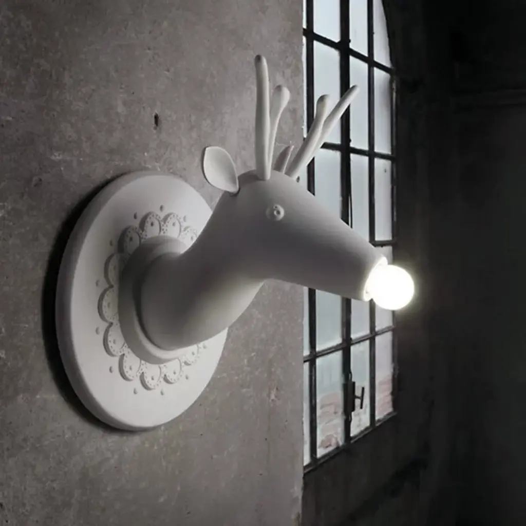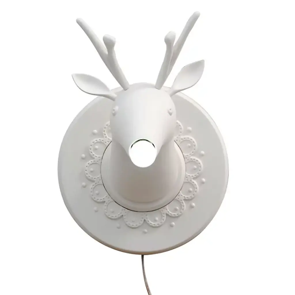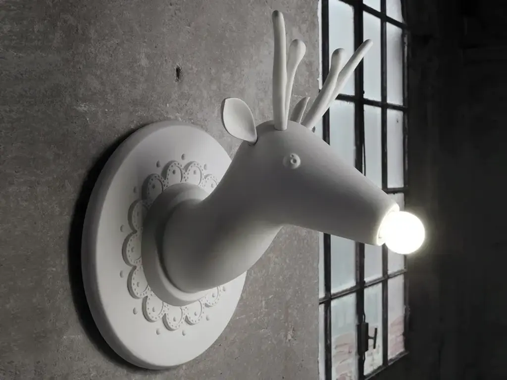 A smile-inducing piece designed with a wealth of childhood memories in mind. Designed by Matteo Ugolini, the Marnin Wall Sconce from Karman greets you with a playful presence at any time of day. For Ugolini, the past and nature are intertwined. This piece conjures emotions as it captures a childlike wonder that highlights the majestic reindeer. With playful presentation, the piece rests against the wall in an ornamented backplate. The ceramic Marnin looks forward with curious eyes, majestic antlers, and a delightful nose. Light radiating from the nose creates a magical image that leaves an impression. The light creates a clean, enhanced ambiance.