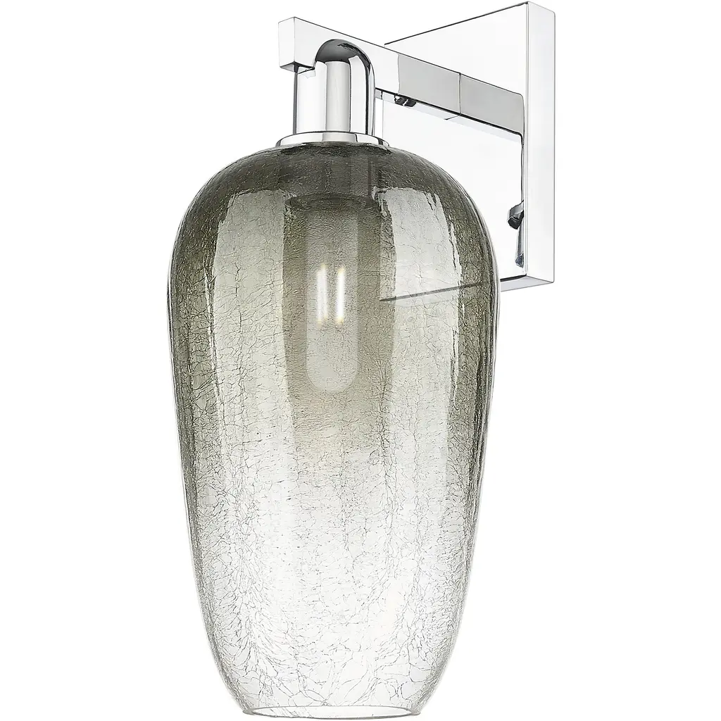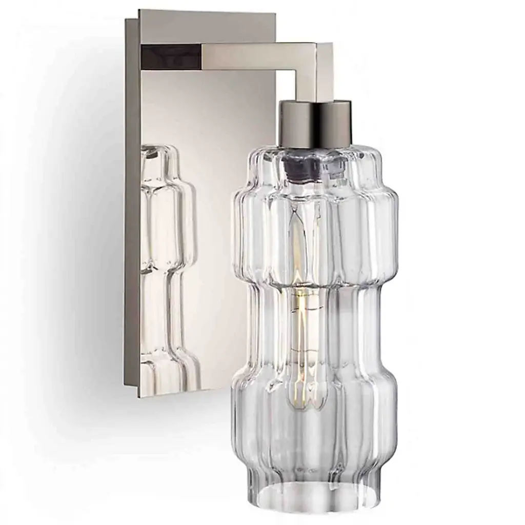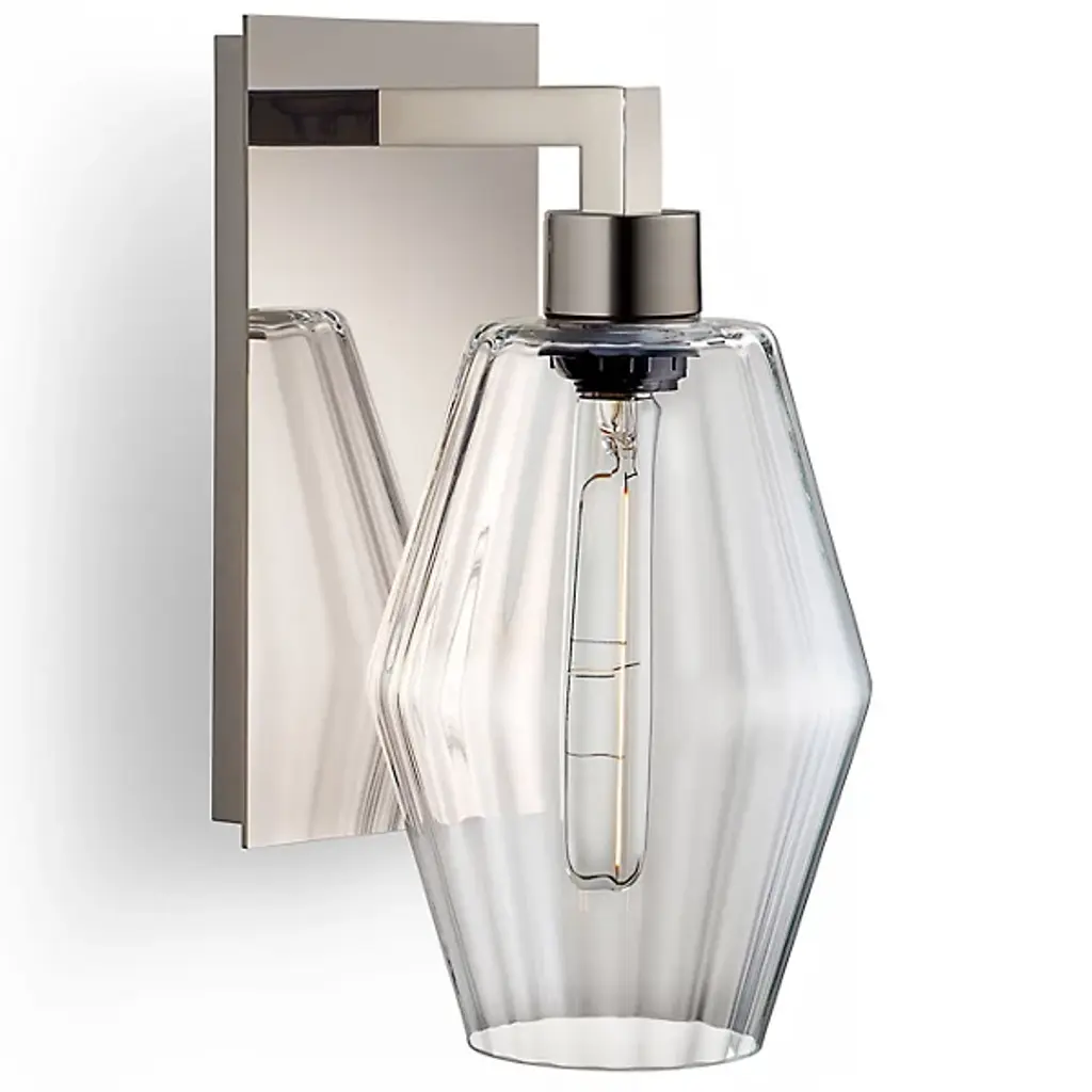 The Marquise Optique Wall Sconce from Niche by Niche introduces a captivating and lavish atmosphere to upright surfaces. It artfully combines the understated elegance of a typical sconce style with the sophistication of meticulously crafted and linear-patterned blown glass. Designed by Jeremy Pyles, this sconce employs a robust rectangular metal mount to uphold the fixture. A solitary right-angled arm gracefully projects from the upper portion of a stepped, rectangular wall plate, extending downward to hold a single socket. A gracefully tapered shade made of handblown glass encircles the socket, embossed with subtle linear accents, and expertly transforms illumination into a restrained yet radiant glow with a touch of shadowed texture.