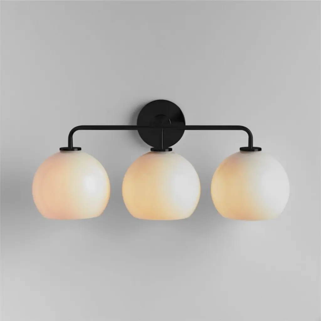 Vanity sconce by Jannis Ellenberger is a modern interpretation of retro globe bulb designs, marrying simple fundamental design with refined details. Suspended from a matte black canopy, three softly frosted glass globes are accented with exposed brass hardware, offering a refined mix of contrasting finishes. Perfect for over-the-mirror bathroom lighting. CB2 exclusive.