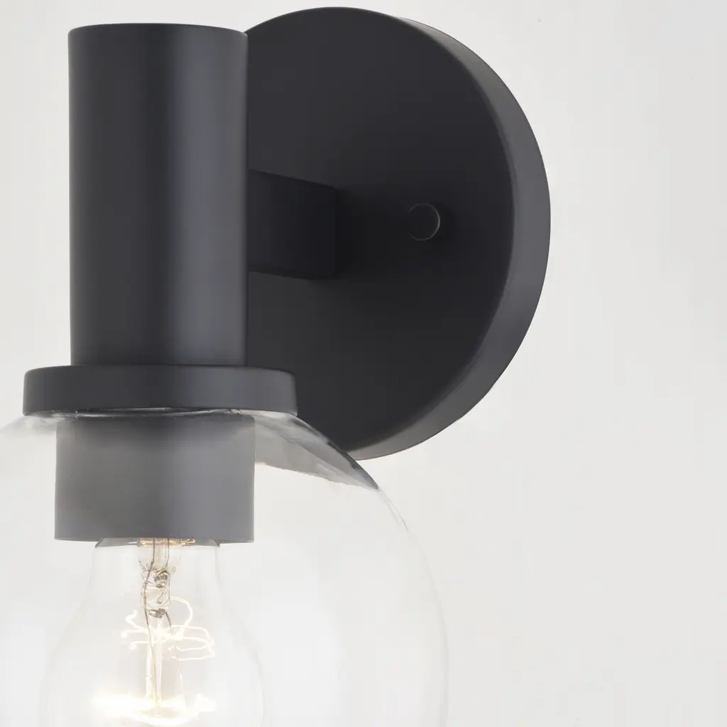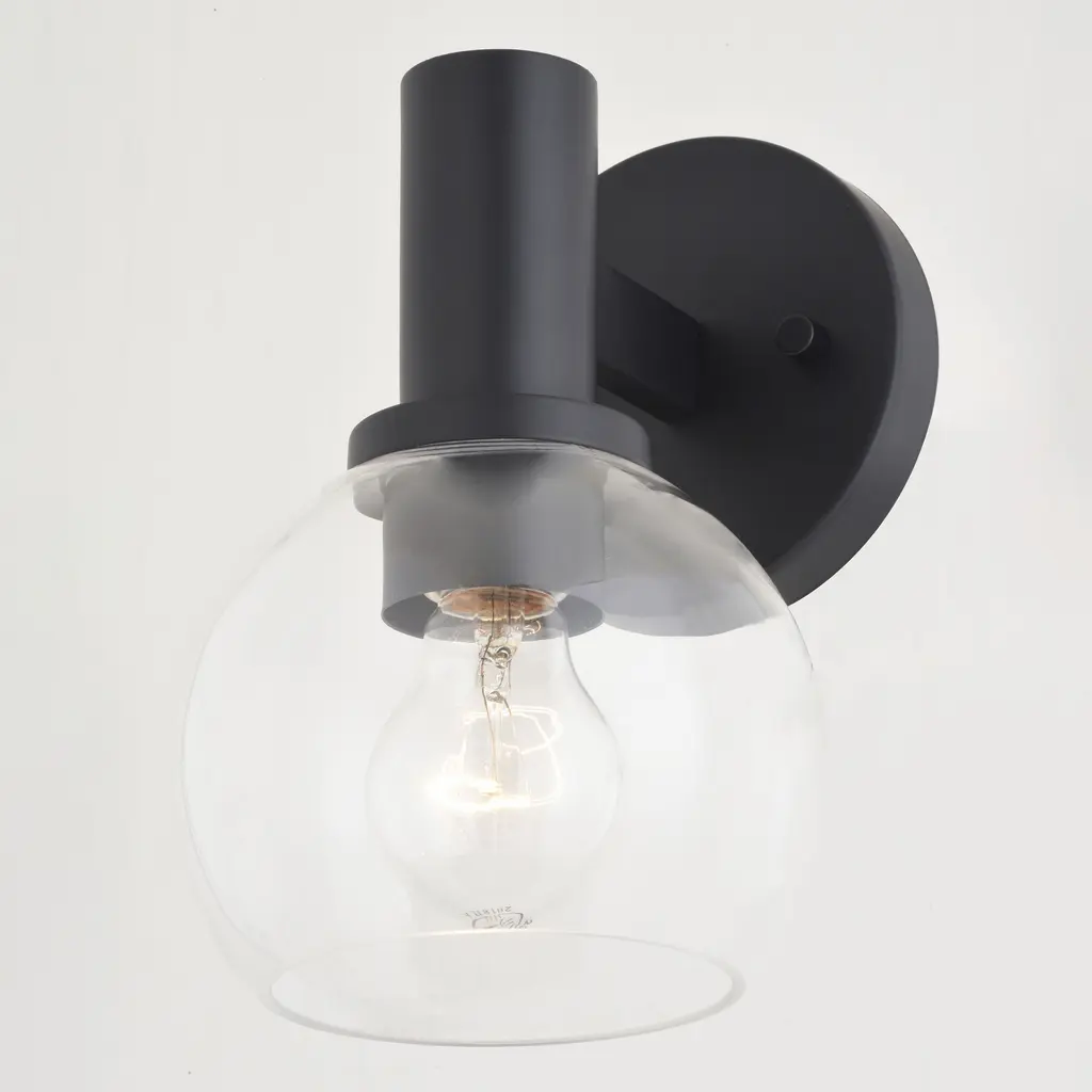 The Marshall collection is transitional style with a contemporary flair at a competitive price. A stately arm finished in matte black supports a clear glass globe for the perfect balance of dark versus light. This wall sconce is ideal for bathrooms, hallways, bedrooms, kitchens or any other living area where a little extra style is desired.