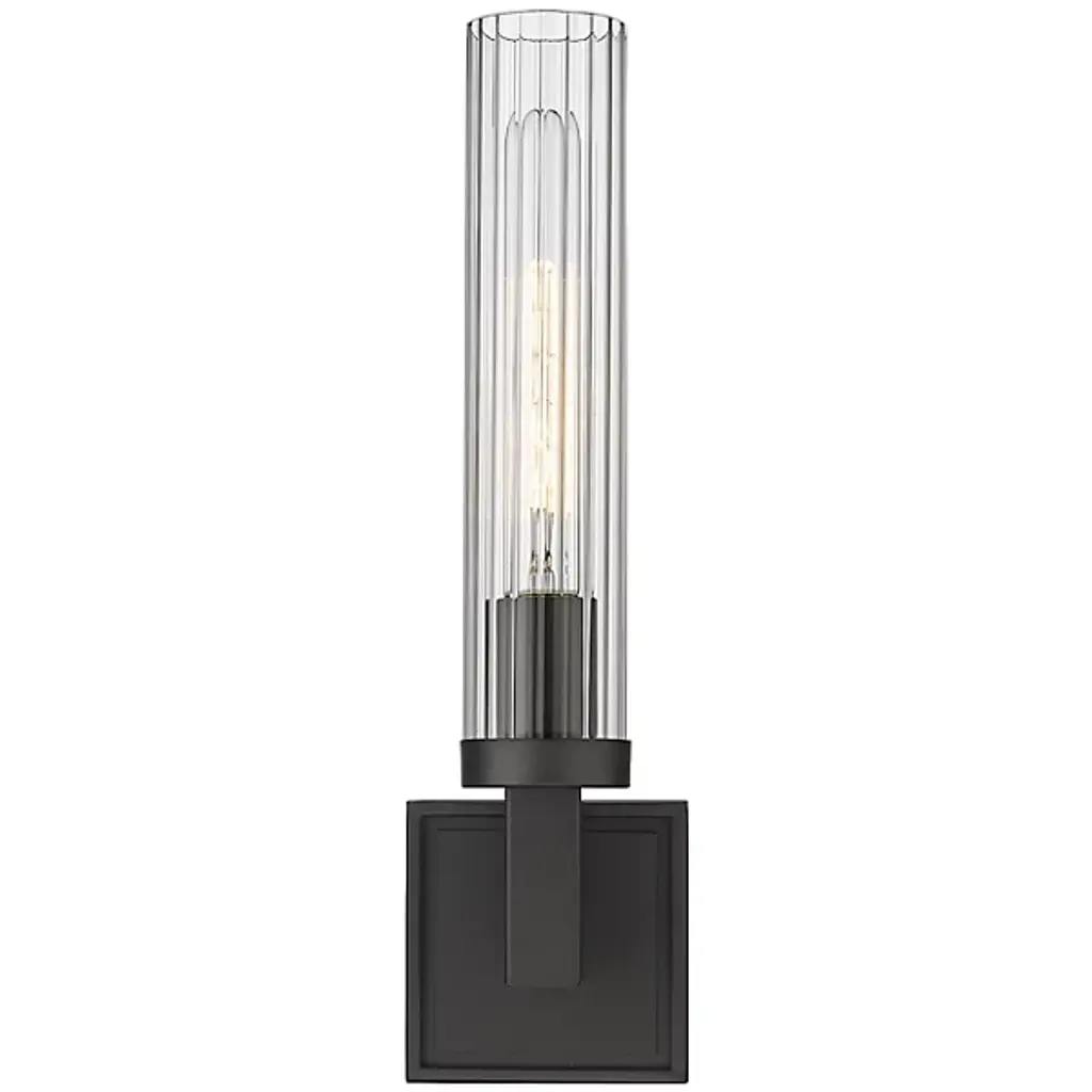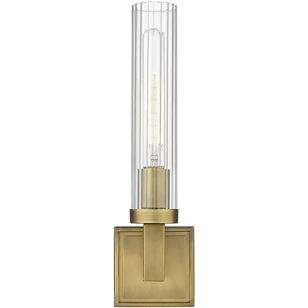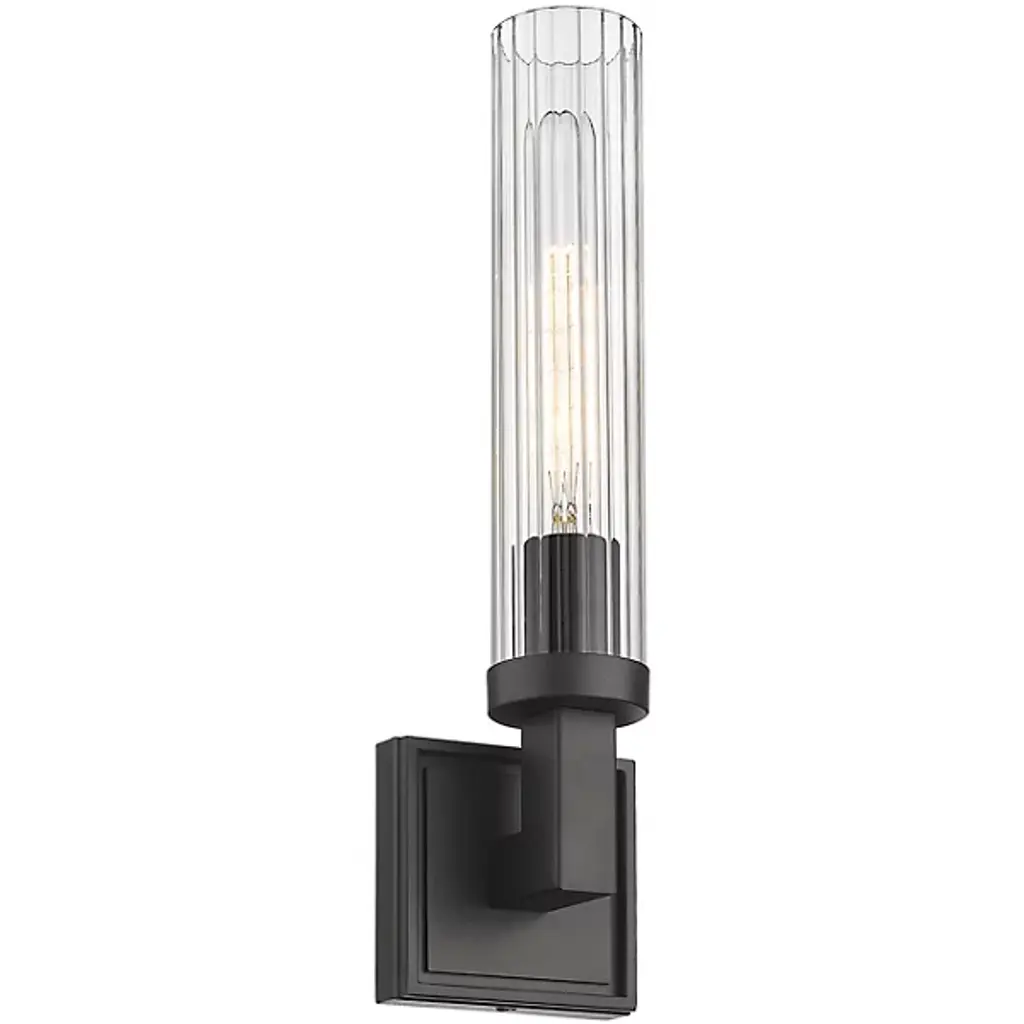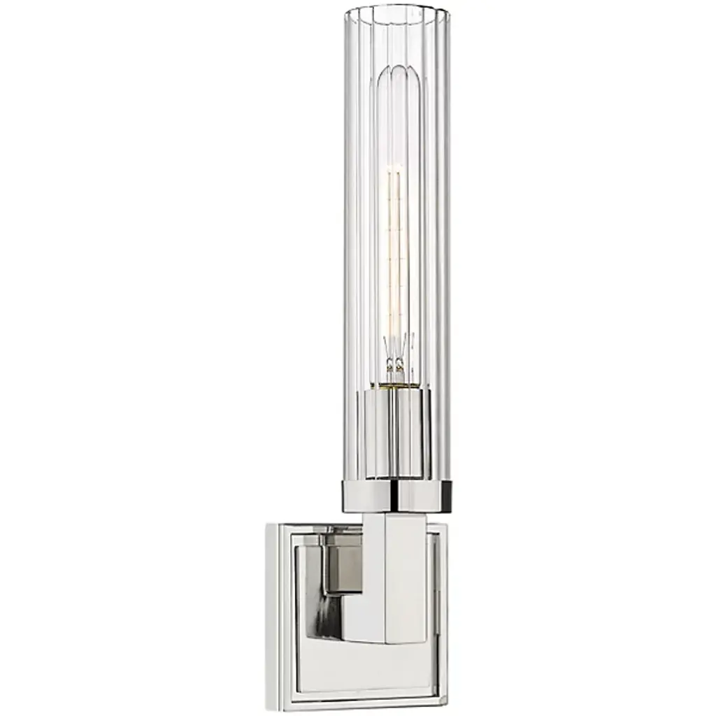 Blending direct industrial style with castle allure, the damp-listed Martin Wall Sconce from Alder & Ore casts sophisticated ambiance across walls. Mounted to a stepped square steel plate, an angled arm suspends clear fluted glass around the lamping. With its slender lampshade and artisanal accents, the design mixes versatile elegance and a commanding presence. The transitional design to infuses chic glam matched with vintage influence, creating an artful union of glass and metal.