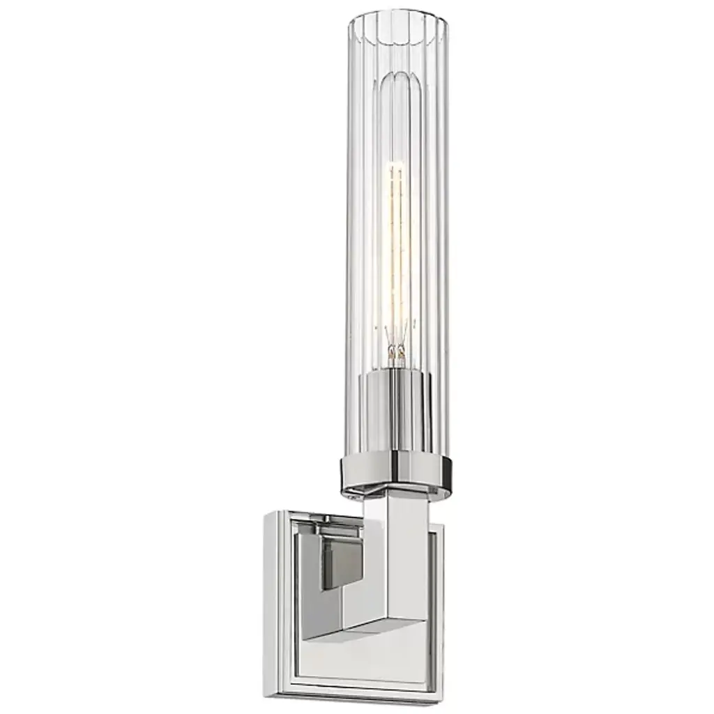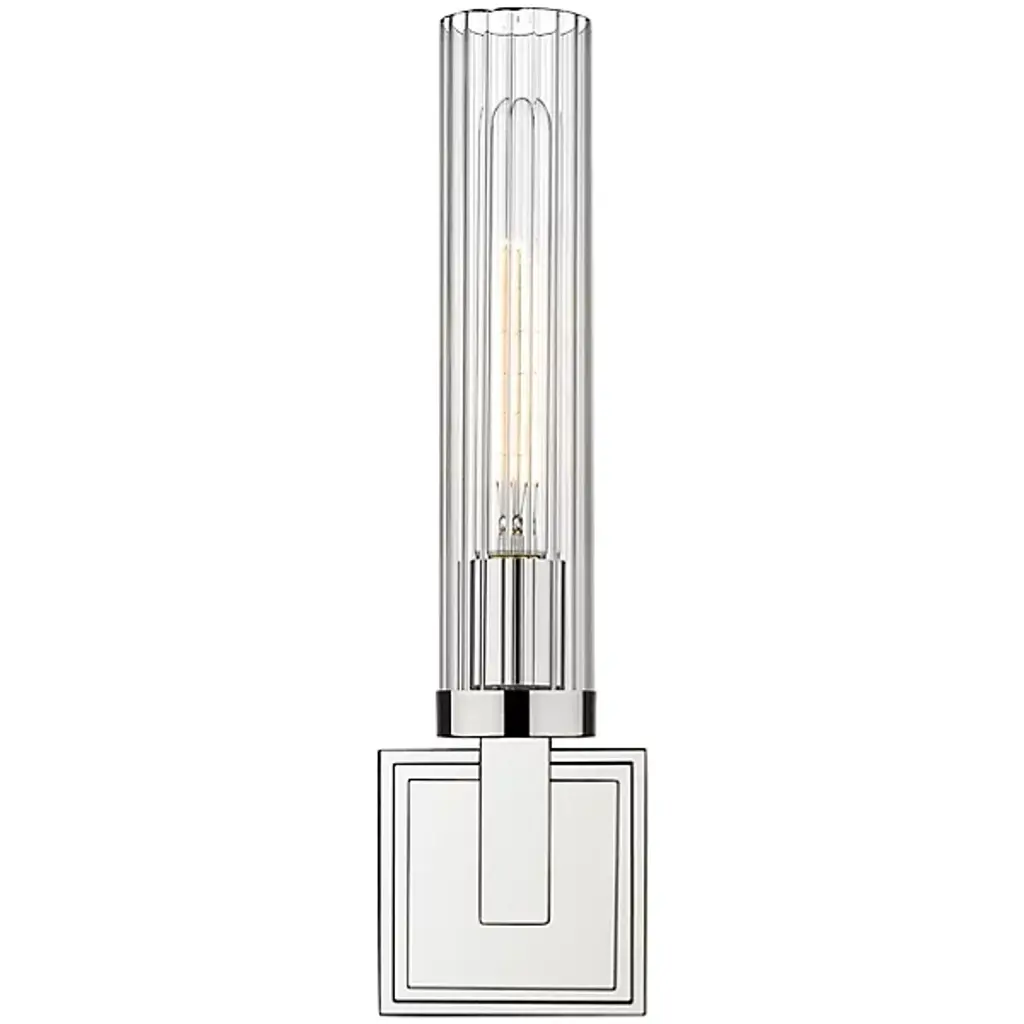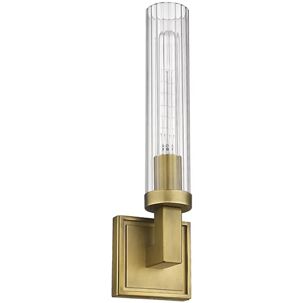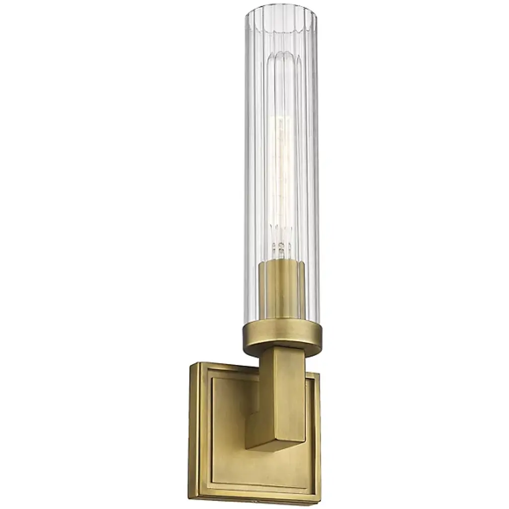 Blending direct industrial style with castle allure, the damp-listed Martin Wall Sconce from Alder & Ore casts sophisticated ambiance across walls. Mounted to a stepped square steel plate, an angled arm suspends clear fluted glass around the lamping. With its slender lampshade and artisanal accents, the design mixes versatile elegance and a commanding presence. The transitional design to infuses chic glam matched with vintage influence, creating an artful union of glass and metal.