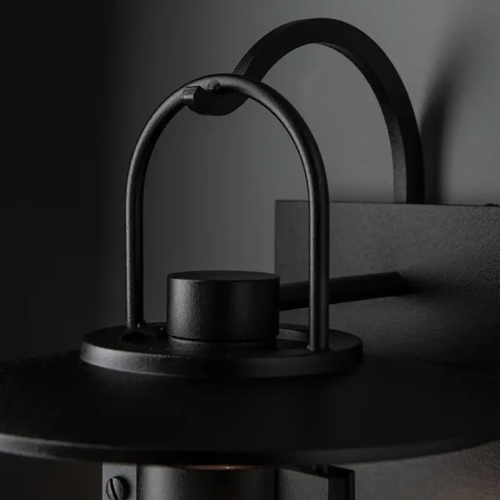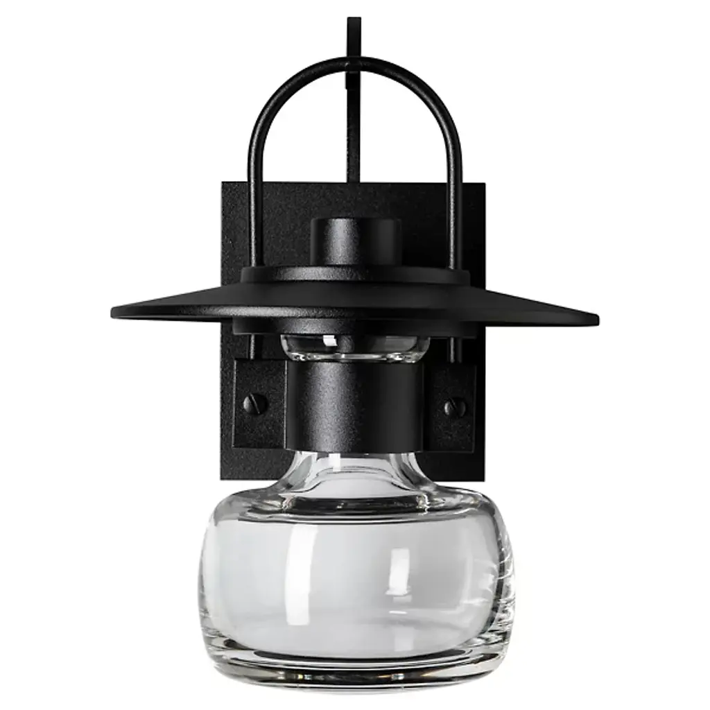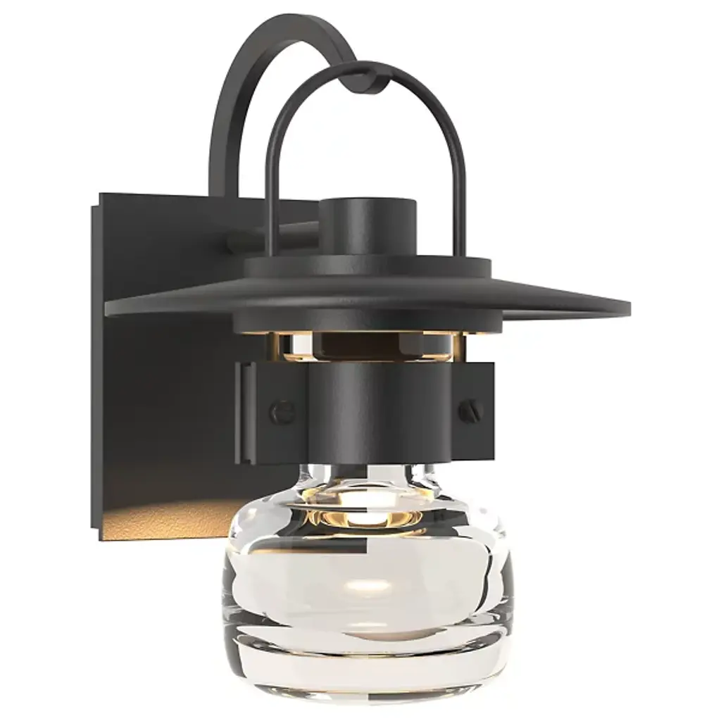 A sparkling jewel for outdoor spaces. The Hubbardton Forge Mason Coastal Outdoor Wall Sconce features a hook-hung lantern silhouette, made new and modern with a tiered, circular aluminum cap. A metal cuff around the top of the thick blown-glass shade conceals the light source, creating an ethereal effect like fireflies caught in a jar. A charming choice for flanking entrances, alongside garden paths and more. The coastal finishes are meant to endure harsh salt water environments and have been tested to 100% humidity and water with salinity 50% greater than the average found in the Atlantic or Pacific.