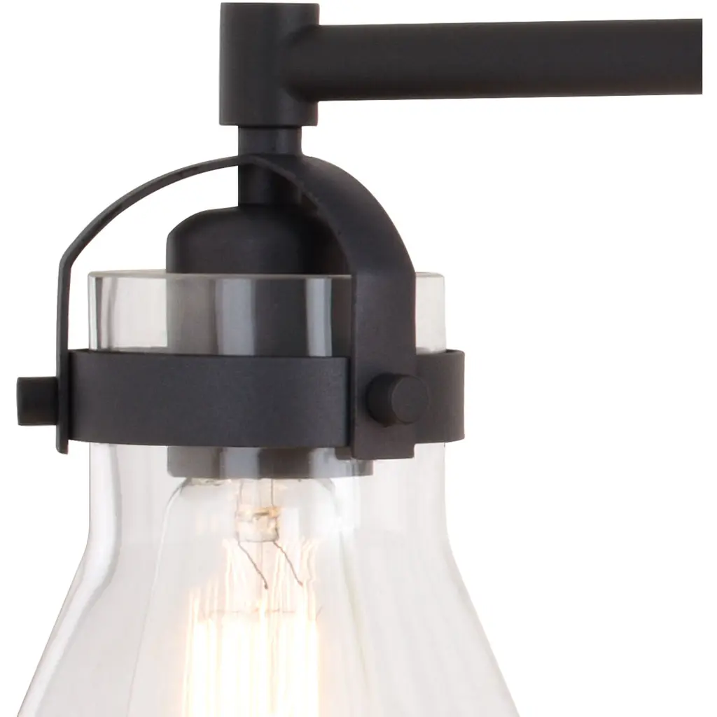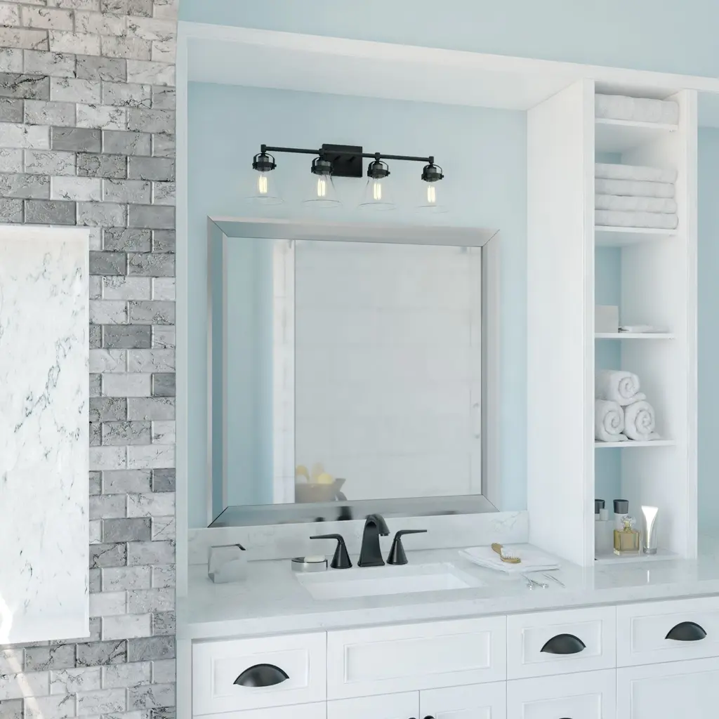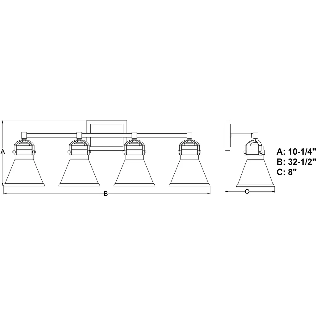 A nod to farmhouse and industrial aesthetics are realized in the Mason vanity collection. Charcoal black accents offer a striking contrast to each funnel shaped shade. As they sit perched along a horizontal support, a brilliant show of light pours from each shade, creating a bright shine on the subject below. This 4-light vanity is ideal in any bath, or interior space where extra light is welcomed.