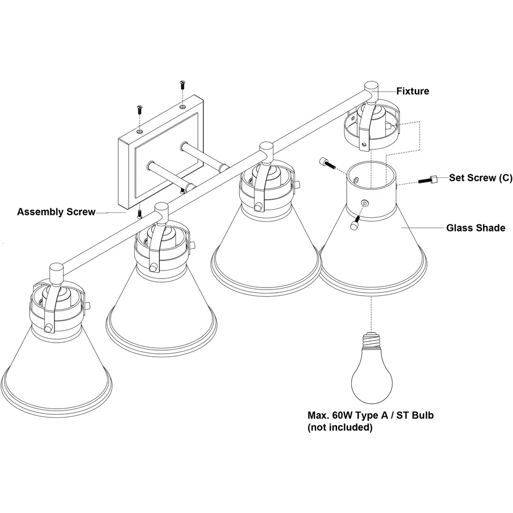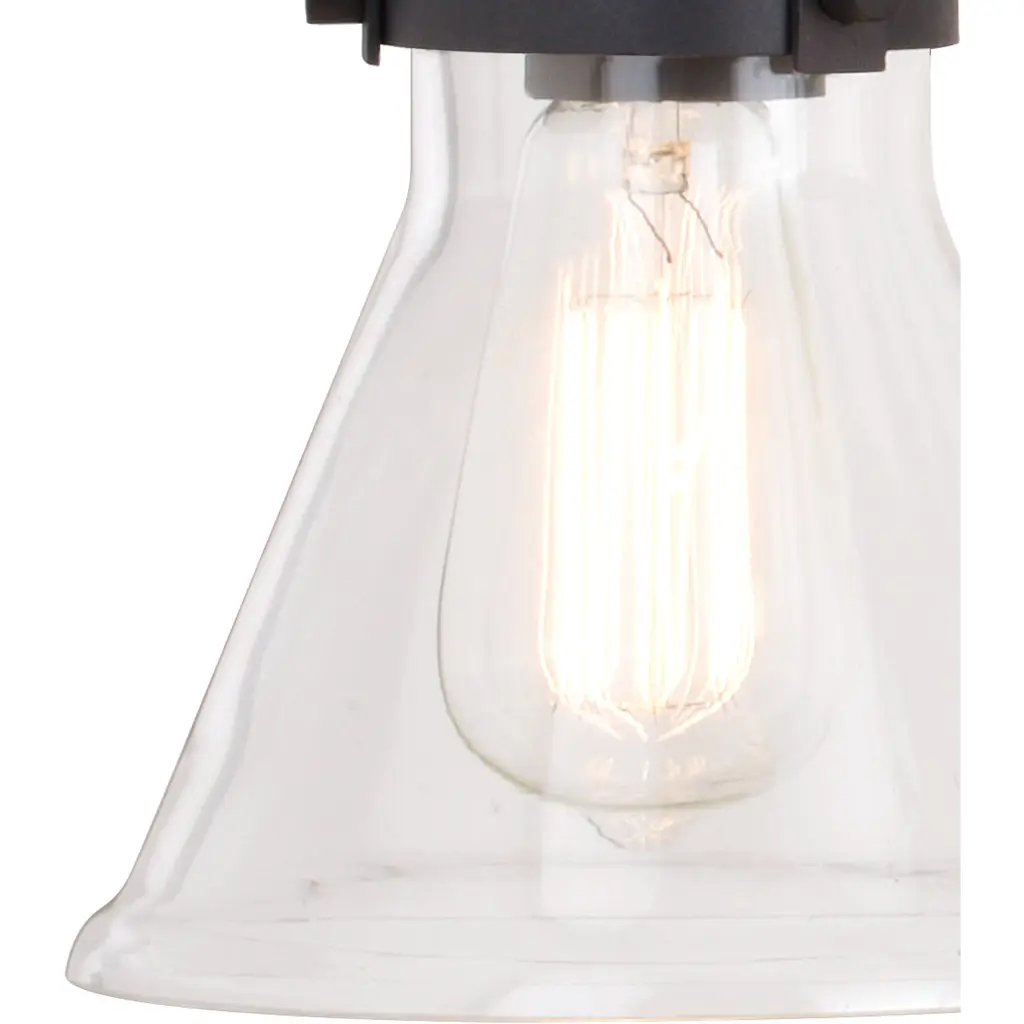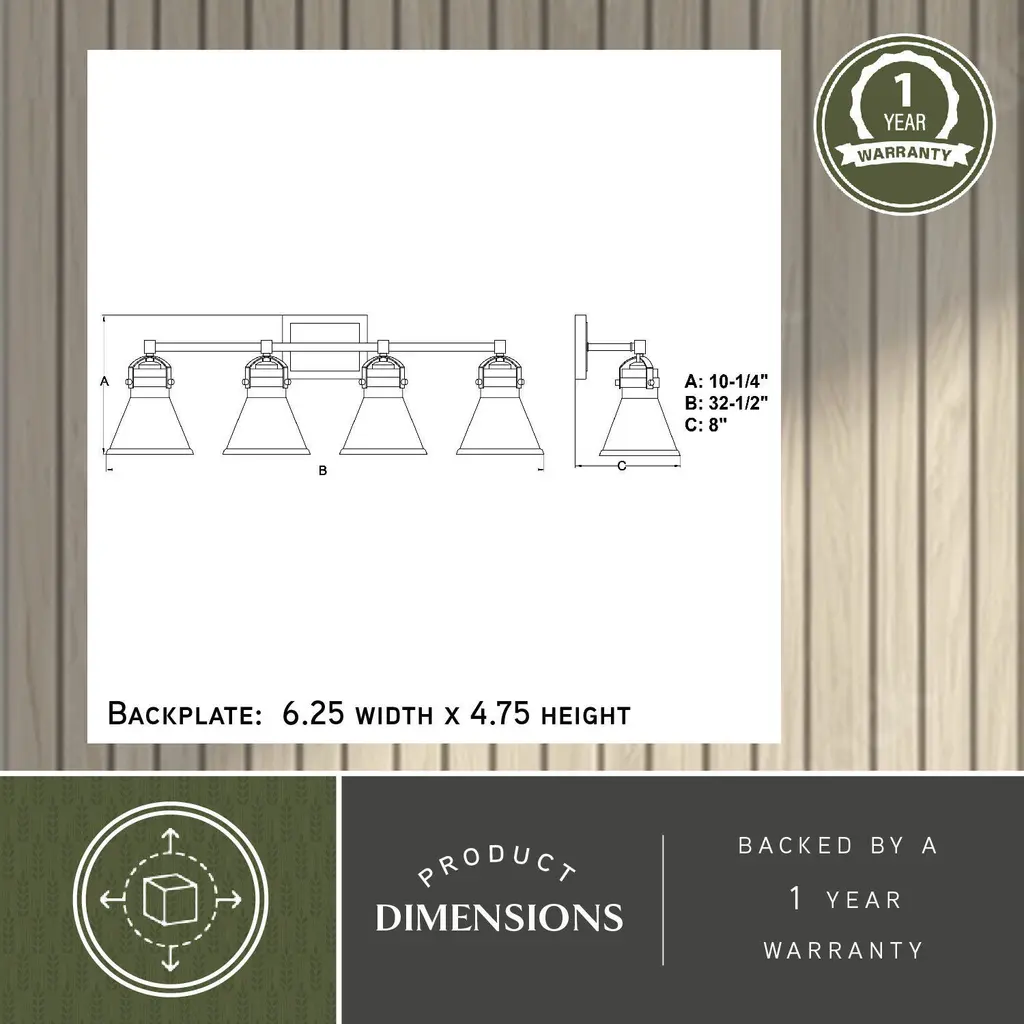 A nod to farmhouse and industrial aesthetics are realized in the Mason vanity collection. Charcoal black accents offer a striking contrast to each funnel shaped shade. As they sit perched along a horizontal support, a brilliant show of light pours from each shade, creating a bright shine on the subject below. This 4-light vanity is ideal in any bath, or interior space where extra light is welcomed.