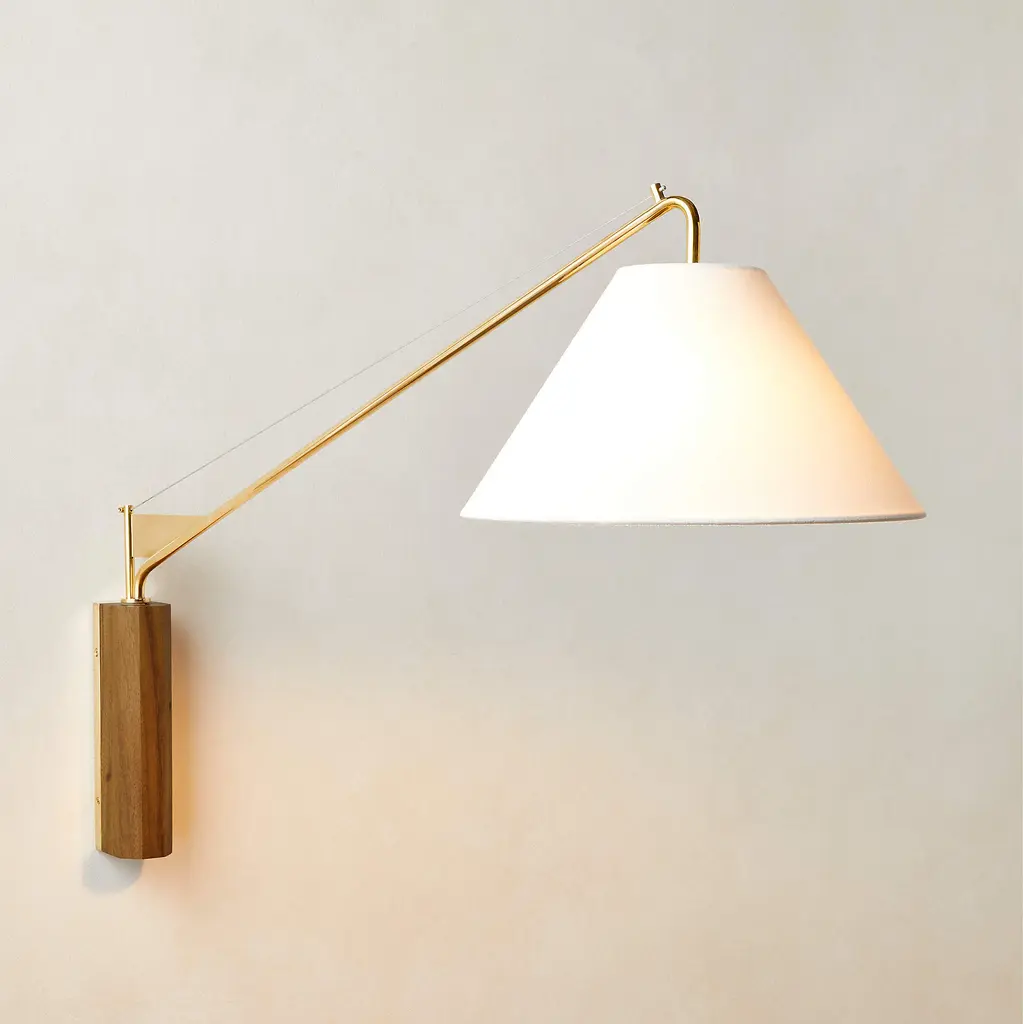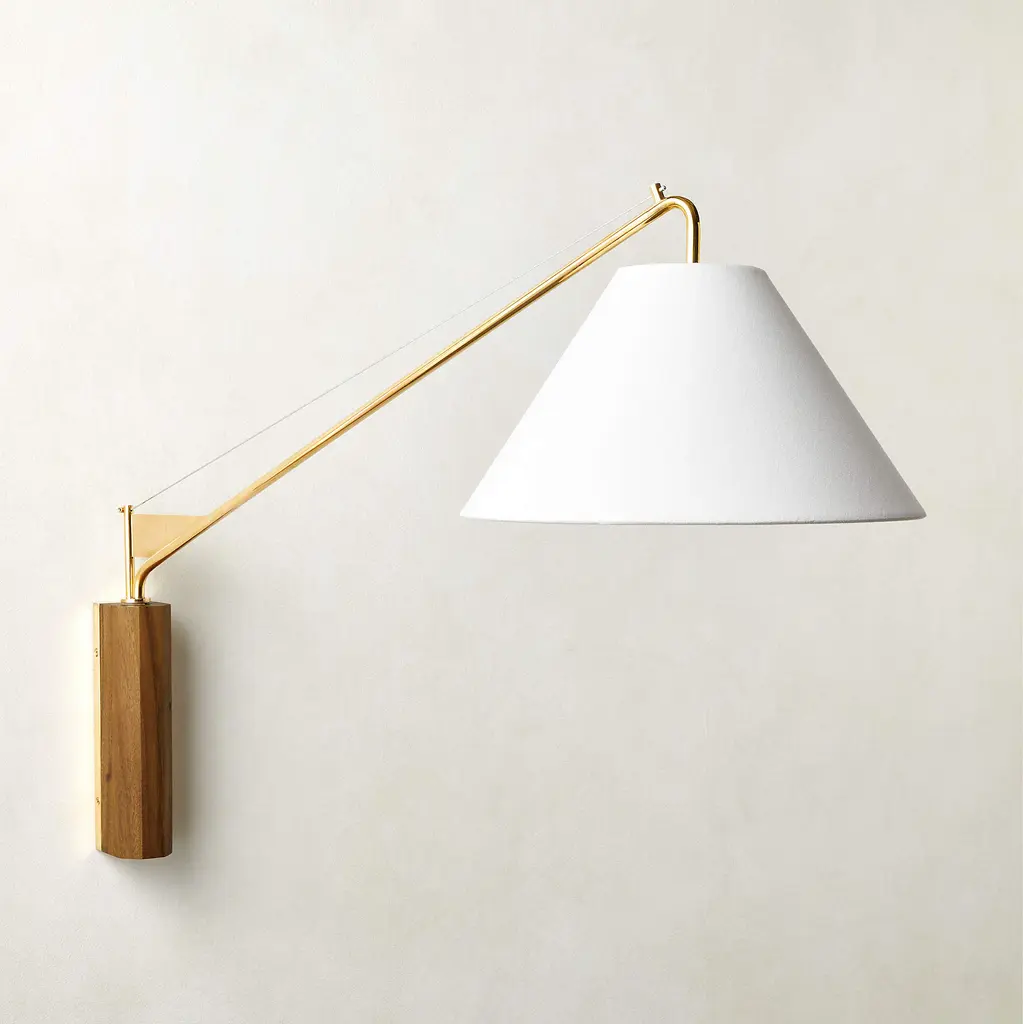 Barcelona-based Mermelada Estudio's sconce is a modern interpretation of clean midcentury design. From its elegantly outstretched unlacquered brass arm to the walnut backplate and suspended cable details, the dramatic silhouette transmits a warm light downward toward reading materials without taking up floor space. CB2 exclusive. Due to the nature of the material, brass patina will vary in color and darken over time.