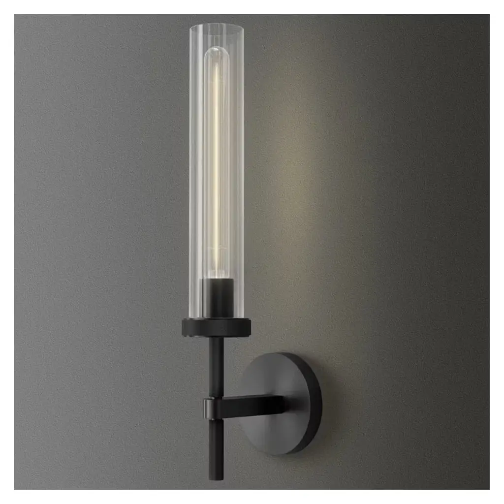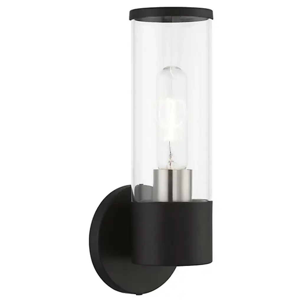 The Masthead Wall Sconce from Hinkley Lighting is a modern piece, appearing both sharp and striking like a saber. The sconce evokes vintage designs through its intricate accents and pair of finishes. It complements its surroundings by mounting upward or downward with a compact backplate. A pair of bold endcaps fame the sleek outline created by the steel cylinder at the center. Protected by linear metal accents, the glass fills in the cylinder with a reflective note. A tubular bulb complements the linear silhouette of the piece. This bulb produces a directed pass of warm, wall-glazing light.