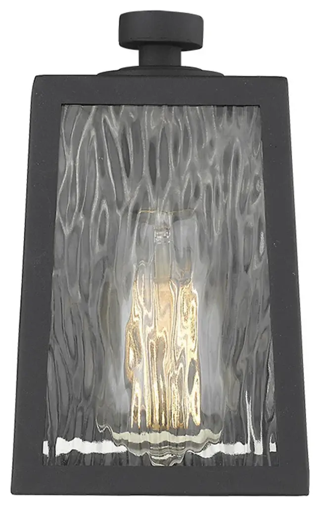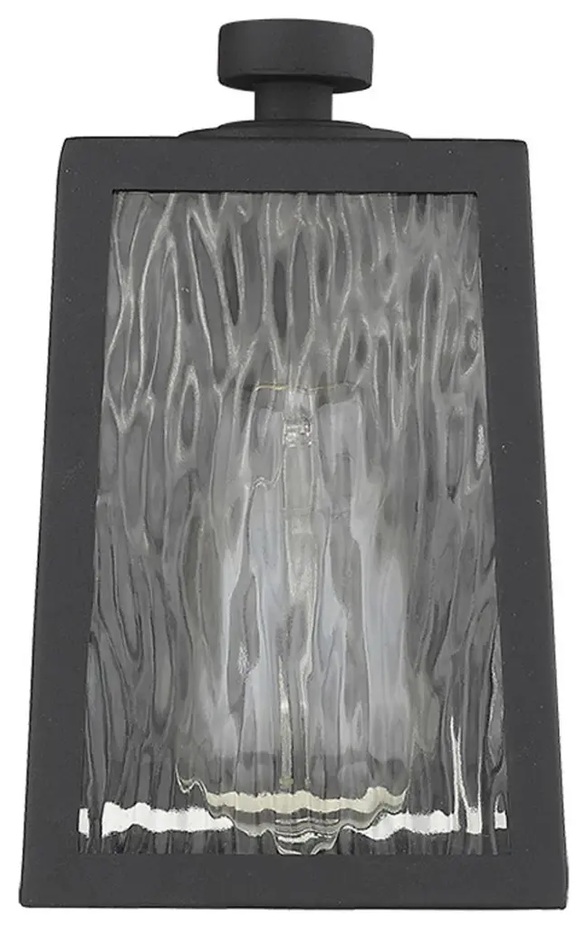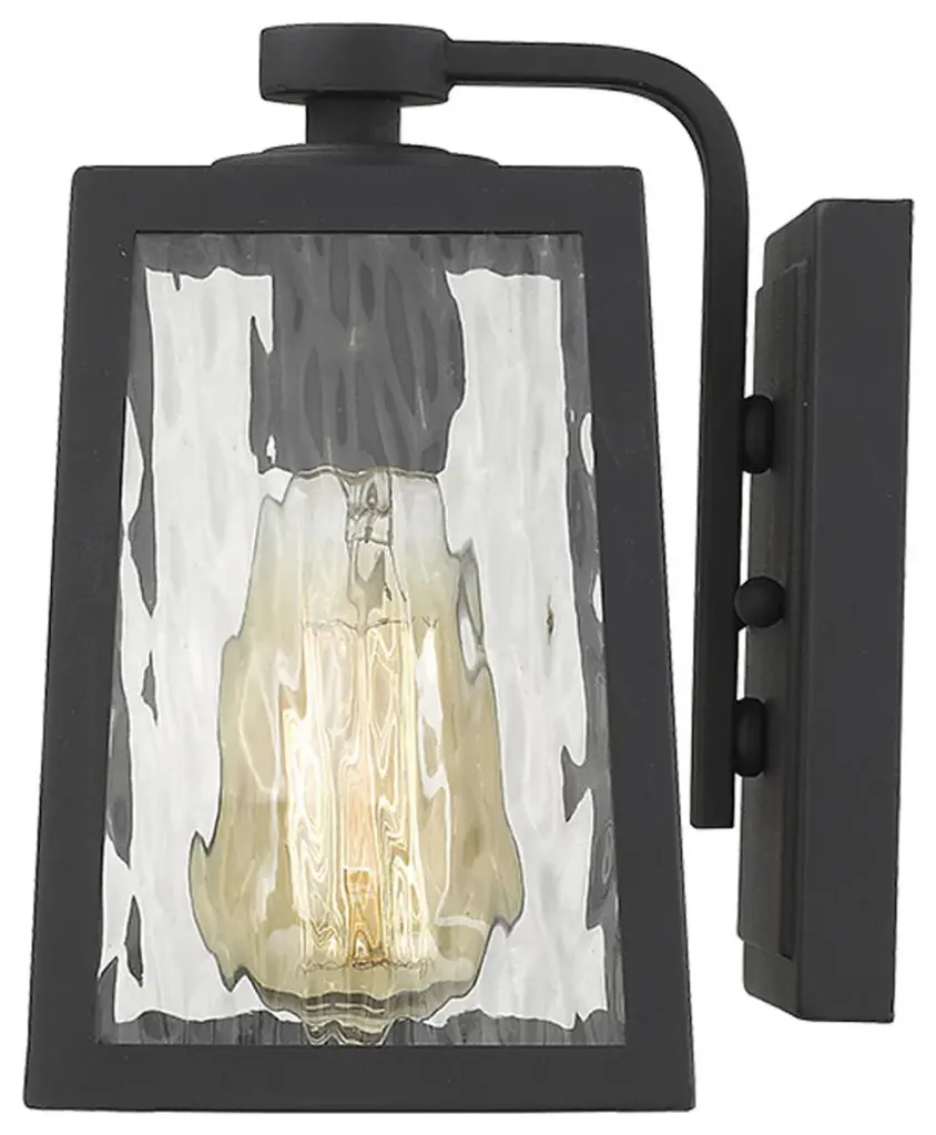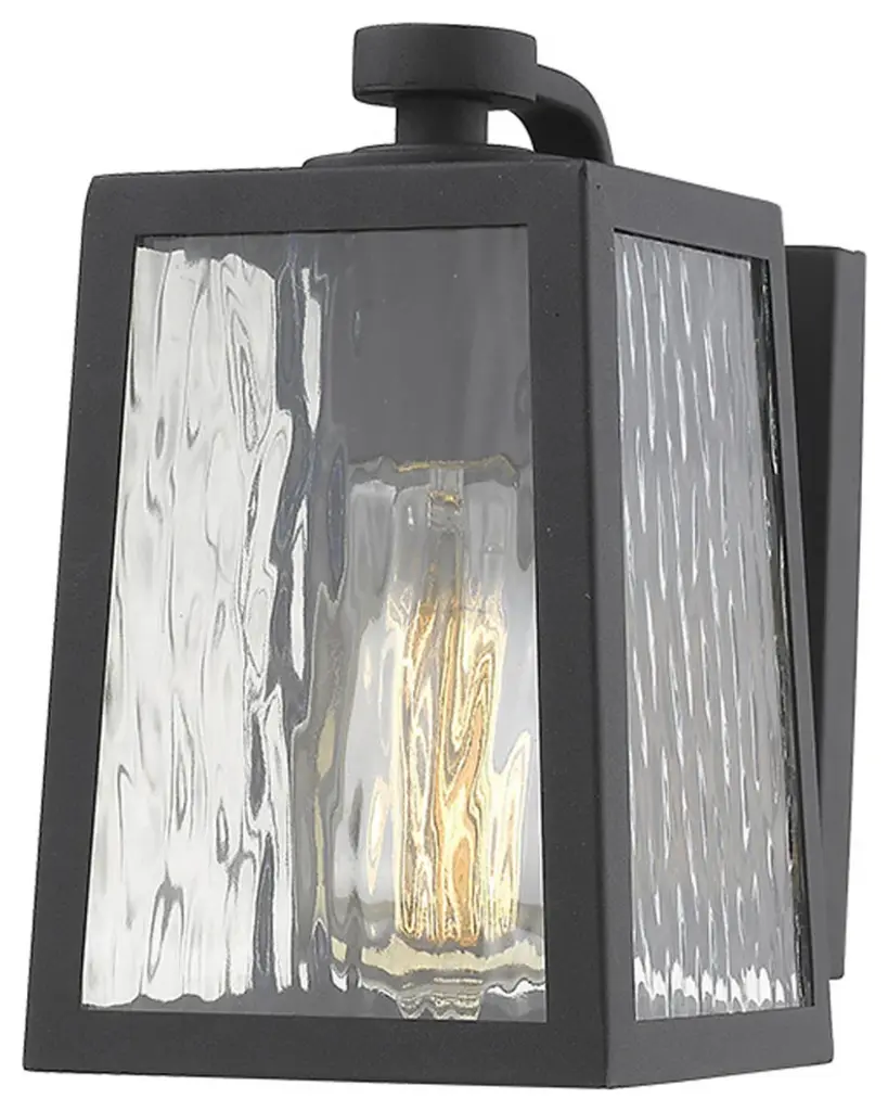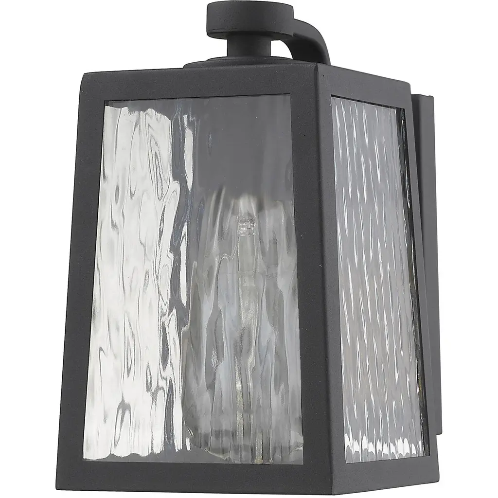 Show some love to the exterior of your home with this Matte Black glass panels Outdoor Wall Light. The frame of this light has a simple three sided design which tapers slightly towards the top. The clean lines look even better because of the matte black finish on top. Inside this frame there are three panes of glass. The glass has a waterfall effect on it which creates a really nice effect when the light is on. The glass panels are see-through to an extent and allow for the bulb inside to show through. The frame has a wall bracket attached to it to make it easy to hang it up. 8.25" H x 5" W x 6.75" D