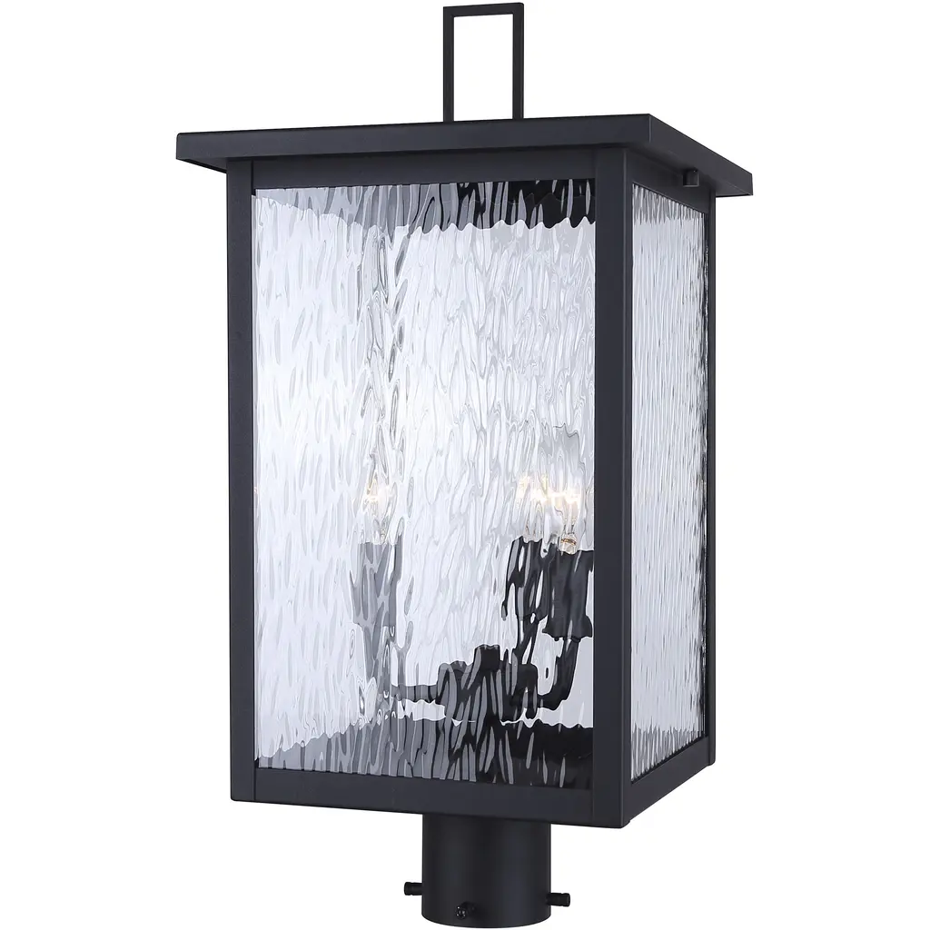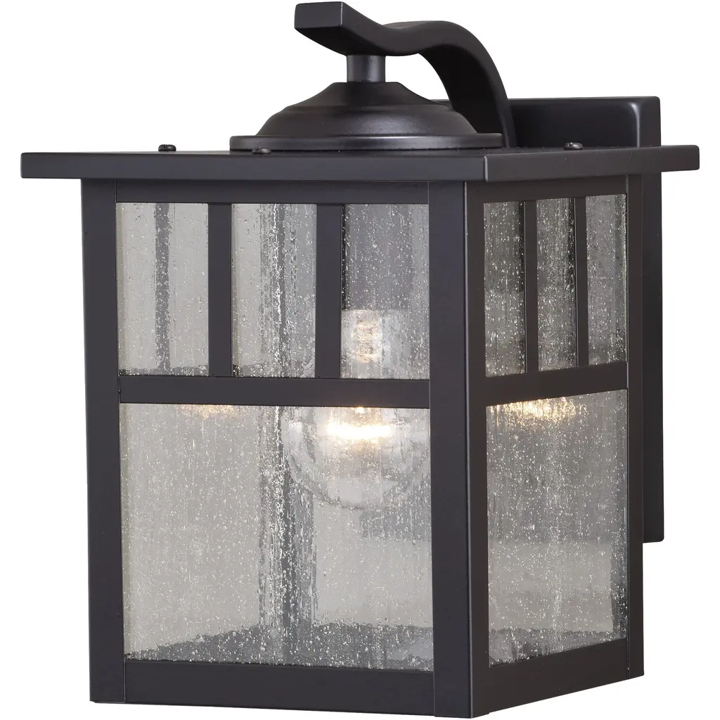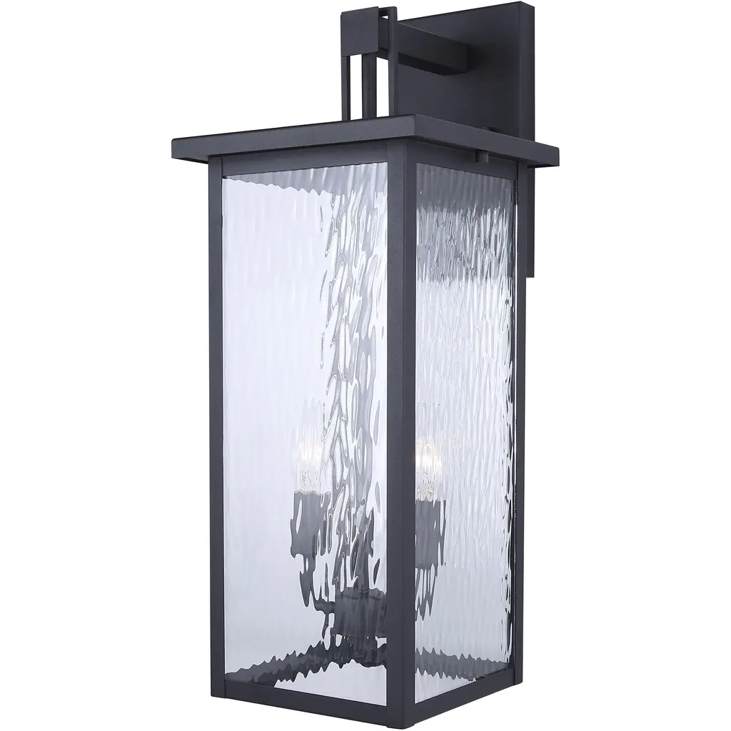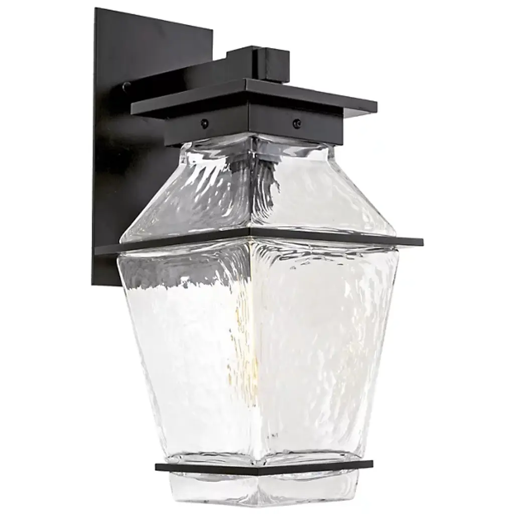 Show some love to the exterior of your home with this Matte Black glass panels Outdoor Wall Light. The frame of this light has a simple three sided design which tapers slightly towards the top. The clean lines look even better because of the matte black finish on top. Inside this frame there are three panes of glass. The glass has a waterfall effect on it which creates a really nice effect when the light is on. The glass panels are see-through to an extent and allow for the bulb inside to show through. The frame has a wall bracket attached to it to make it easy to hang it up. 8.25" H x 5" W x 6.75" D