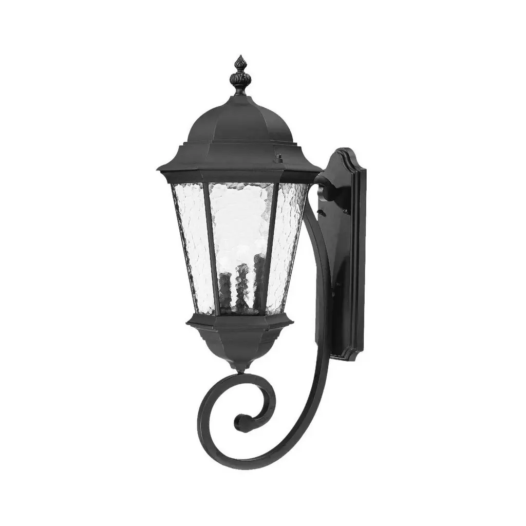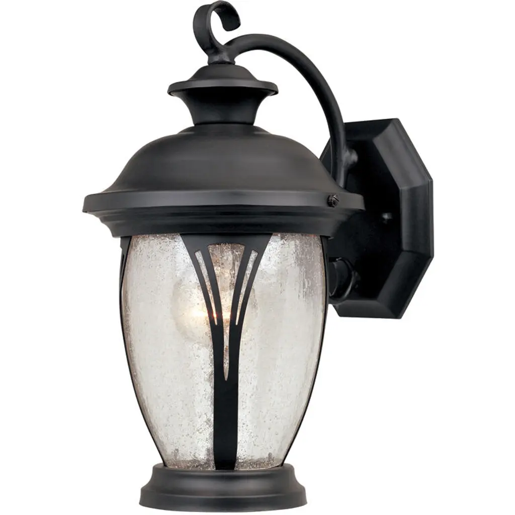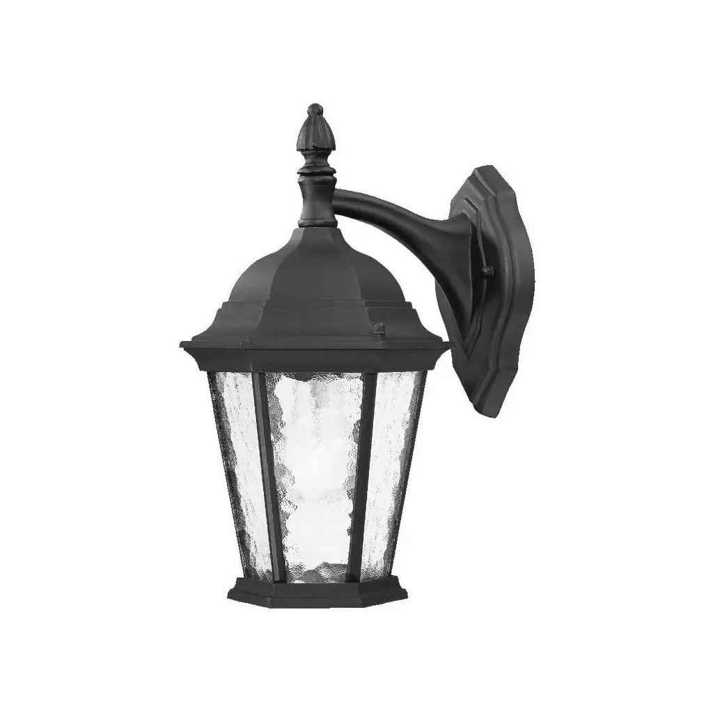 With this Matte Black Tapered Lantern Wall Light you can add a touch of traditional design to the exterior walls of your home. The wall bracket is oval shaped and has a curved spiral cast aluminum rod attached to it. The main body of the light has a wide carrousel shaped top which tapers down to a narrow three-tier bottom piece. In the middle there is a thin cage which is lined with glass panels that has a hammered pattern on it. Use this monotone matte black light on its own in your backyard, or in pairs encasing your front door. 16.5" H x 8" W x 9" D