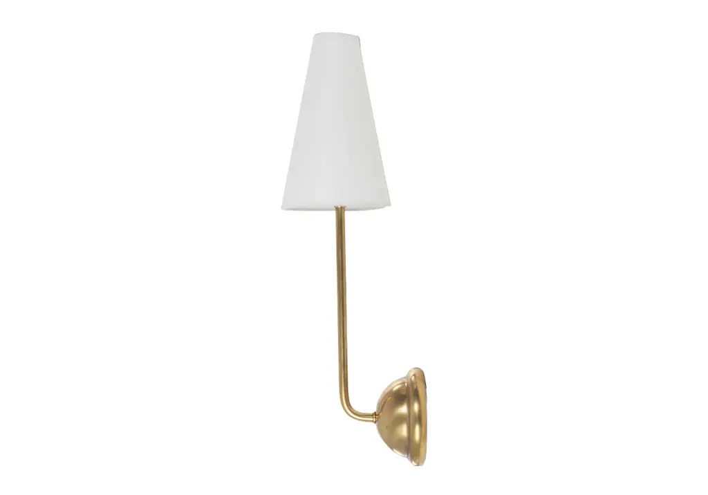 Inspired by French designs, the Maude is a chic addition. It features a thin, elongated stem complemented by a tall, tapered linen shade. Its unlacquered brass form lends a refined touch, easily styling in pairs above a mantle, around a mirror, or in a hallway for an elevated look.