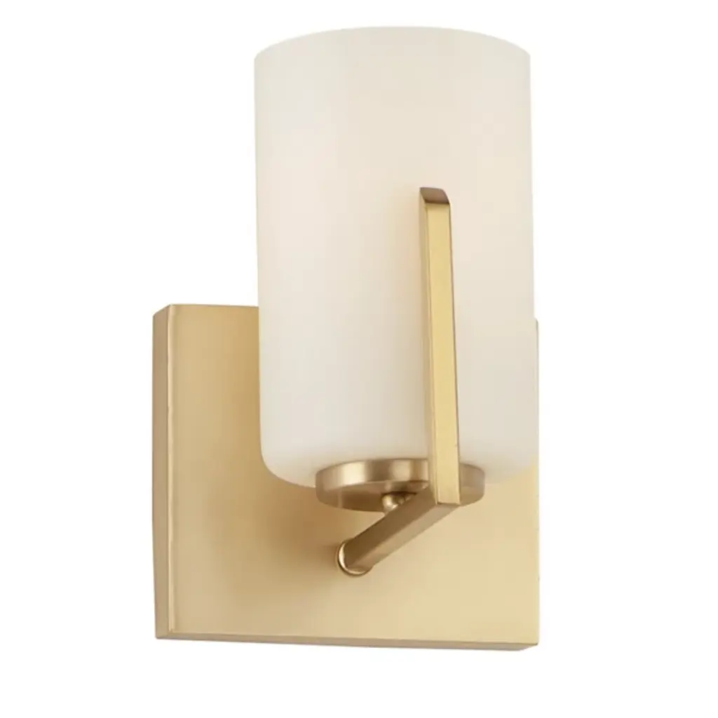 The Mauro Bathroom Wall Sconce by Huxe features a straight-lined frame and a crisp, cylindrical white glass shade inspired by the designs of modernist architect Edward Dart. Anchored by a smooth square backplate, the arm of this wall sconce artfully holds a simple pillar of light with a squared metal piece that frames the front of the glass shade and has an angled end. Diffusing an even layer of illumination onto surroundings, this minimalistic and sophisticated piece adds a beautiful touch to master and guest bathrooms alike