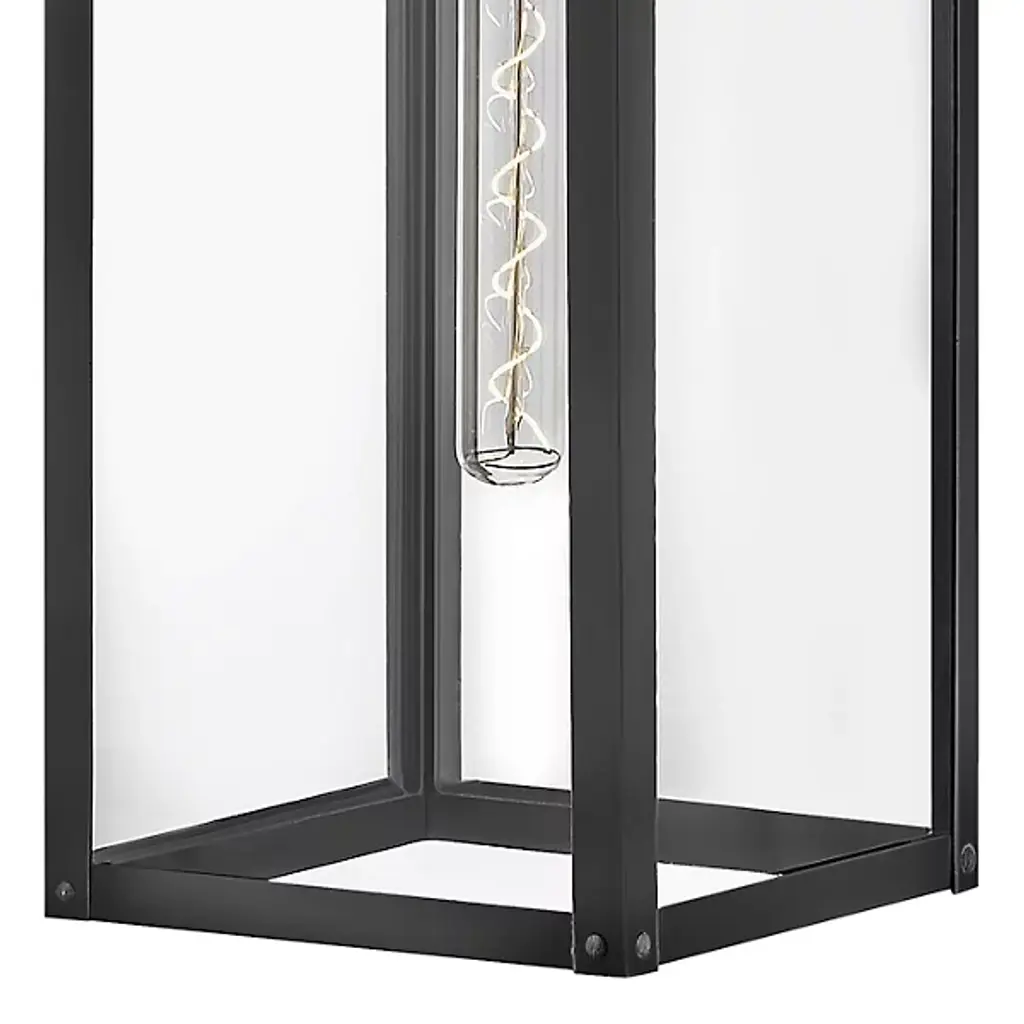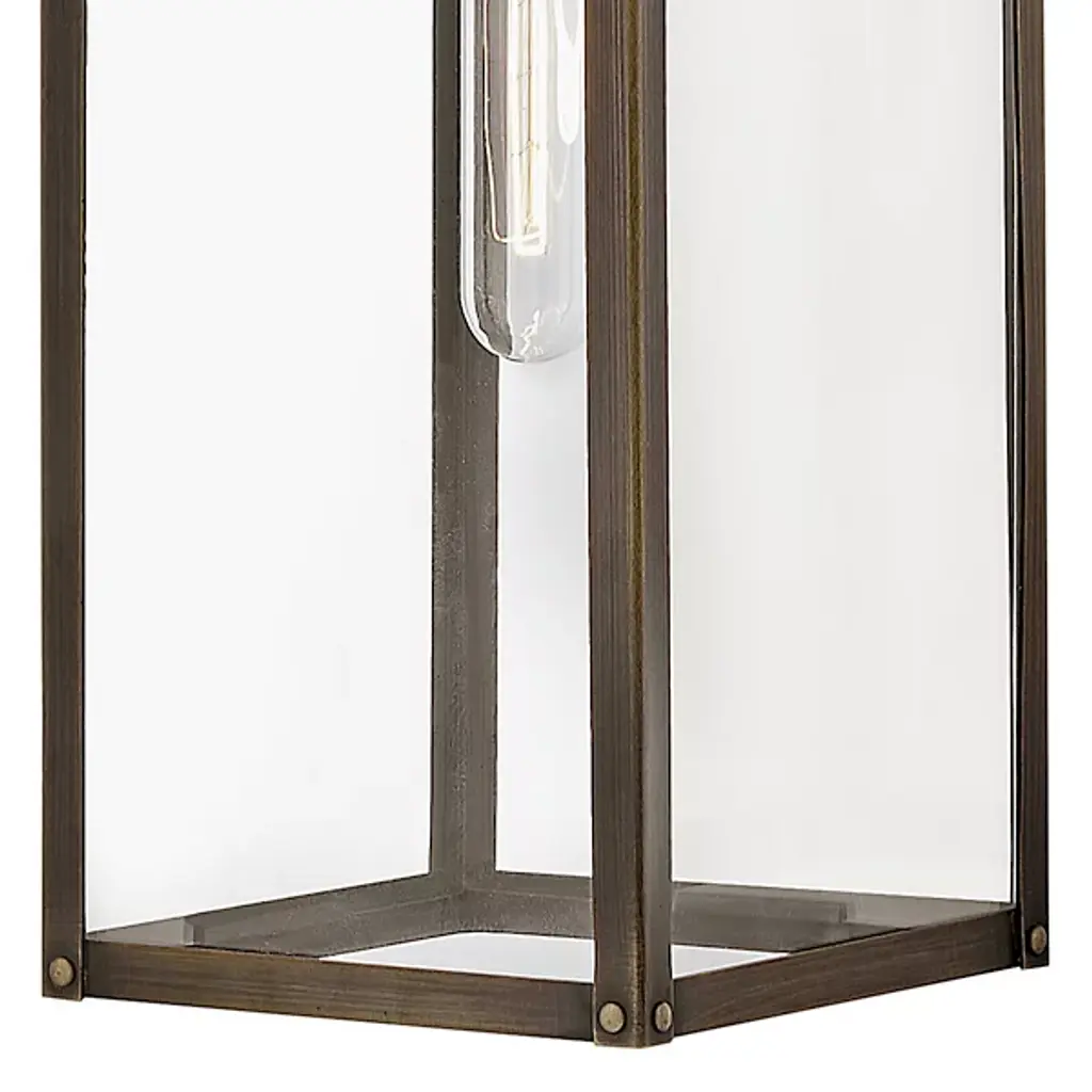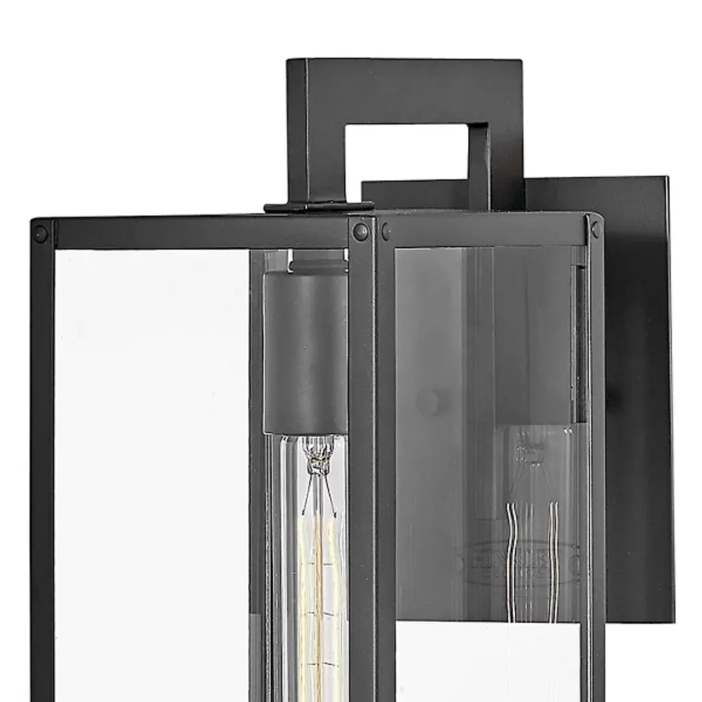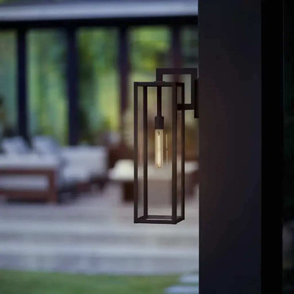 The Max Outdoor Wall Sconce from Hinkley features a hand-welded aluminum construction with angular geometry, ideal for exterior illumination. An arm extends from a square wall mount to support a rectangular shade housing a downward-facing socket. Clear glass panes screen the damp-rated lamping, reducing direct glare while maintaining output for pathways and entryways. The welded assembly ensures structural integrity, while the straightforward metal-edged design focuses on functional performance. The rectangular shade directs light downward for architectural features or walkways requiring durable exterior lighting in residential or commercial settings.