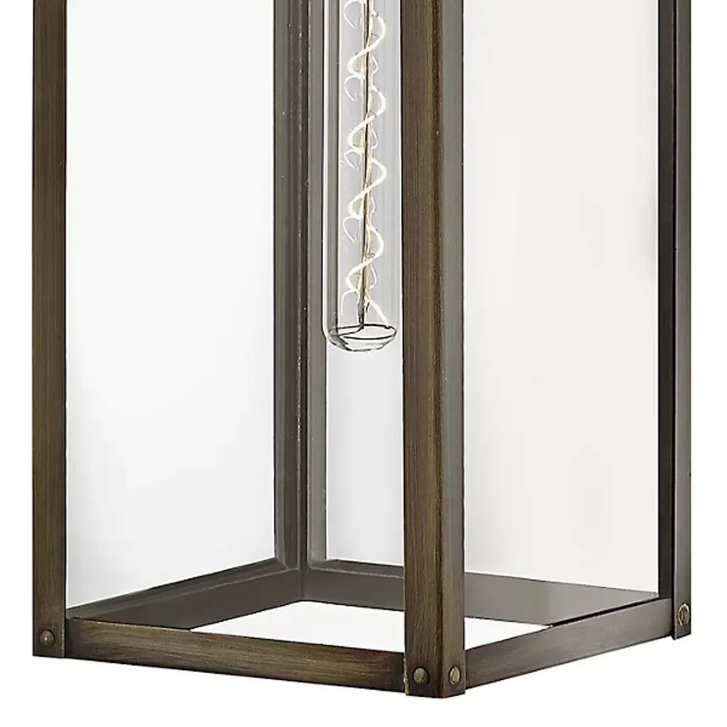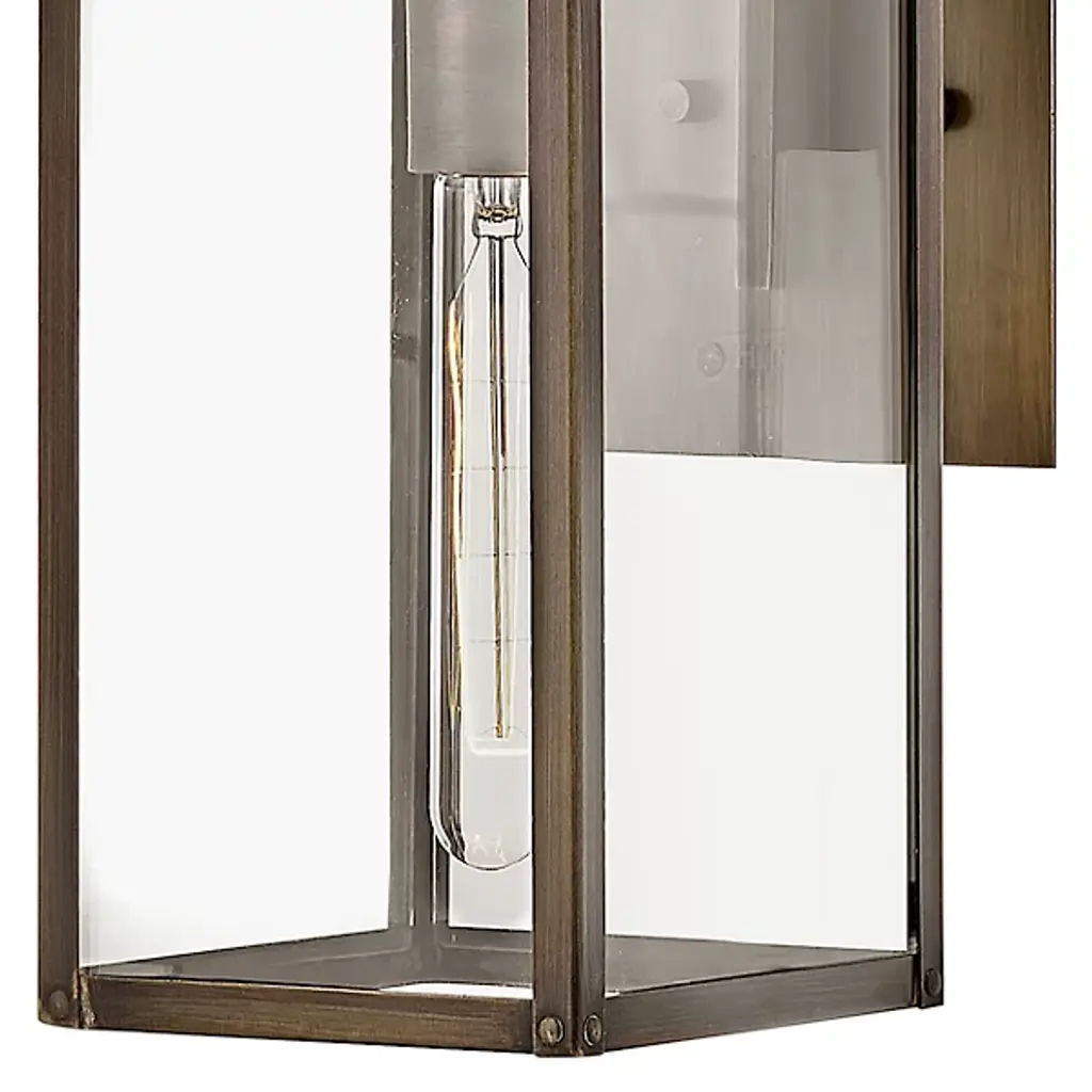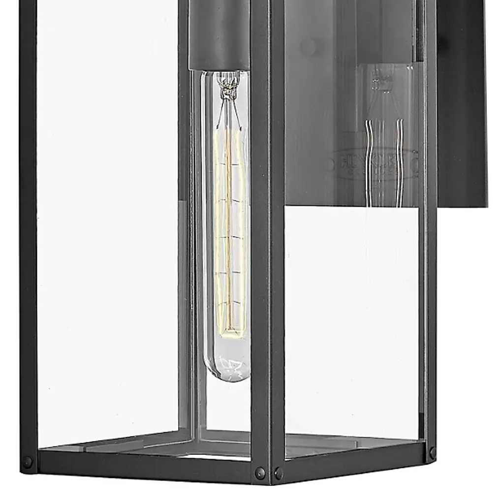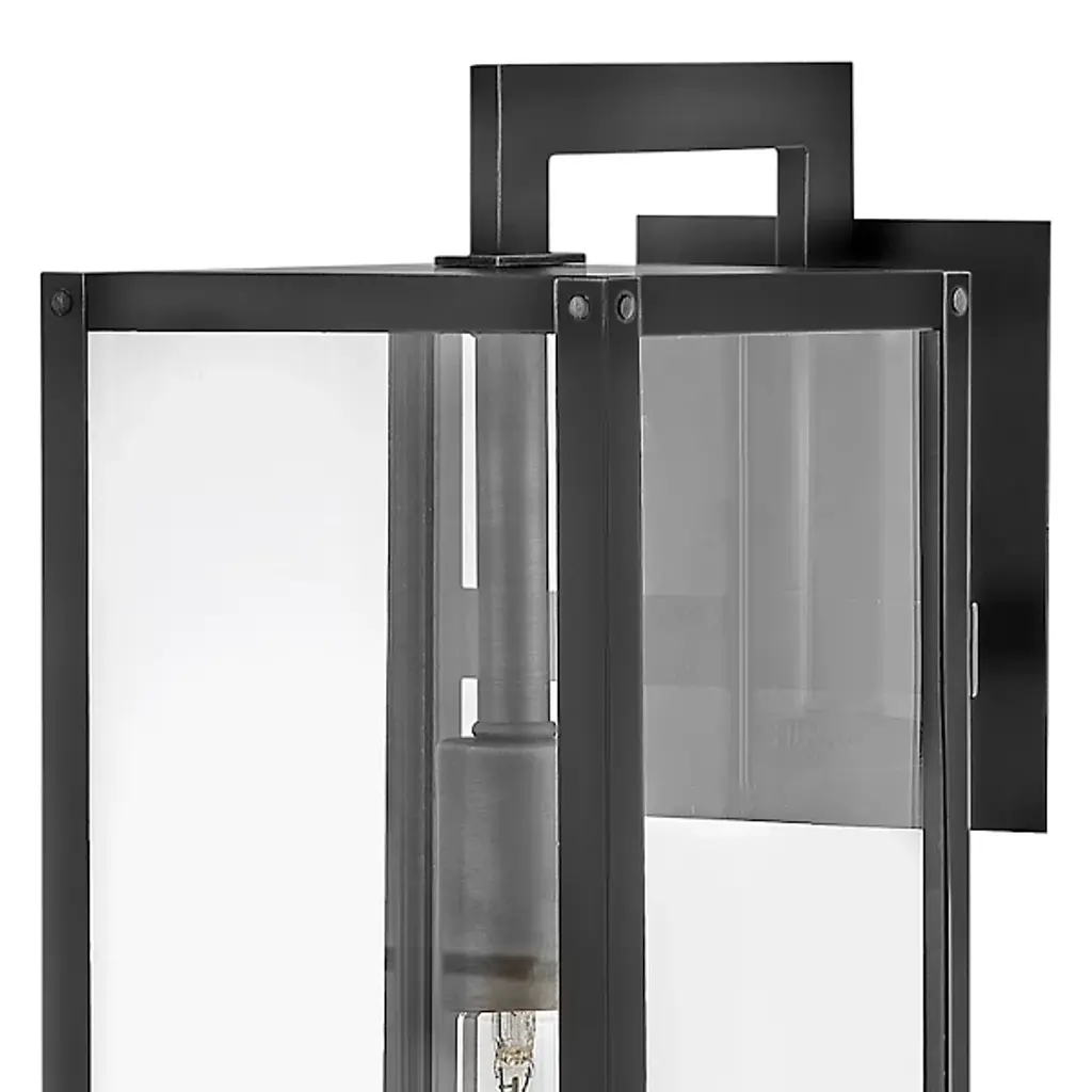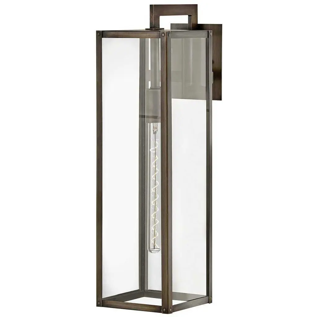 The Max Outdoor Wall Sconce from Hinkley features a hand-welded aluminum construction with angular geometry, ideal for exterior illumination. An arm extends from a square wall mount to support a rectangular shade housing a downward-facing socket. Clear glass panes screen the damp-rated lamping, reducing direct glare while maintaining output for pathways and entryways. The welded assembly ensures structural integrity, while the straightforward metal-edged design focuses on functional performance. The rectangular shade directs light downward for architectural features or walkways requiring durable exterior lighting in residential or commercial settings.