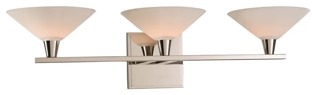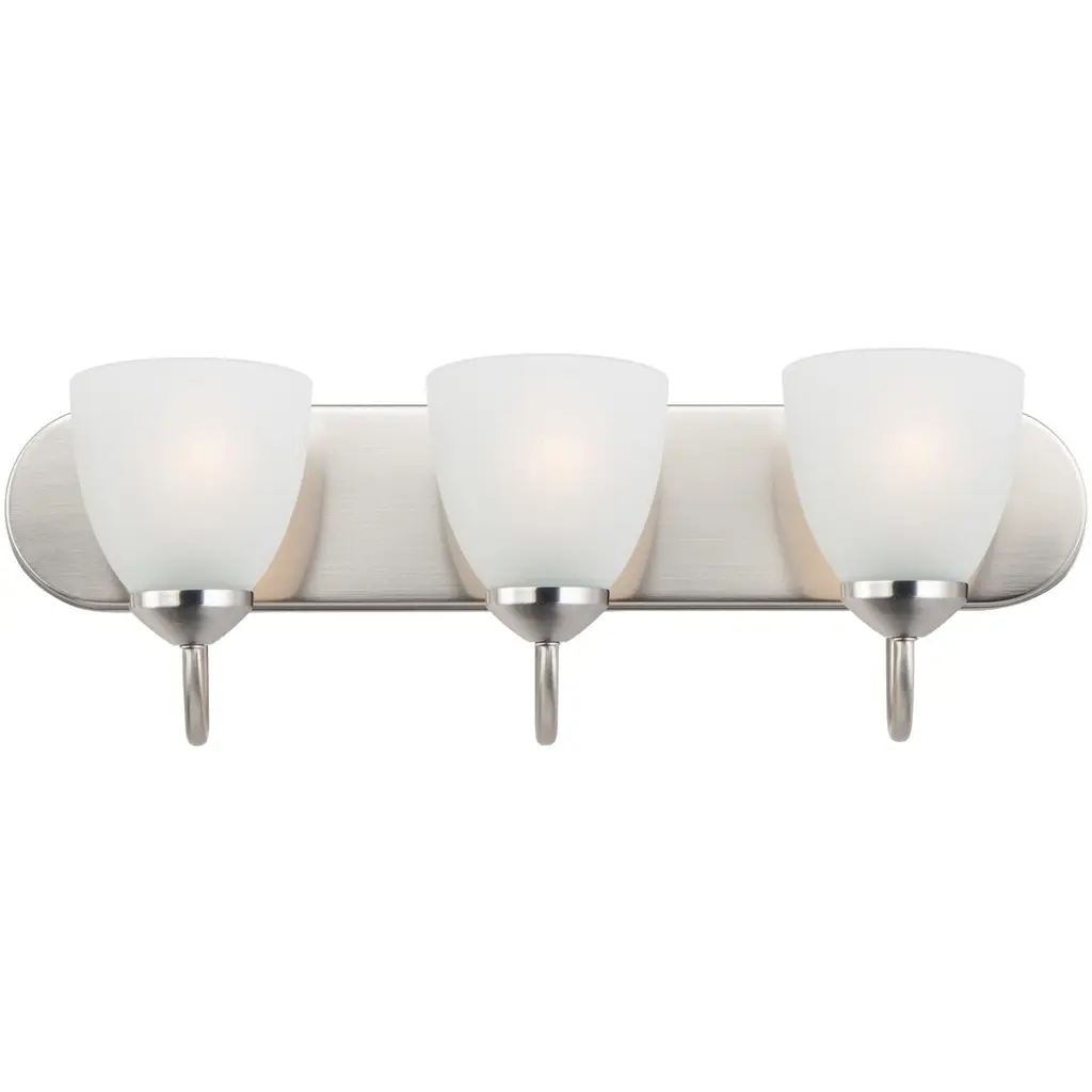 Straight lines and curves make this contemporary series a classic. Square metal tubing finished in your choice of Oil Rubbed Bronze or Satin Nickel support tapered square Frosted glass shades. Back Plate Height: 4.75 Back Plate Width: 6.50 Dimmable: Yes Shade Included: Yes Material: Glass, Finish Color: Satin Nickel, Width: 21.5", Height: 7", Length: 8.5", Depth: 8.5", Height From Outlet Box: 2.75", Backplate Width: 6.5", Backplate Length: 4.75", Lamping Type: Incandescent, Number Of Bulbs: 3, Wattage: 60 Watts, Dimmable: Yes, Moisture Rating: Damp Rated