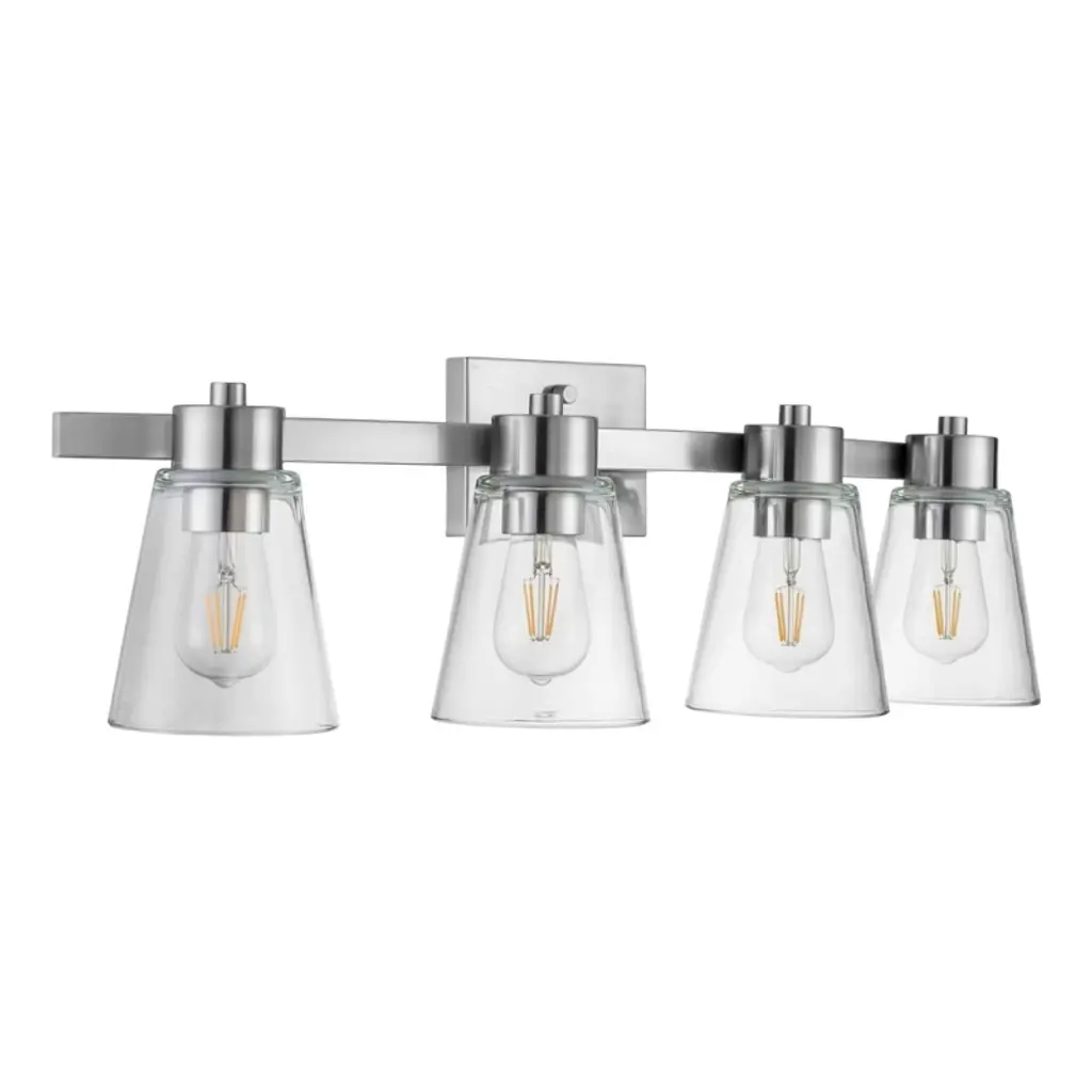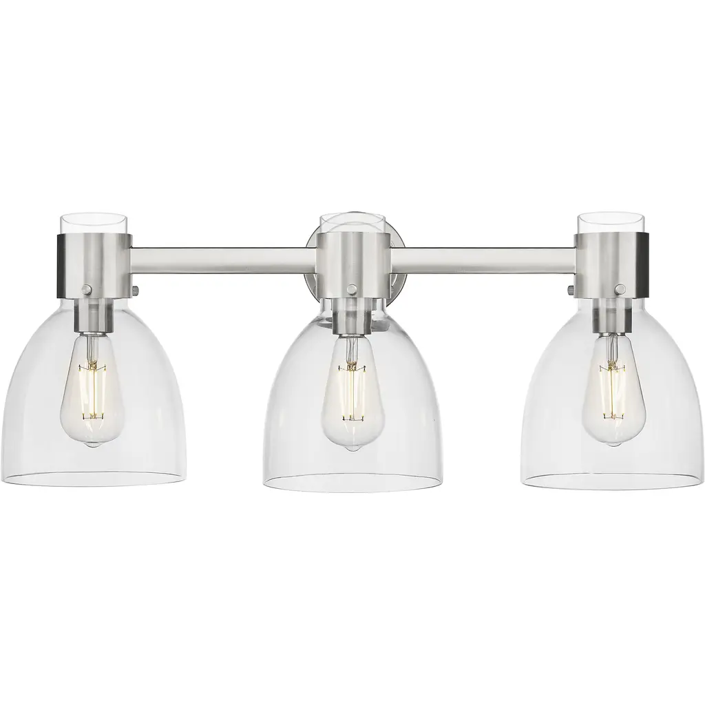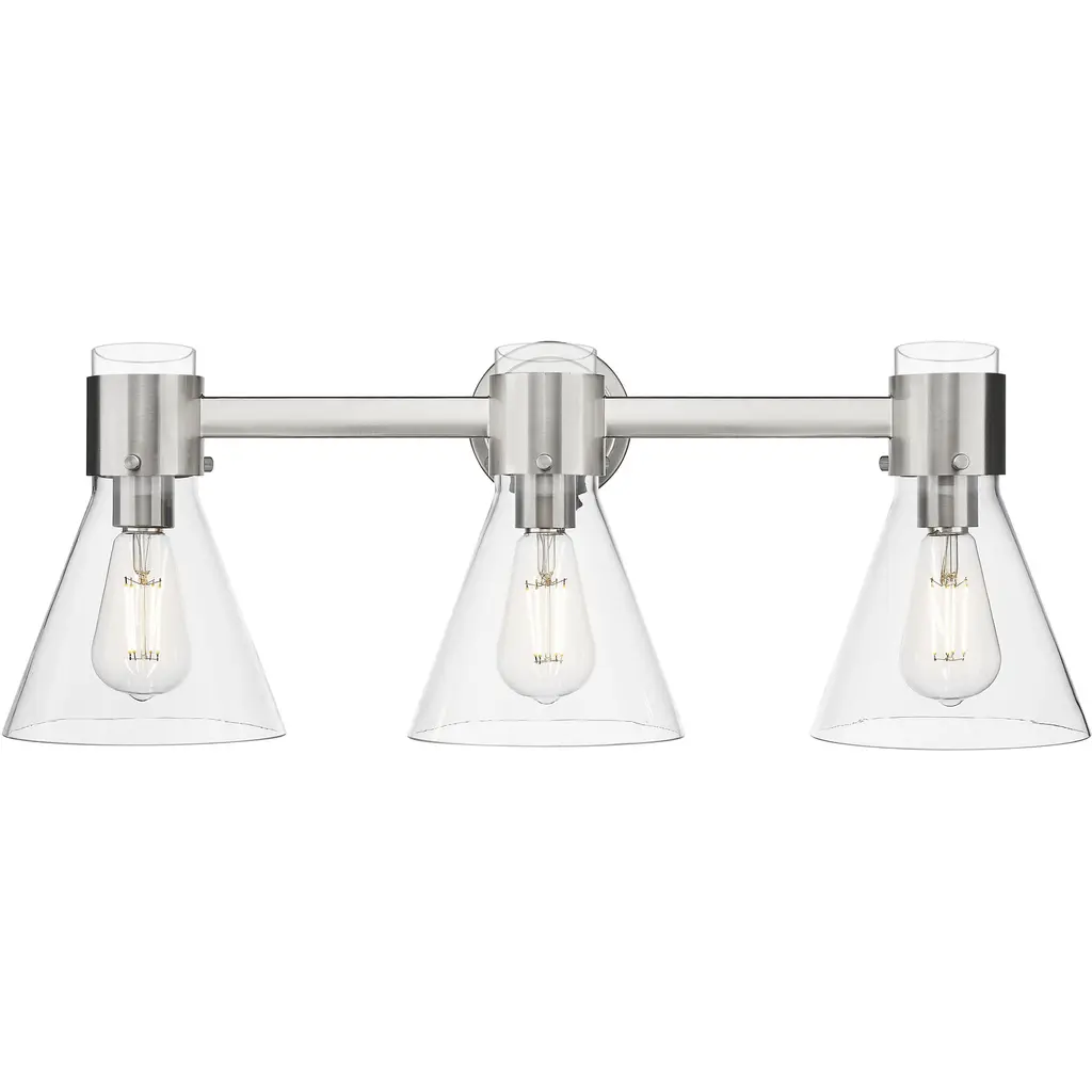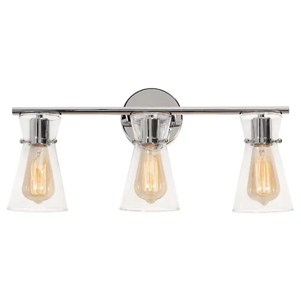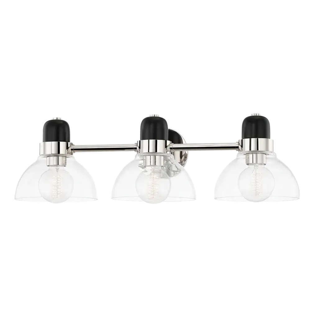 Suspended by three pin connections, the sharp silhouette of Ava's angular glass provides a designer look to enhance your bathroom design. Using Clear glass and a variety of complementary metal finishes the sconces are available in Black, Polished Chrome, or Natural Aged Brass allowing it to pair well with most interior color palettes.