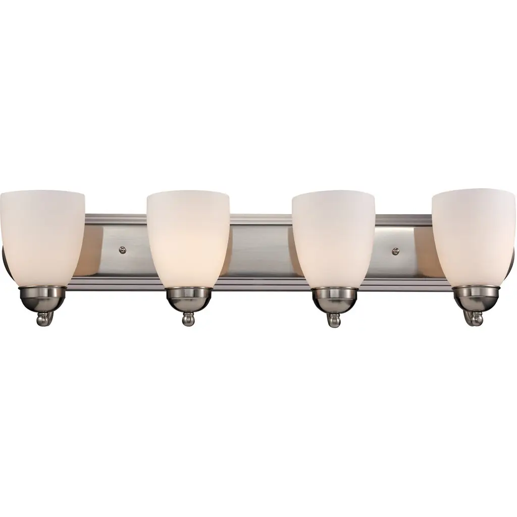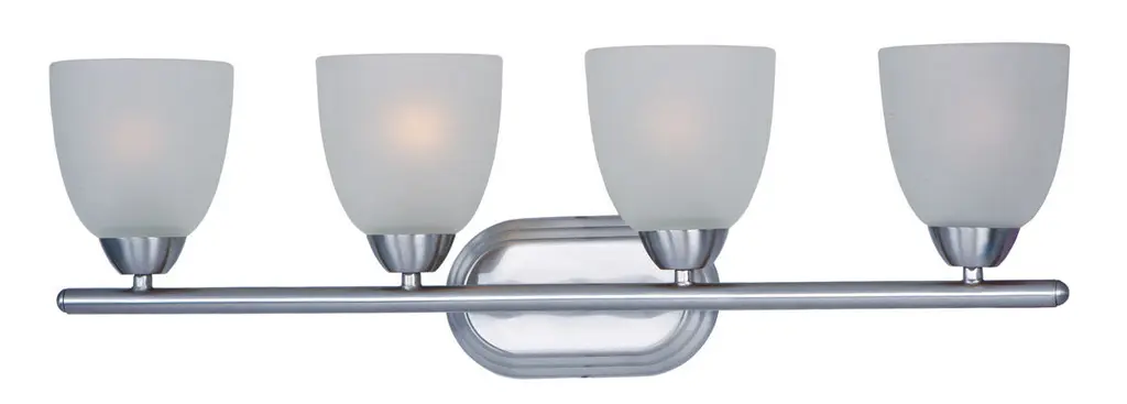 This transitional design works in any style home. Intersecting, rectangular tubing finished in your choice of Satin Nickel or Oil Rubbed Bronze gently curves to support simple line Frost glass shades. Mounting Direction: Up/Down Back Plate Height: 5.00 Back Plate Width: 48.00 Dimmable: Yes Shade Included: Yes Shade Dimensions: 4.75 Material: Glass, Finish Color: Satin Nickel, Width: 48", Height: 7.5", Length: 8.5", Depth: 8.5", Height From Outlet Box: 3", Backplate Width: 48", Backplate Length: 5", Lamping Type: Incandescent, Number Of Bulbs: 6, Wattage: 60 Watts, Dimmable: Yes, Moisture Rating: Damp Rated