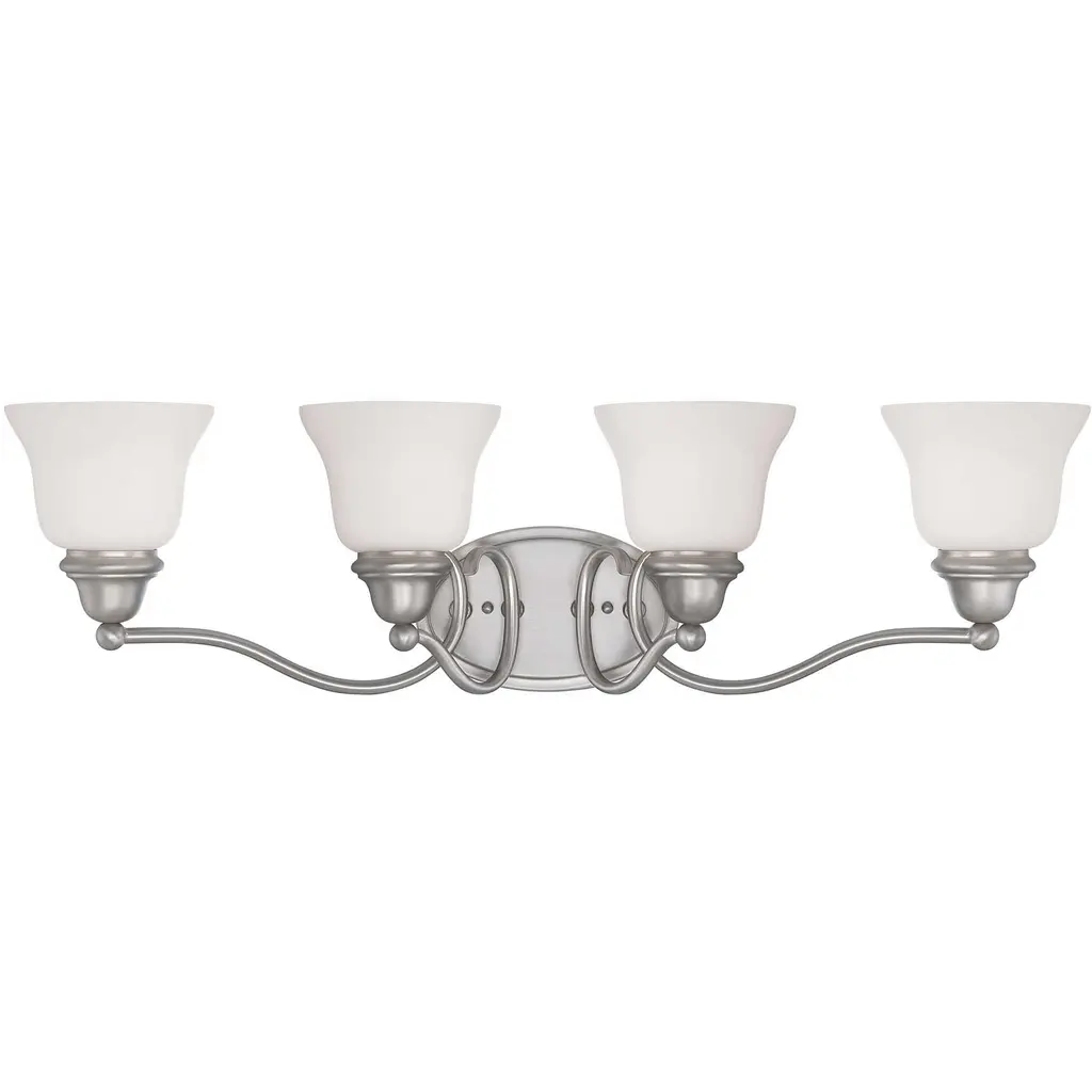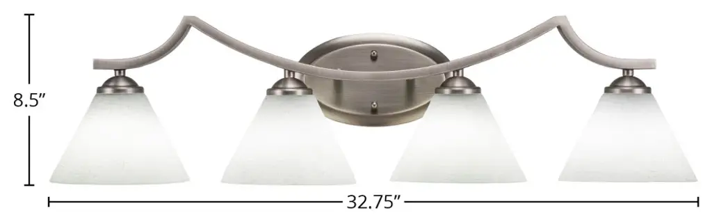 Contemporary collection with sweeping arms and clean lines. Offered in Ice glass and Satin Nickel finish or Wilshire glass and Oil Rubbed Bronze finish. Back Plate Height: 5.25 Back Plate Width: 5.25 Dimmable: Yes Shade Included: Yes Material: Steel, Finish Color: Satin Nickel, Width: 27.5", Height: 8", Length: 9", Depth: 9", Height From Outlet Box: 2.62", Backplate Width: 5.25", Backplate Length: 5.25", Lamping Type: Incandescent, Number Of Bulbs: 4, Wattage: 60 Watts, Dimmable: Yes, Moisture Rating: Damp Rated