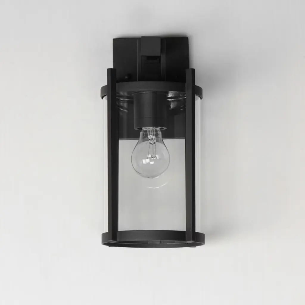 Squared columns in Matte Black finish tower above the cylindrical glass shade rated for outdoor applications. A rectangular hook detail carries the square form through to the backplate. A modern interpretation of a bell tower, these outdoor pendants and sconces are a cleaned up, transitional look for exteriors. Material: Aluminum, Finish Color: Black, Width: 7", Height: 13", Depth: 7", Height From Outlet Box: 2.5", Backplate Width: 4.75", Backplate Length: 6.25", Lamping Type: Incandescent, Number Of Bulbs: 1, Wattage: 60 Watts, Dimmable: Yes, Moisture Rating: Wet Rated