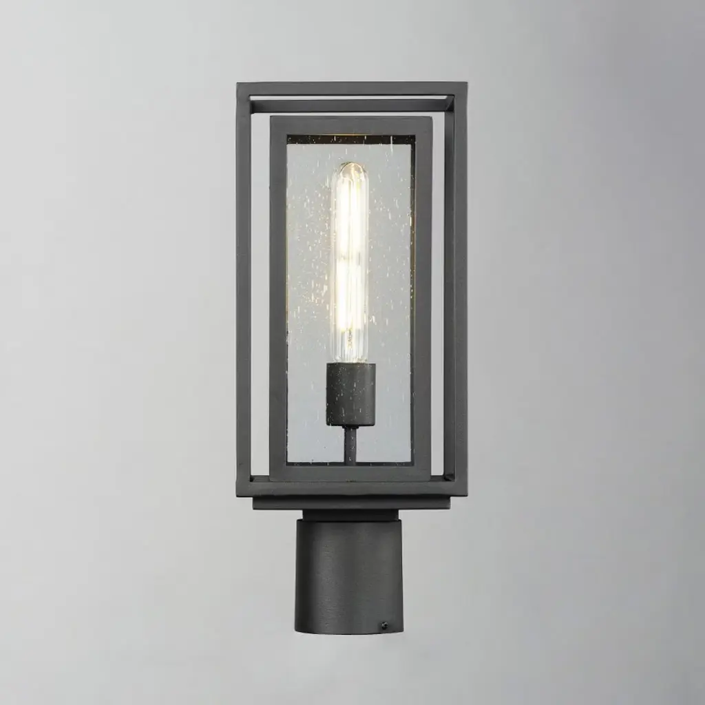 A dual framed structure creates dimension on these outdoor lighting fixtures that is both contemporary and transitional. The construction consists of two frames of square tubing and squared components. The inner frame's Clear Seedy glass reduces glare from the light and appears dirt-free for longer periods. This is a comprehensive collection to brighten all areas of your outdoor space, available in various sized sconces as well as hanging and post configurations.