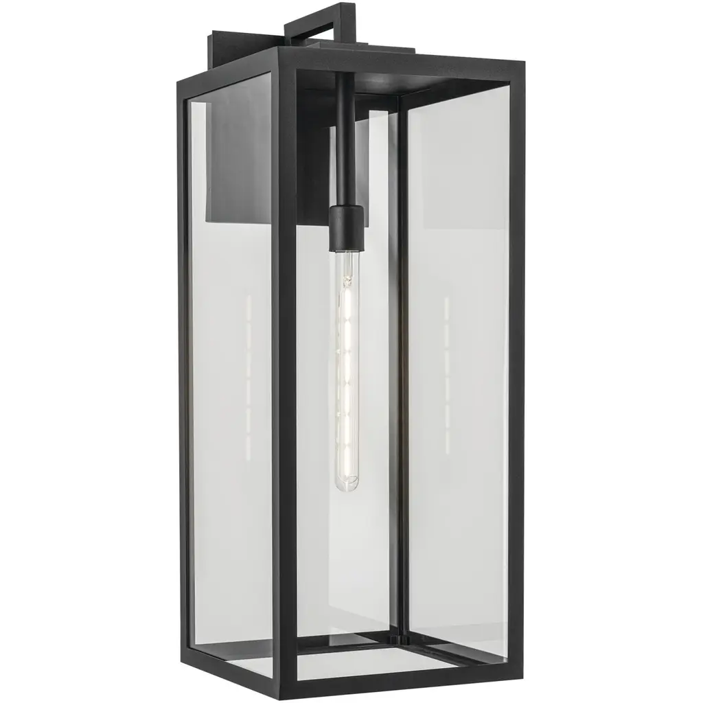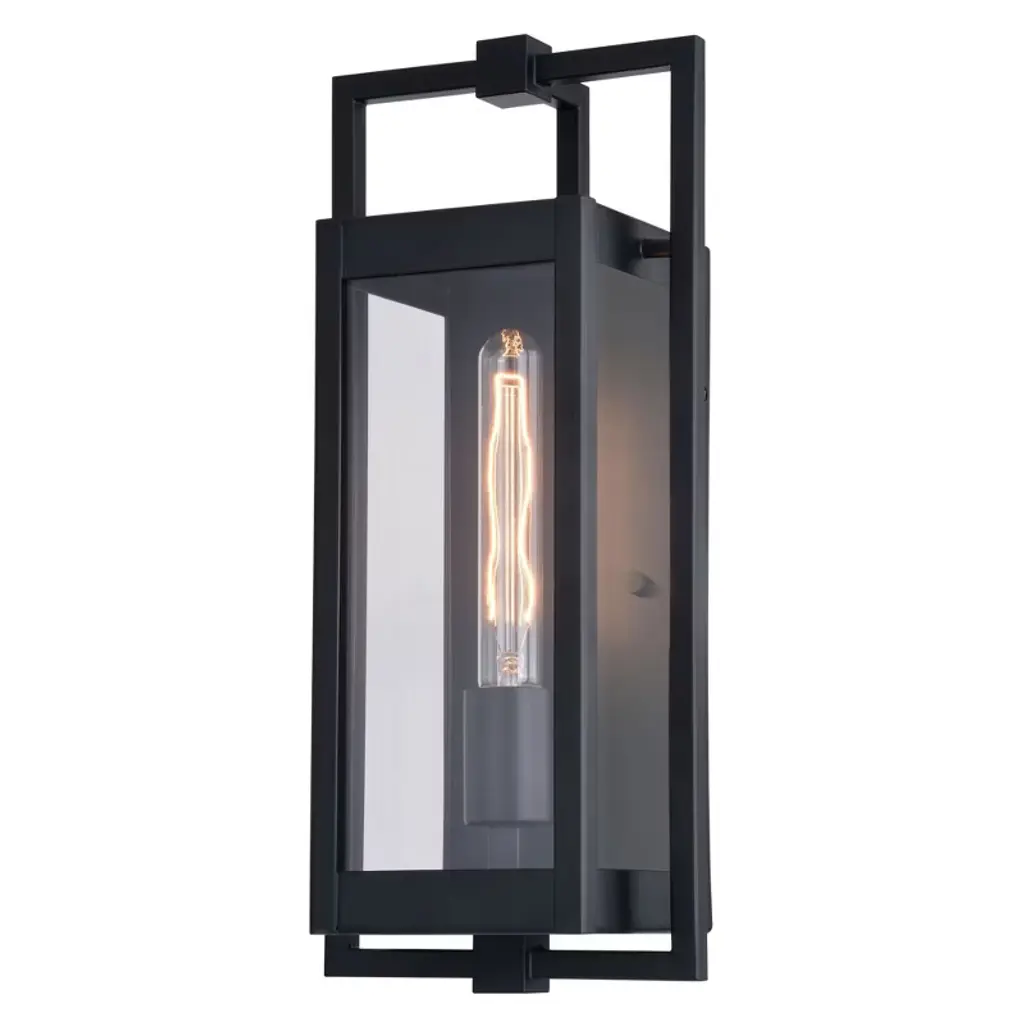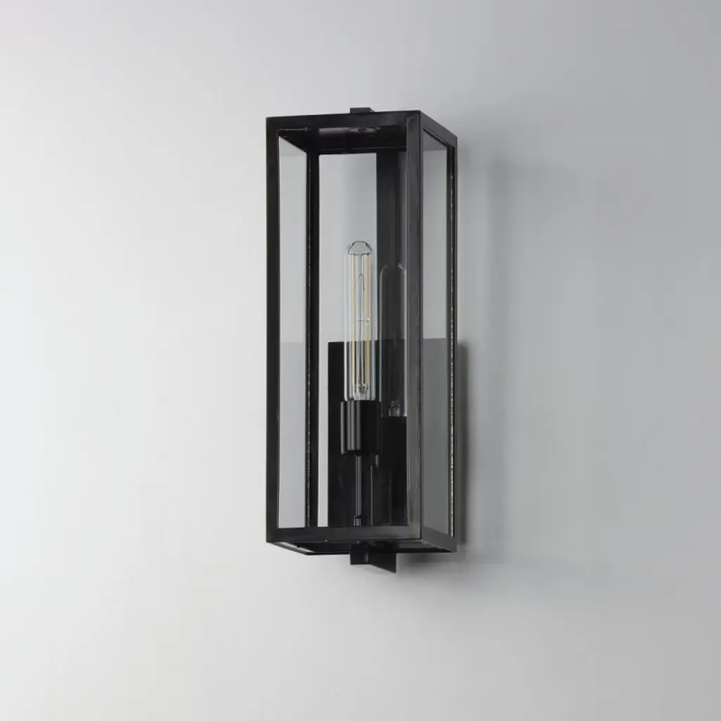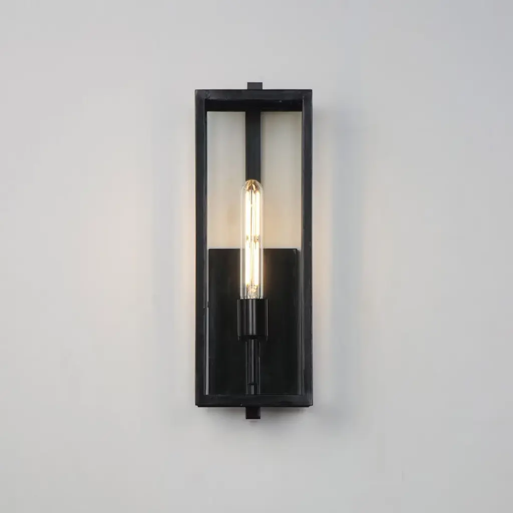 An elongated rectangular shaped design that is both minimalist and industrial. Die cast frames of Dark Bronze support Clear glass panels that provide an unobstructed view of the lantern's interior. Customize with your choice of lamps from vintage to tubular. Material: Aluminum, Finish Color: Dark Bronze, Width: 6", Height: 17.5", Depth: 7.5", Height From Outlet Box: 11.25", Backplate Width: 4.75", Backplate Length: 8", Lamping Type: Incandescent, Number Of Bulbs: 1, Wattage: 60 Watts, Moisture Rating: Wet Rated