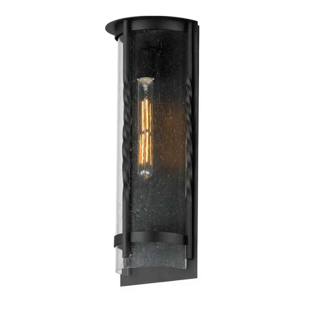Forged iron spindles twist along the frame of a half round sconce. Transitional in design, they are finished in a Neutral Black outdoor rated powder coat and feature Clear Seeded glass. Use tubular lamps to accentuate the height of the sconces. Material: Steel, Finish Color: Black, Width: 8", Height: 16", Depth: 5.25", Height From Outlet Box: 2", Backplate Width: 6.75", Backplate Length: 15.5", Lamping Type: Incandescent, Number Of Bulbs: 1, Wattage: 60 Watts, Dimmable: Yes, Moisture Rating: Wet Rated