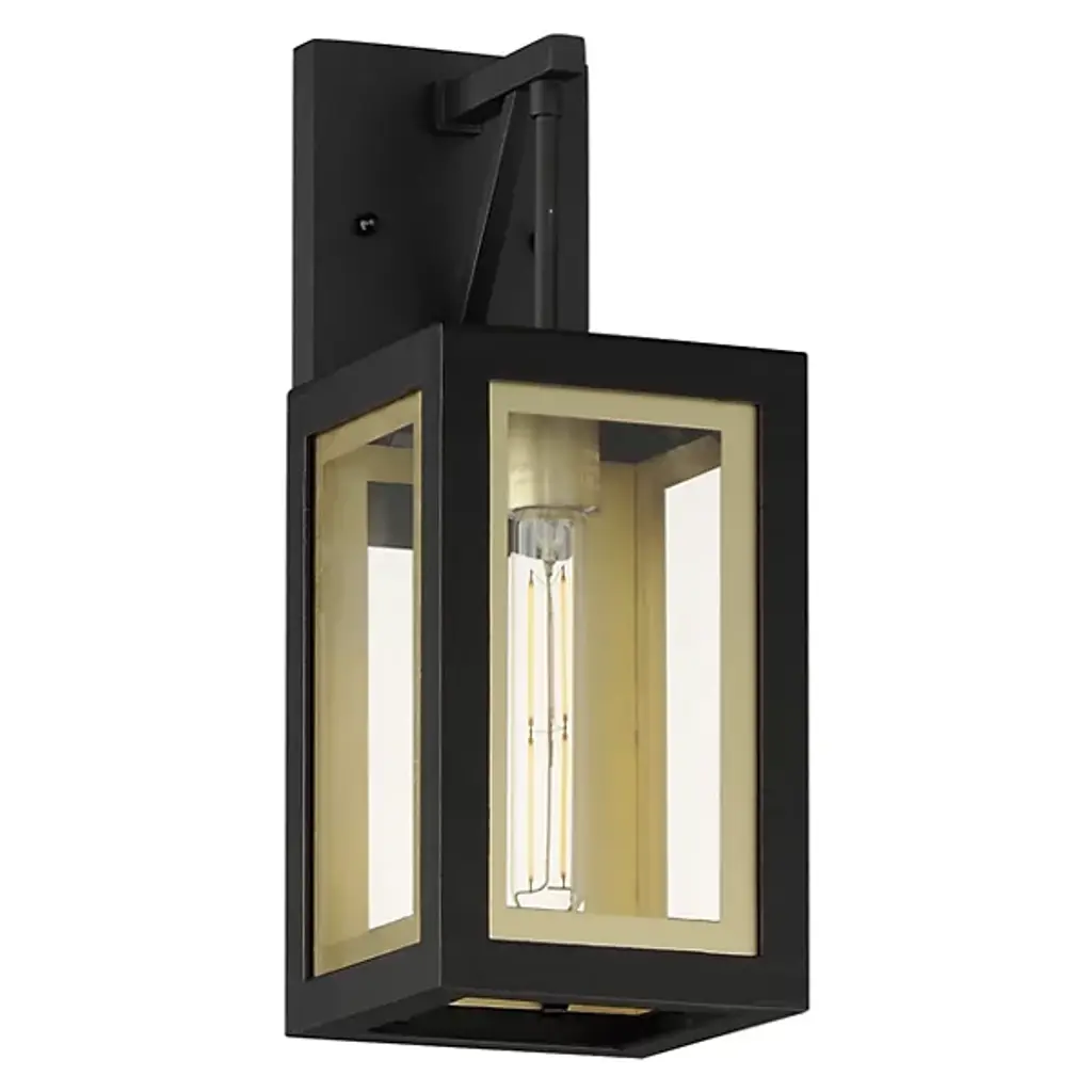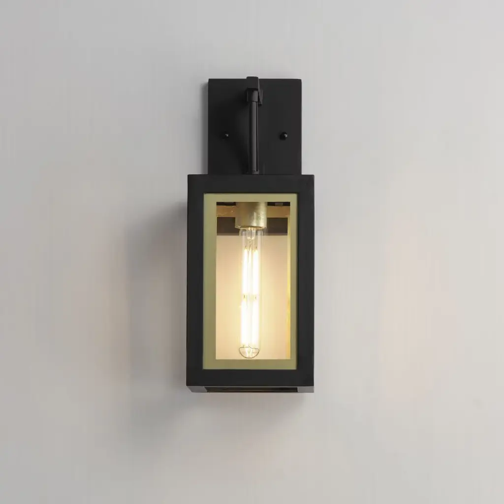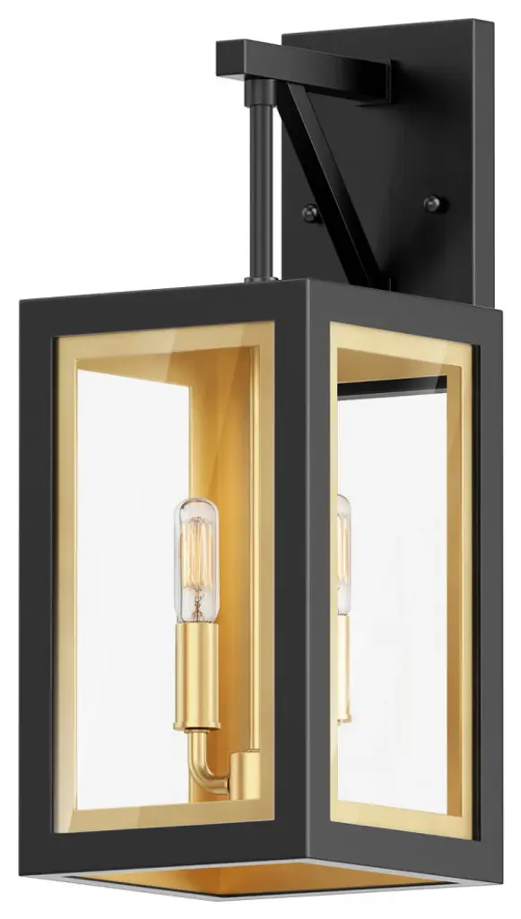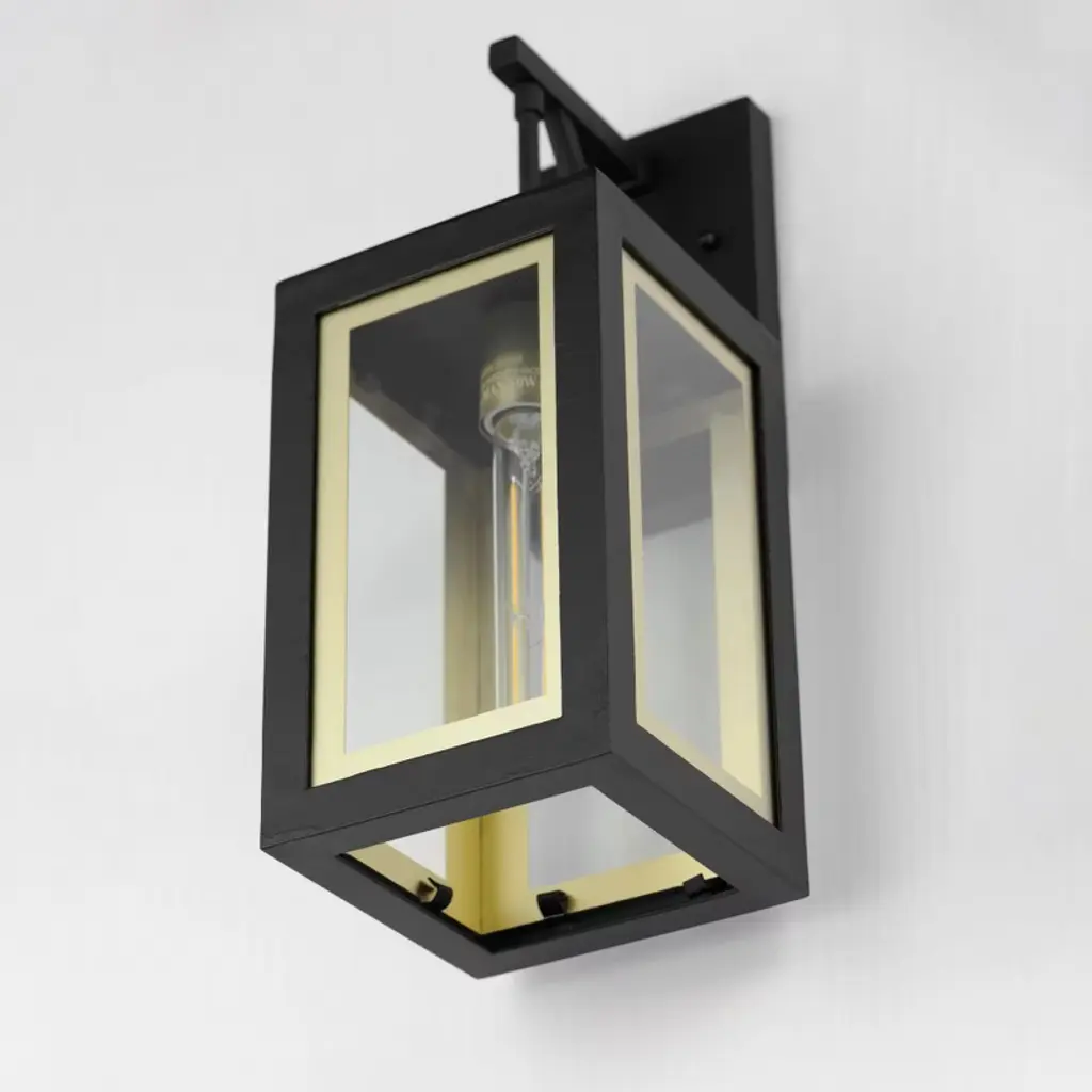 Two tone frames of Black or White with internal Gold frames provides a neoclassical approach to the squared coach lantern. The sconces jut out from the wall on well-defined trusses that add a contemporary element. Delivering classic design that suits most exteriors, this collection adds interest in the interior contrasting frame of Gold that secures clear glass panes to diffuse the lamp within.