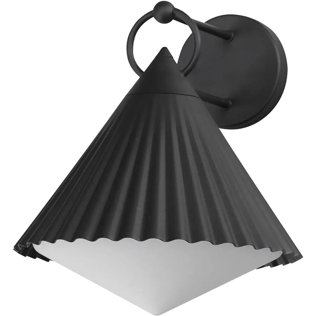 Adding charm to the outdoors, the Odette series features a scalloped pyramid shade suspended from a ring of Die Cast Aluminum. Supported within the shade is an inverse pyramid that peaks out beneath the hem of the aluminum shade marrying the two pyramid forms. Graceful and playful, these outdoor sconces add the designer touch to both indoor and outdoor locations.