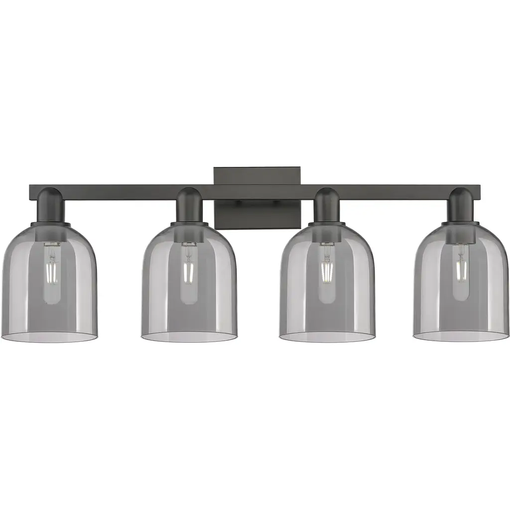 Undulating metalwork curves around modern bell-shaped glass shades fitted within the frame of these bath vanity sconces. Available in either Clear or Marble glass and complimentary finishes of Polished Chrome, Matte Black, or Natural Aged Brass. This collection is a delightful addition to your next project. Material: Steel, Finish Color: Black, Width: 29.5", Height: 8", Depth: 7", Height From Outlet Box: 2.5", Backplate Width: 5", Backplate Length: 5", Lamping Type: Incandescent, Number Of Bulbs: 4, Wattage: 60 Watts, Dimmable: Yes, Moisture Rating: Damp Rated
