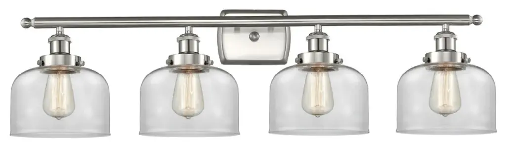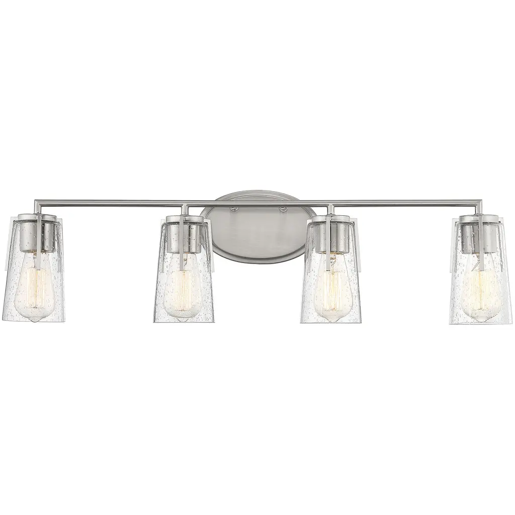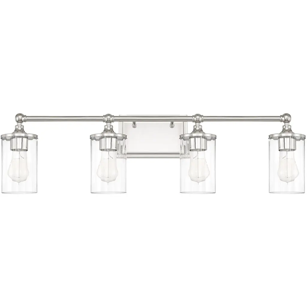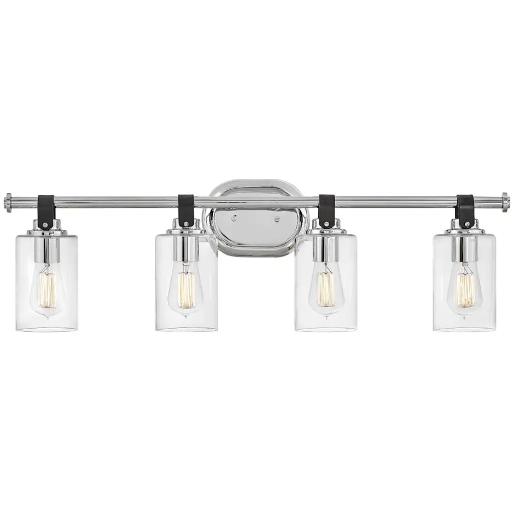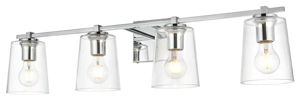 Undulating metalwork curves around modern bell-shaped glass shades fitted within the frame of these bath vanity sconces. Available in either Clear or Marble glass and complimentary finishes of Polished Chrome, Matte Black, or Natural Aged Brass. This collection is a delightful addition to your next project. Material: Steel, Finish Color: Polished Chrome, Width: 29.5", Height: 8", Depth: 7", Height From Outlet Box: 2.5", Backplate Width: 5", Backplate Length: 5", Lamping Type: Incandescent, Number Of Bulbs: 4, Wattage: 60 Watts, Dimmable: Yes, Moisture Rating: Damp Rated
