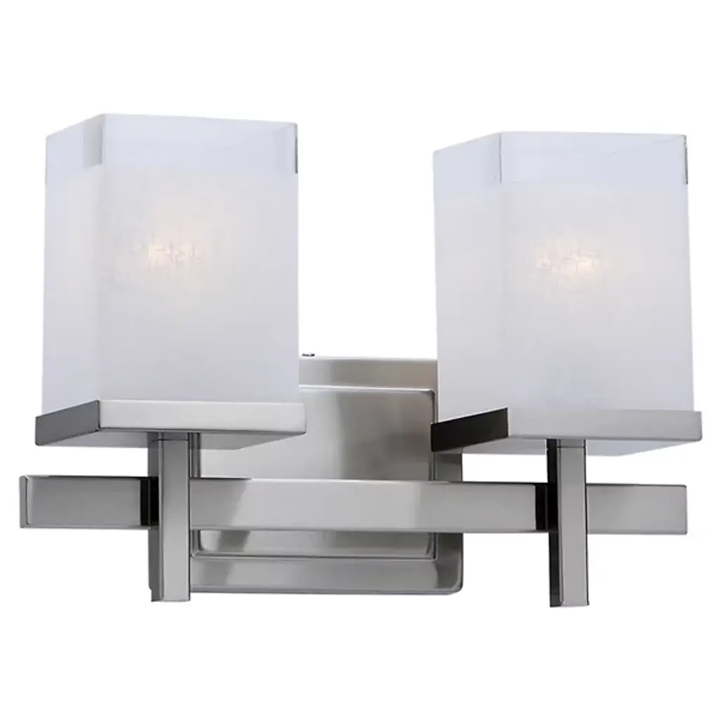 Square glass shades ride upon a rectangular bar to create geometry at its best. Available in Polished Chrome with Satin White glass and Satin Nickel and white Linen glass. Back Plate Height: 4.75 Back Plate Width: 6.50 Dimmable: Yes Shade Dimensions: 6.00 Material: Glass, Finish Color: Polished Chrome, Width: 14", Height: 9", Length: 6", Depth: 6", Height From Outlet Box: 6.25", Backplate Width: 6.5", Backplate Length: 4.75", Lamping Type: Incandescent, Number Of Bulbs: 2, Wattage: 60 Watts, Dimmable: Yes, Moisture Rating: Damp Rated