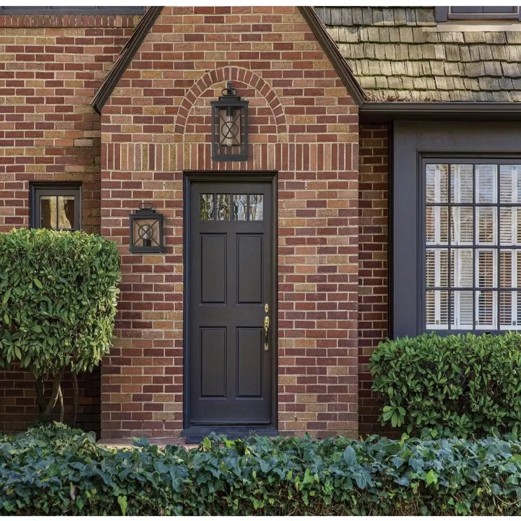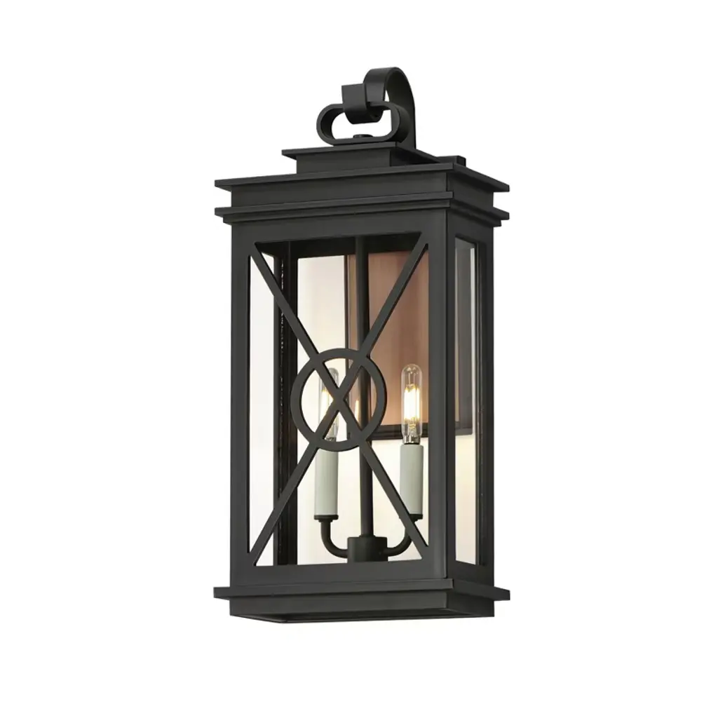 Styled as a classic early American coach lantern, the Yorktown sconces offer an established exterior design aesthetic with the modern engineering to withstand the harshest climates. A crossing pattern of the material wraps clear glass panes that protects them and adds visual interest. Featured prominently on the back plate of these lanterns is a stainless-steel overlay in Antique Copper that evokes the historical reference embodied in the design and attractive contrast to the fixtures rated for wet locations.