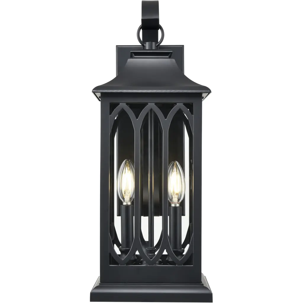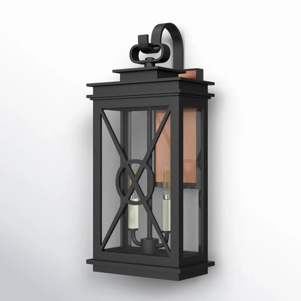 Styled as a classic early American coach lantern, the Yorktown sconces offer an established exterior design aesthetic with the modern engineering to withstand the harshest climates. A crossing pattern of the material wraps clear glass panes that protects them and adds visual interest. Featured prominently on the back plate of these lanterns is a stainless-steel overlay in Antique Copper that evokes the historical reference embodied in the design and attractive contrast to the fixtures rated for wet locations.