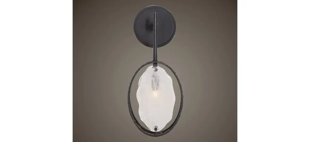 Ring of dark hammered bronze finished metal with a subtle golden interior. Inspired from mid century modern design, the ring holds two handmade artisan inspired clear and white swirl glass ovals.
