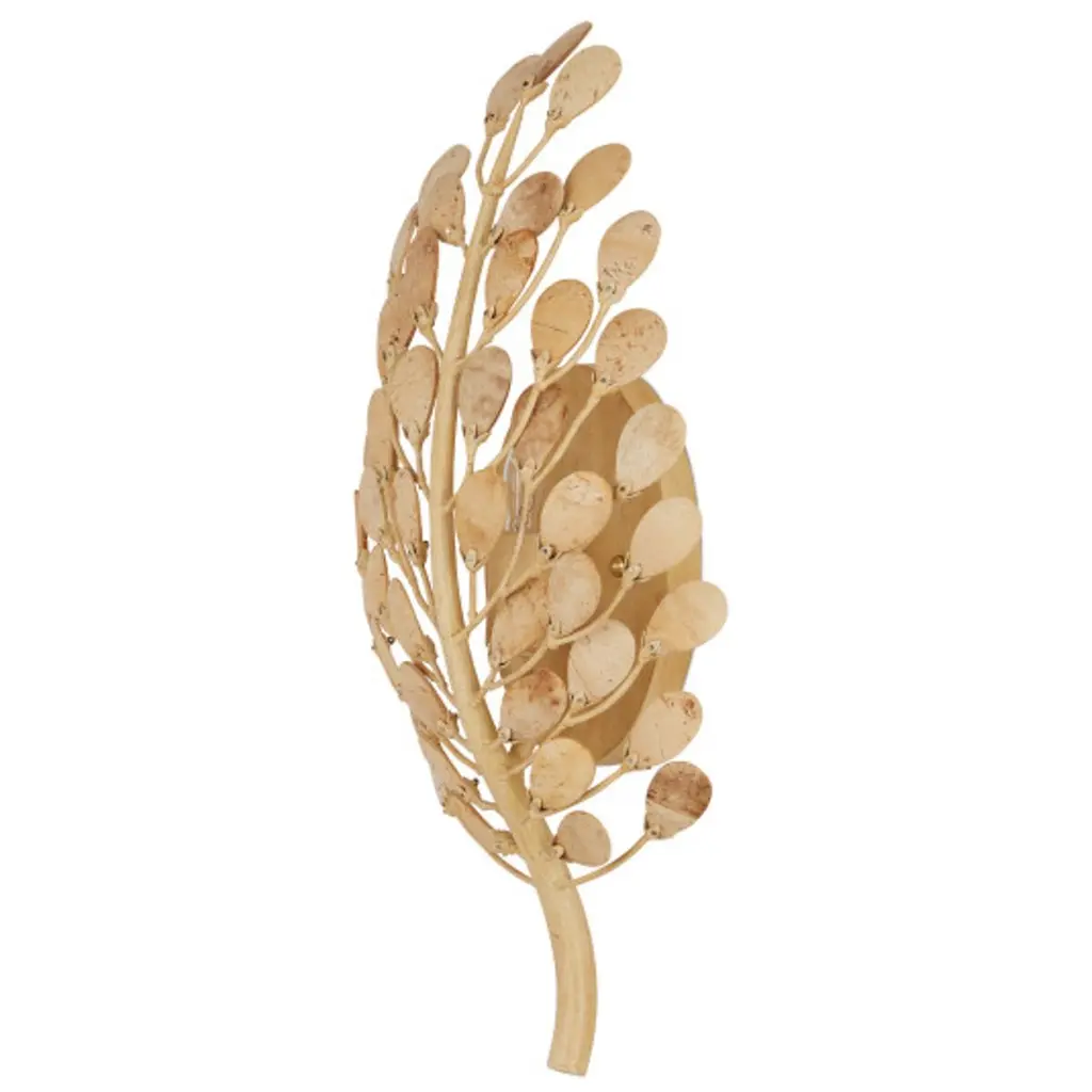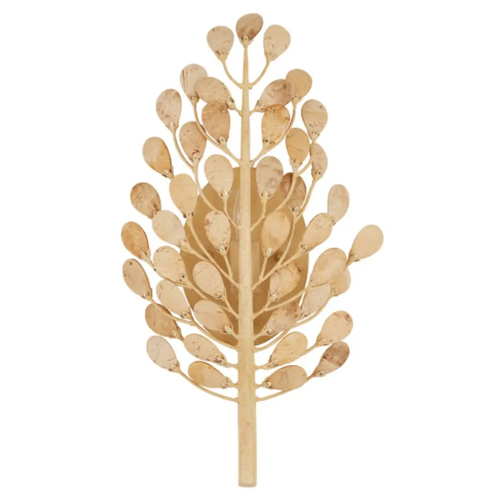 The Maypan Wall Sconce brings a graceful, organic presence to an interior. Inspired by the fronds of the palm tree it’s named after, the sconce features flowing, upward limbs that support petals made from bleached coconut shells. These natural elements are painstakingly hand-fastened with tiny brads to the tree-like wrought iron frame, finished in a soft hue that harmonizes beautifully with the shell tones.